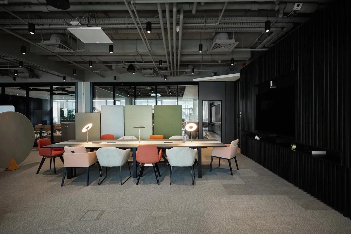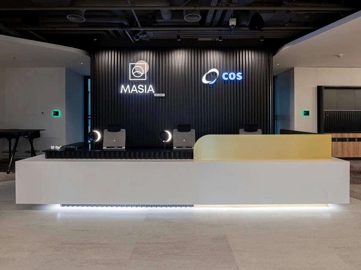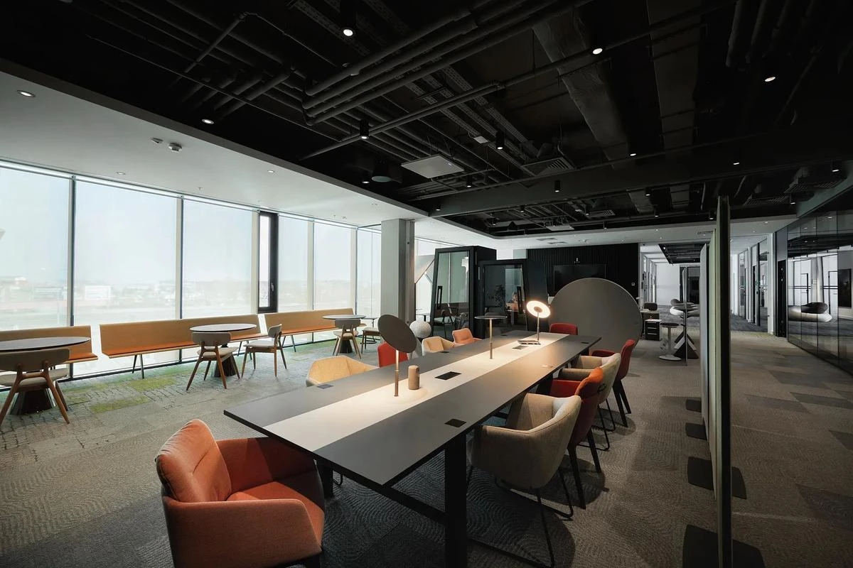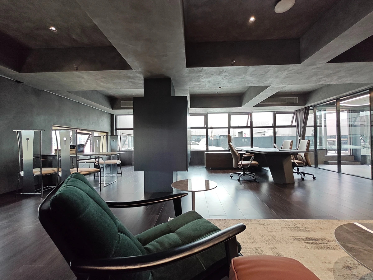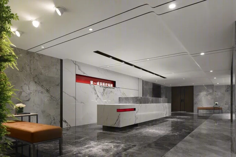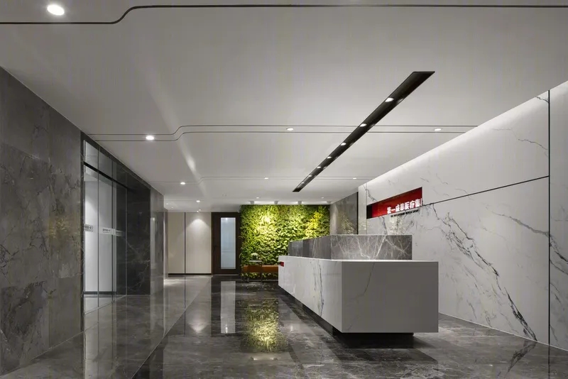 跨入集团,高贵灰色大理石地板、白色调色板与中国红logo的搭配,构成了前台的大气格局。精致的复古设计物品和艺术作品,搭配一抹橙色,为空间注入活力。绿植的点缀,不仅是对自然的致敬,更是空间与艺术审美的完美融合。灯光下的绿色前台,展现出端庄大气的视觉体验,为来访者营造了一个轻松愉悦的交谈环境。