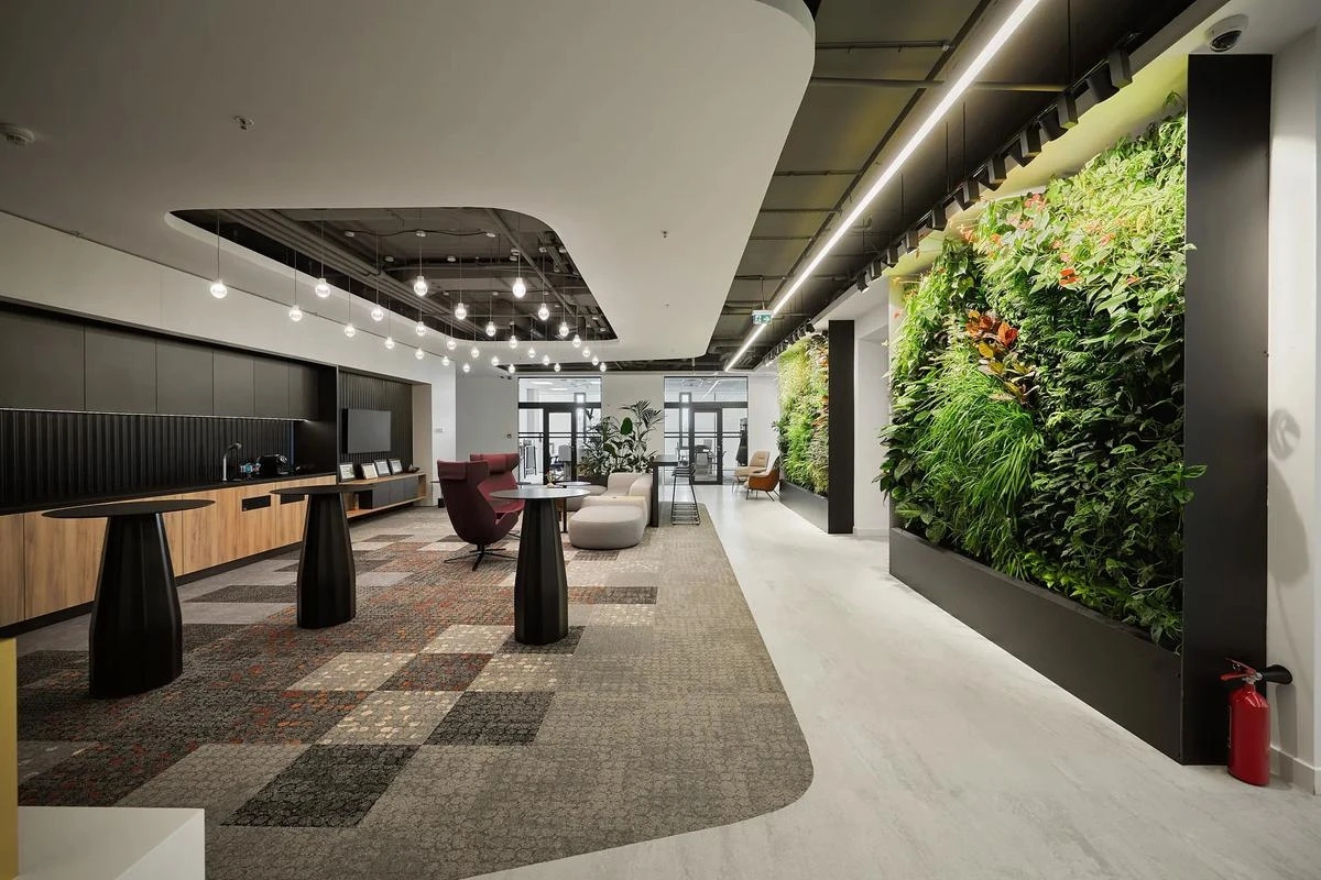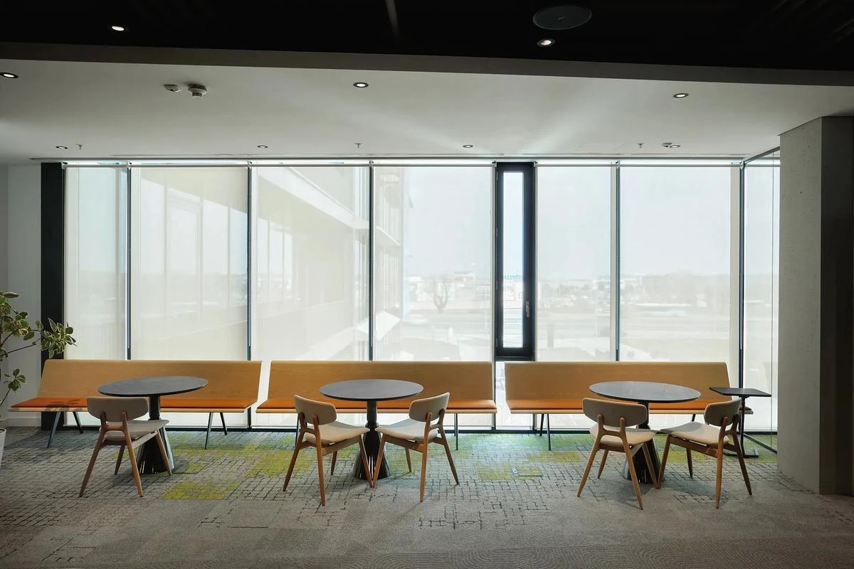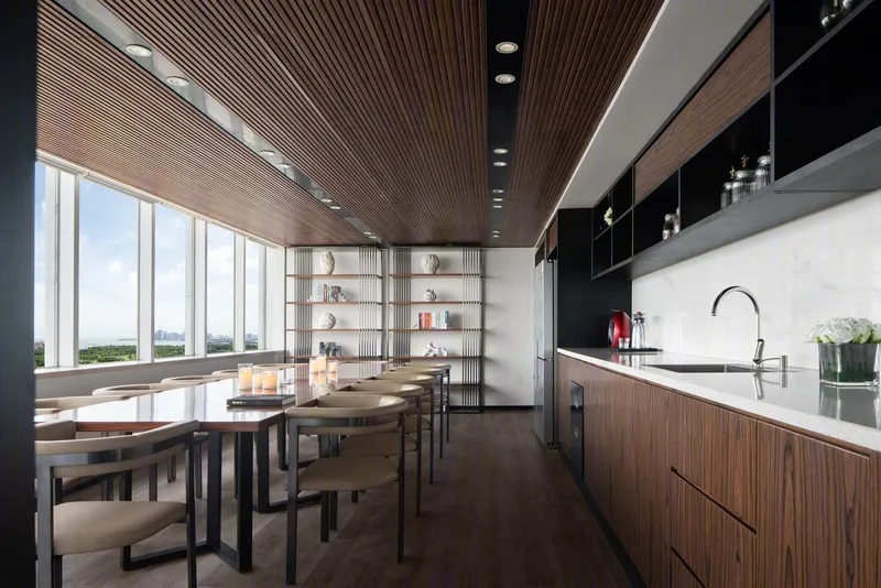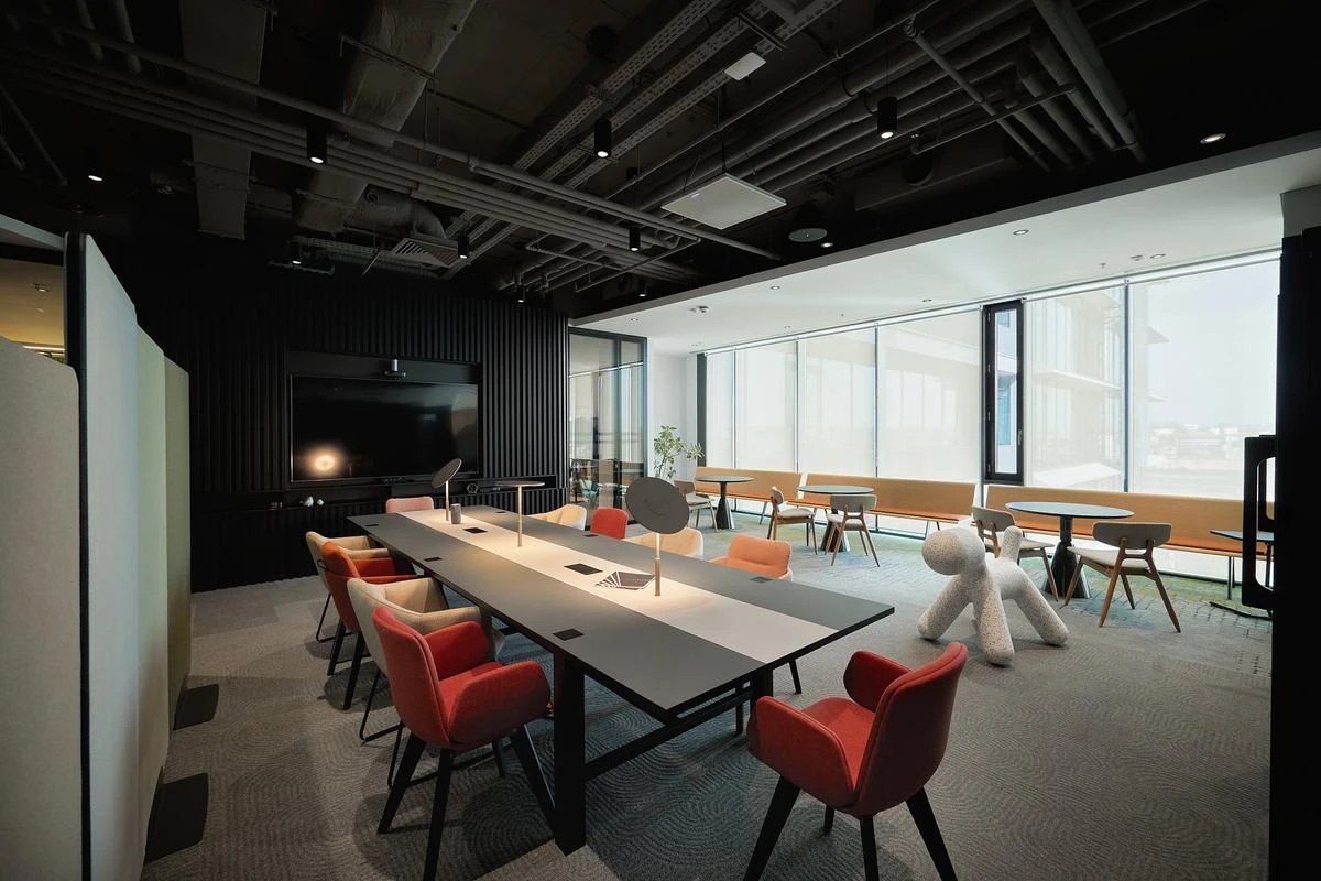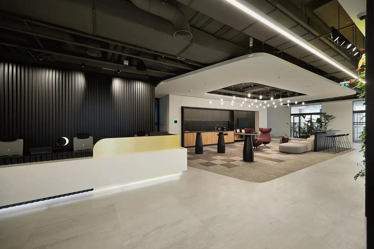 跨入集团,高贵灰色大理石地板、白色调色板与中国红logo的搭配,构成了前台的大气格局。精致的复古设计物品和艺术作品,搭配一抹橙色,为空间注入活力。绿植的点缀,不仅是对自然的致敬,更是空间与艺术审美的完美融合。灯光下的绿色前台,展现出端庄大气的视觉体验,为来访者营造了一个轻松愉悦的交谈环境。