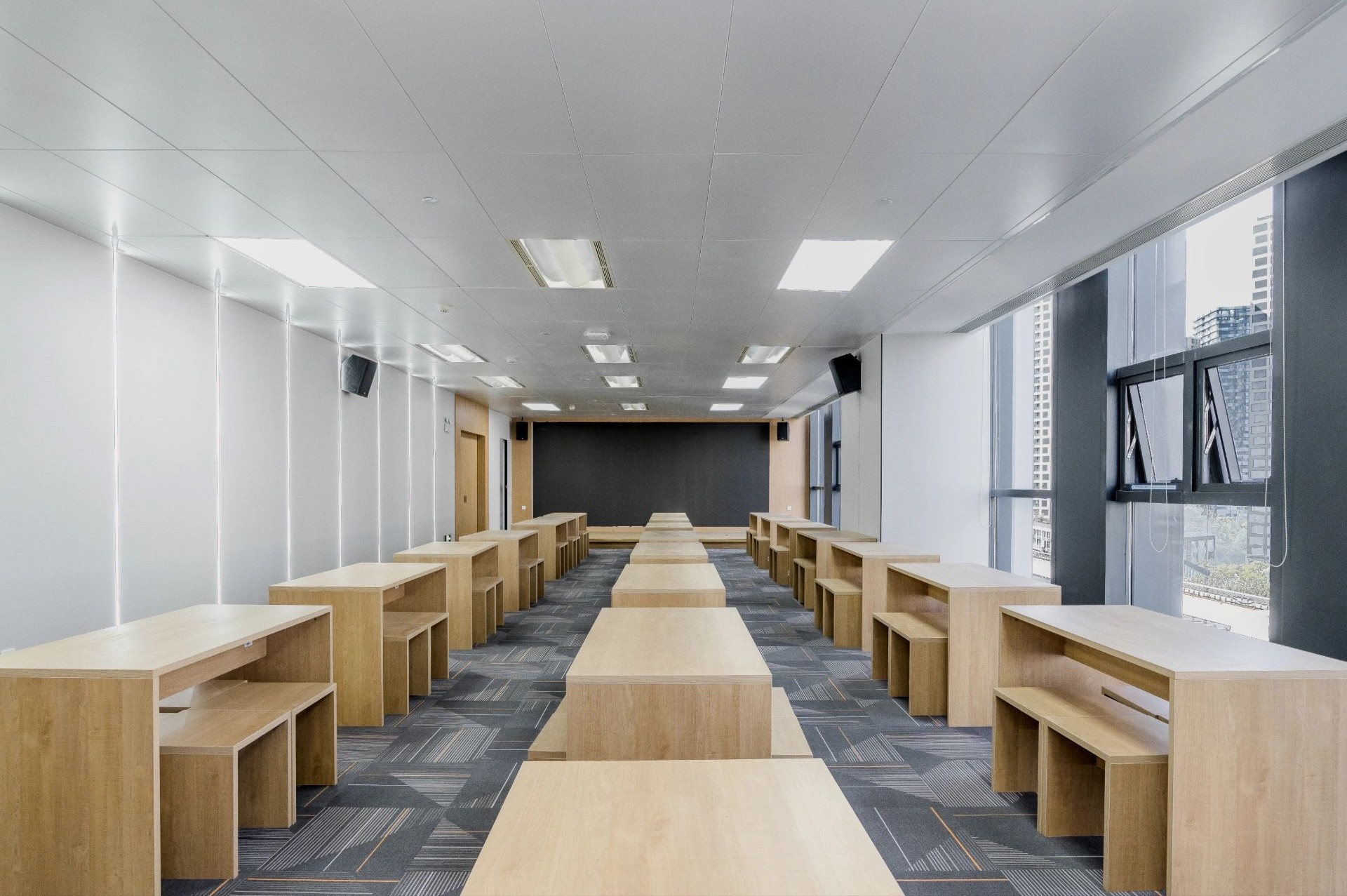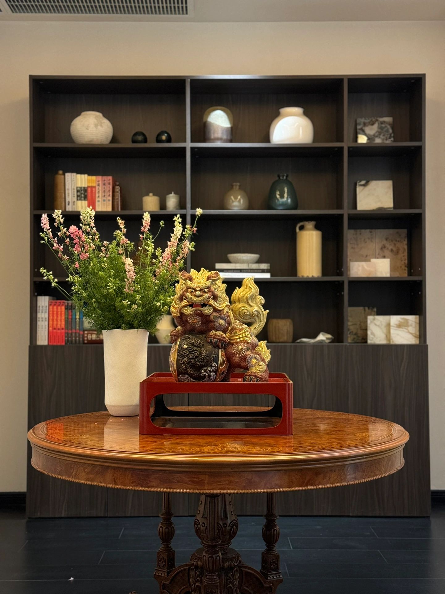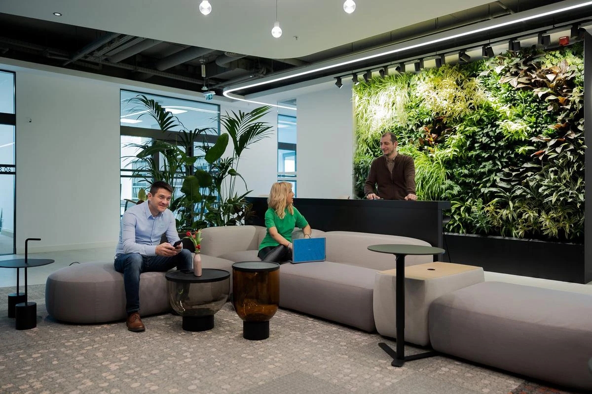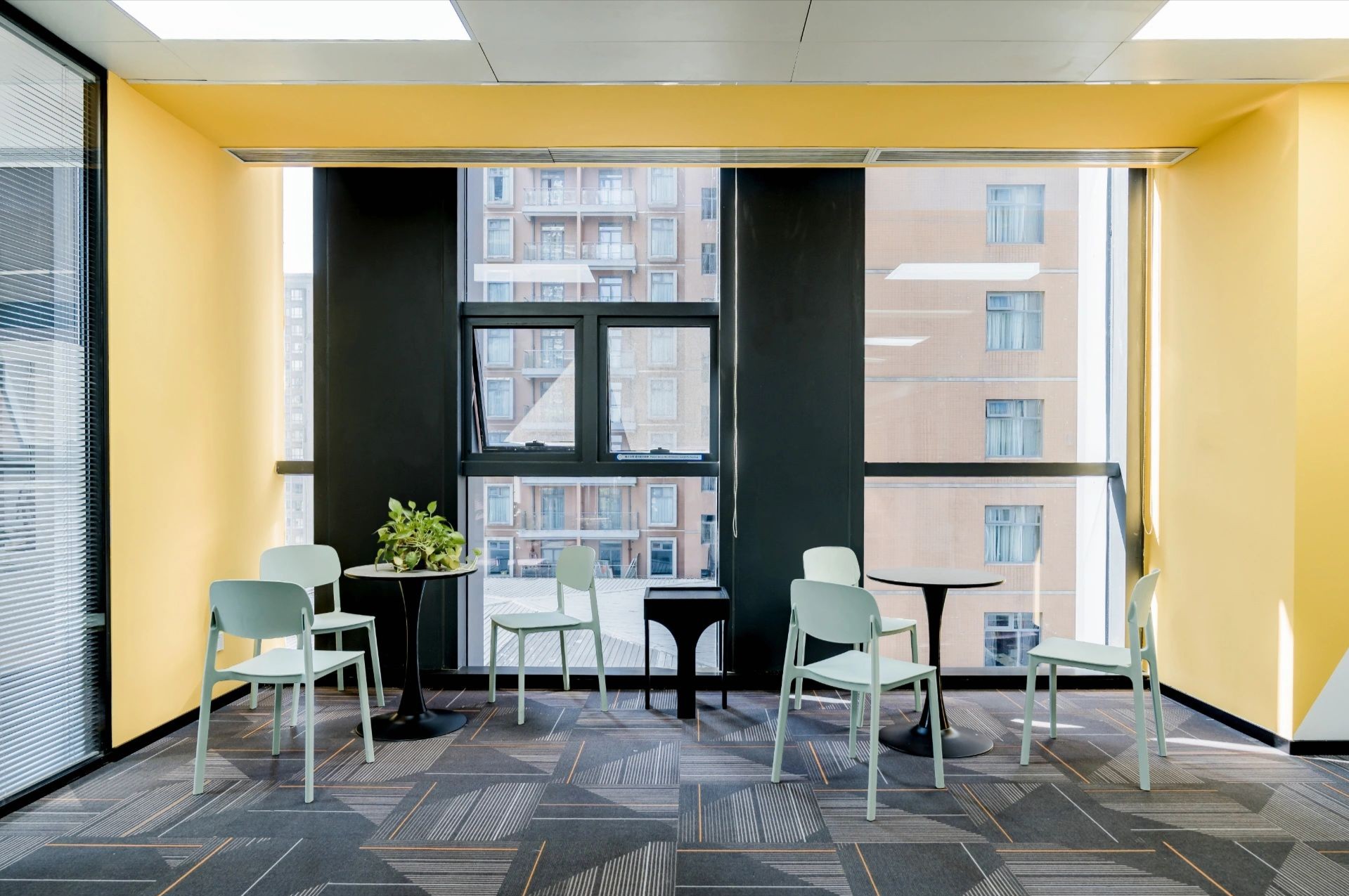 跨入集团,高贵灰色大理石地板、白色调色板与中国红logo的搭配,构成了前台的大气格局。精致的复古设计物品和艺术作品,搭配一抹橙色,为空间注入活力。绿植的点缀,不仅是对自然的致敬,更是空间与艺术审美的完美融合。灯光下的绿色前台,展现出端庄大气的视觉体验,为来访者营造了一个轻松愉悦的交谈环境。