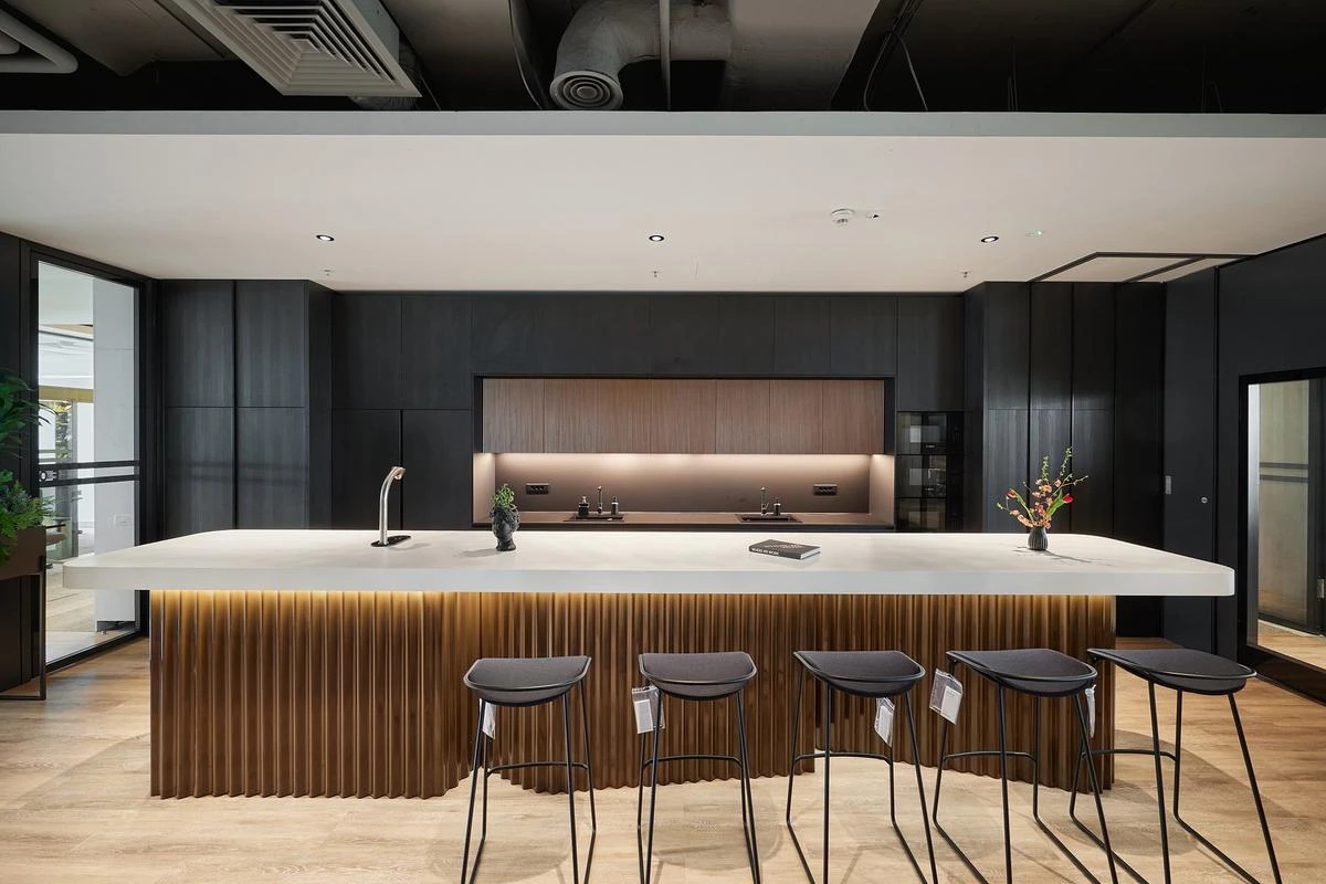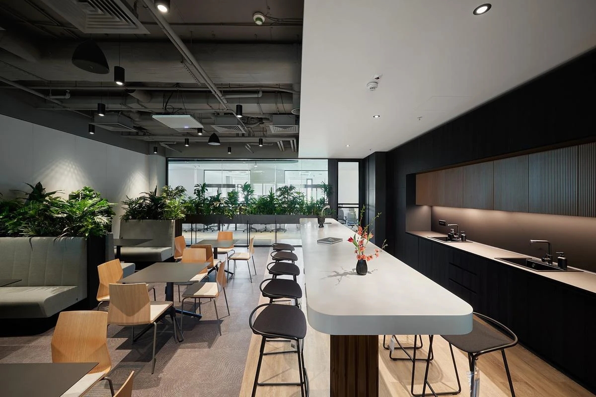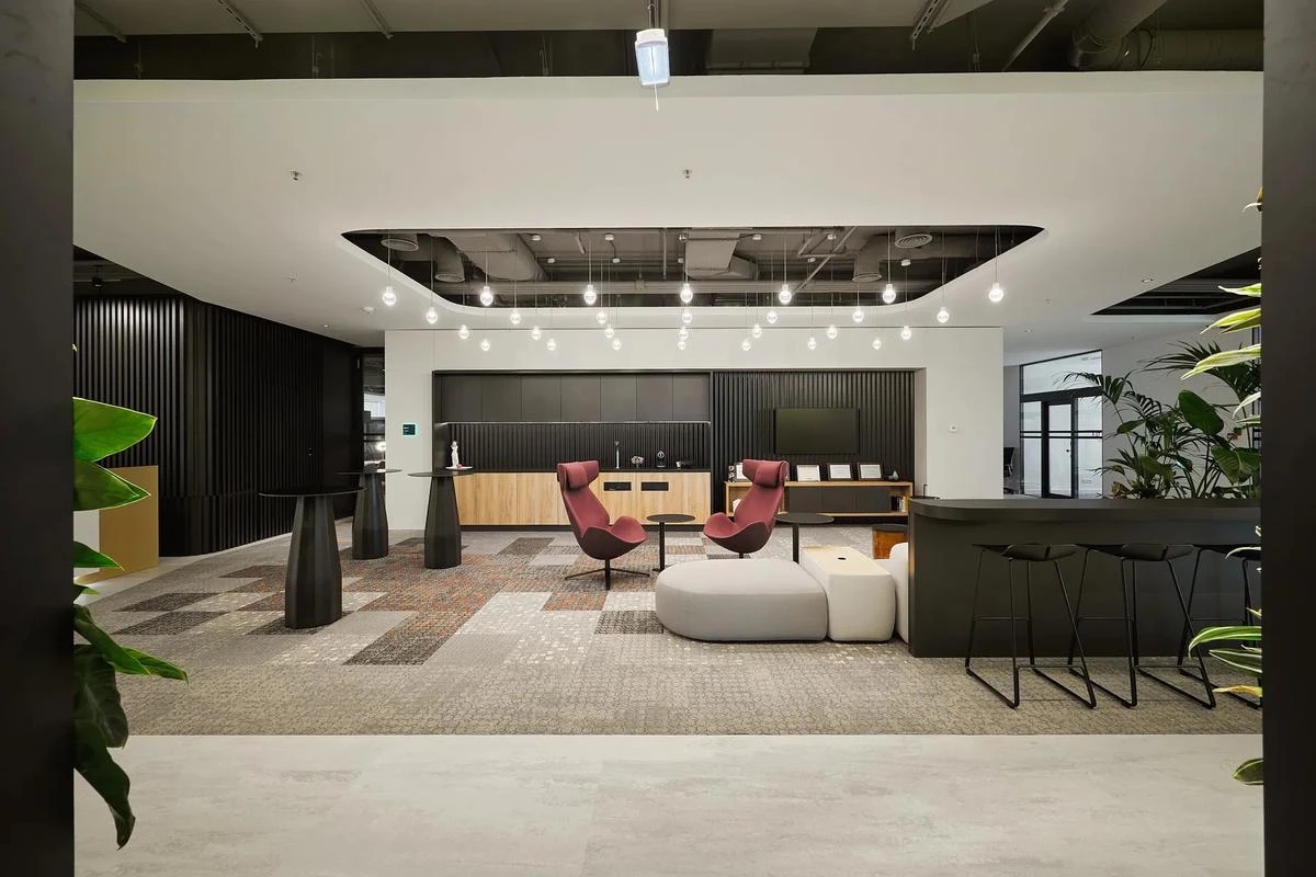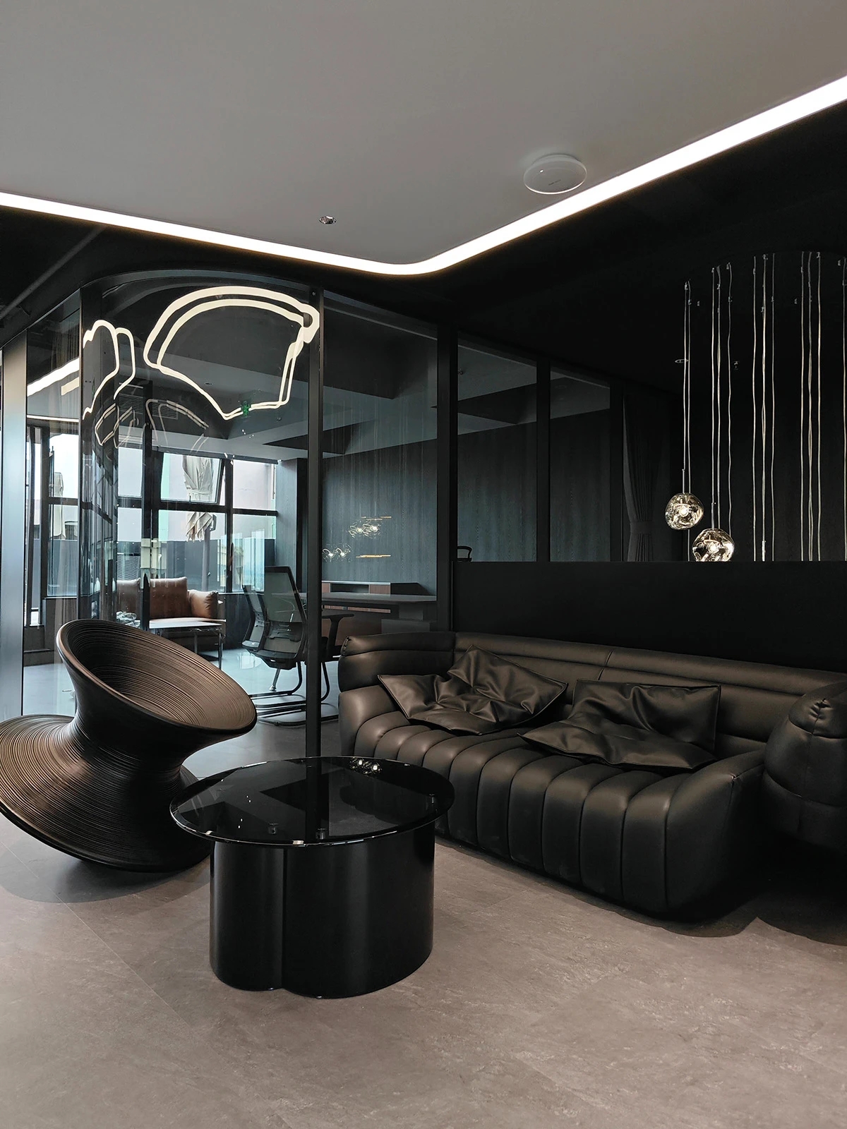 前厅用富有动感的流线型造型搭配暗黑底色,营造神秘的流动感,艺术玻璃引入光线,以定制哑光铝板衬托企业LOGO。企业经常会有重要访客到来,需要一个集中的接待场所,能够让访客充分的放松身心。茶水休闲区满足茶歇功能的同时,又可以围坐洽谈的空间,空间设有吧台、酒柜、展柜、冰箱、直饮水,留声机,身处其中给人以舒适自由的感受。开放办公区采用充满创意的围合式布局,以小组的办公形式,联系更紧密,行动更自由,仿若身处暗黑静谧环境中的一个个小岛,抬头见绿,无比惬意。
