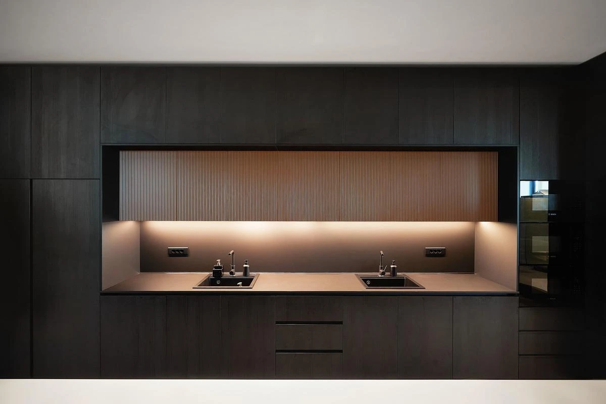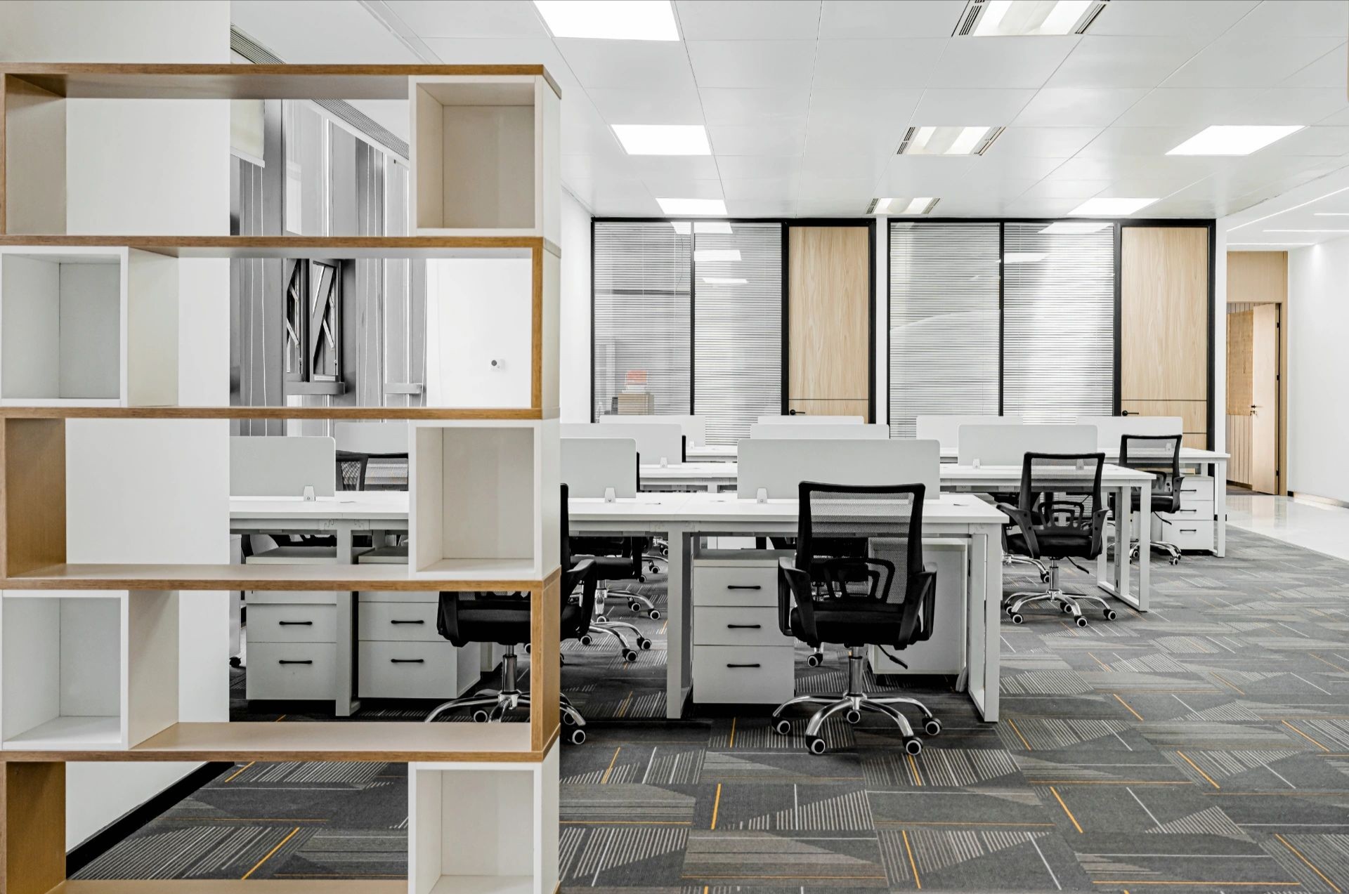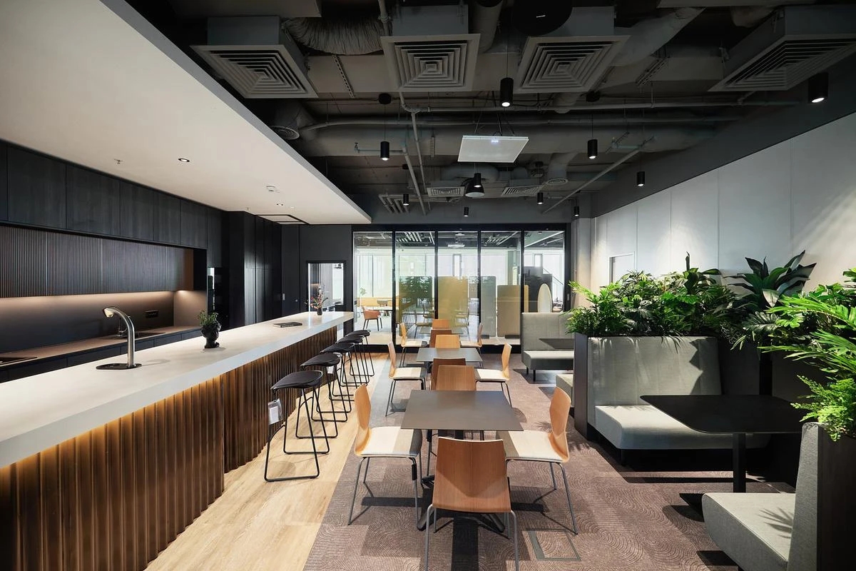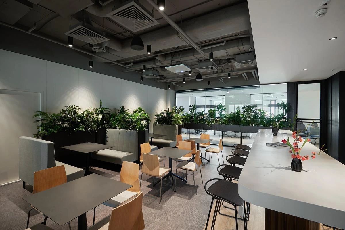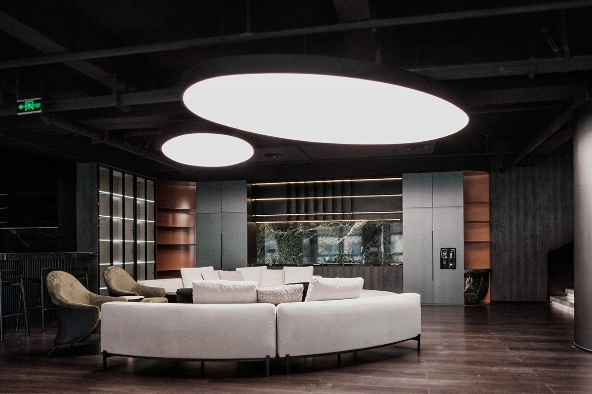 前厅用富有动感的流线型造型搭配暗黑底色,营造神秘的流动感,艺术玻璃引入光线,以定制哑光铝板衬托企业LOGO。企业经常会有重要访客到来,需要一个集中的接待场所,能够让访客充分的放松身心。茶水休闲区满足茶歇功能的同时,又可以围坐洽谈的空间,空间设有吧台、酒柜、展柜、冰箱、直饮水,留声机,身处其中给人以舒适自由的感受。开放办公区采用充满创意的围合式布局,以小组的办公形式,联系更紧密,行动更自由,仿若身处暗黑静谧环境中的一个个小岛,抬头见绿,无比惬意。