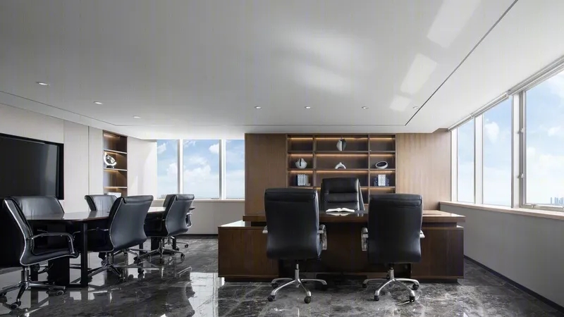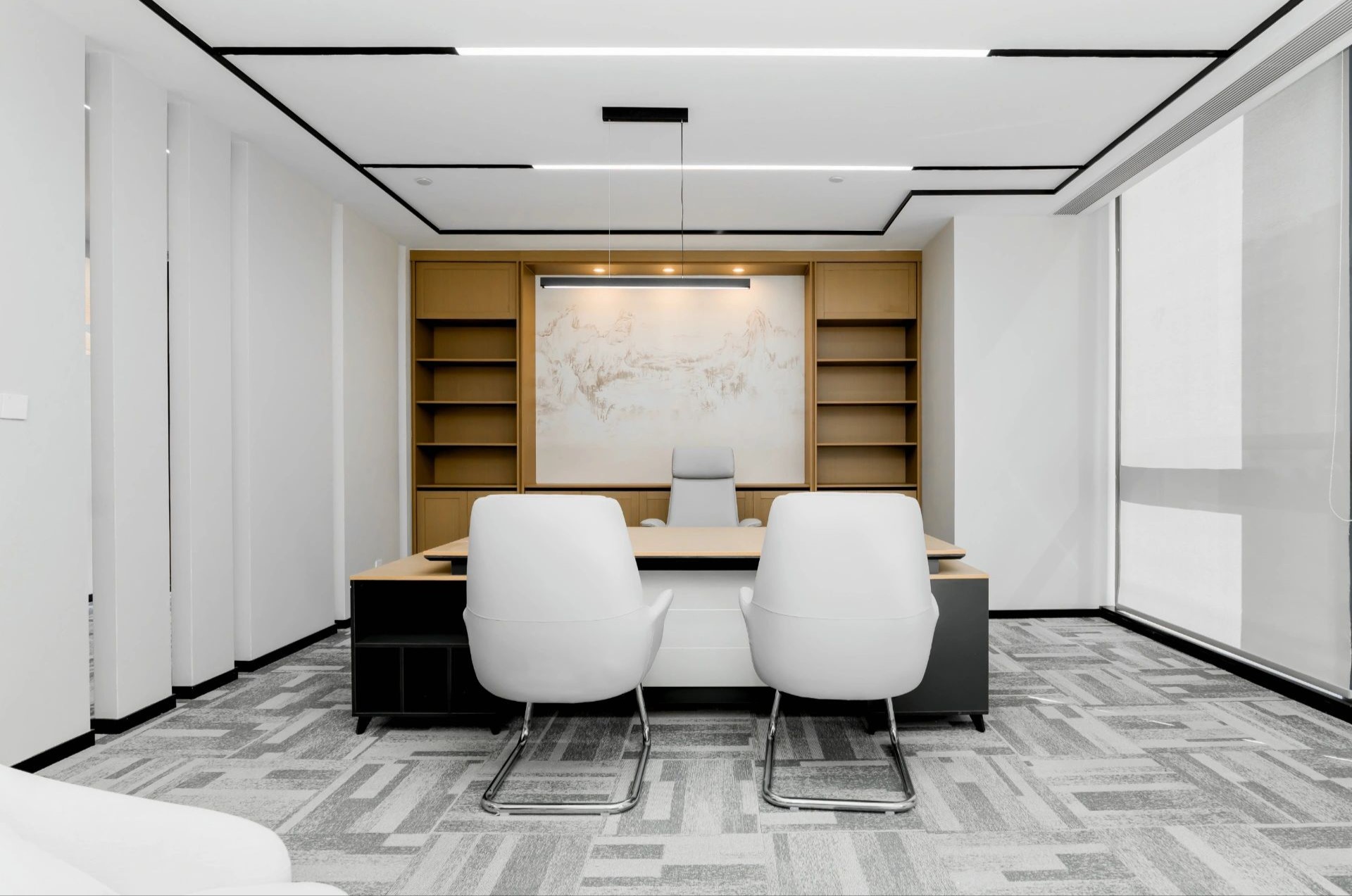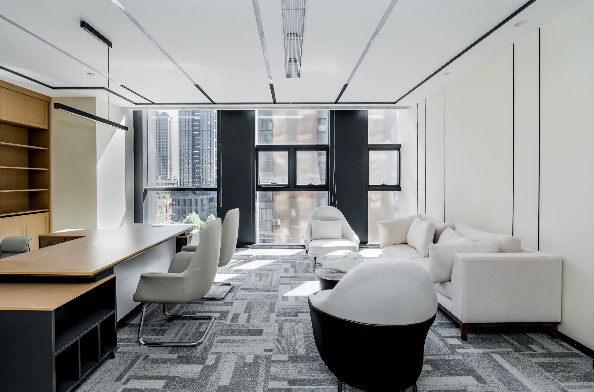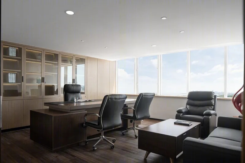 蓝色背景板的运用,为空间注入灵动之感,减轻了紧张感。经理室的设计更加注重品质与气派,细节之处彰显尊贵。空间内的每一件装饰品都经过精心挑选,旨在展现企业领导者的视野与品味。 在这里,设计与功能的完美结合,为董事长提供了一个高效、舒适的工作环境。
