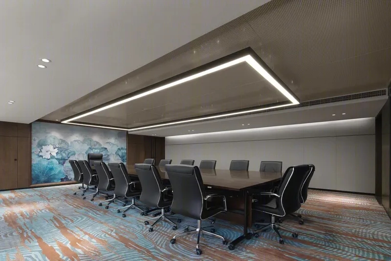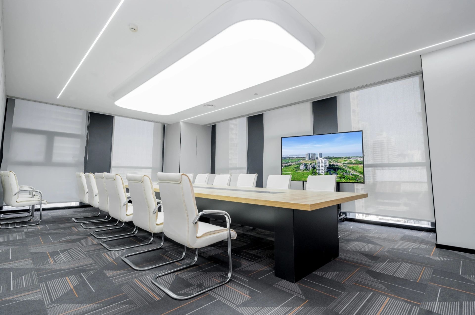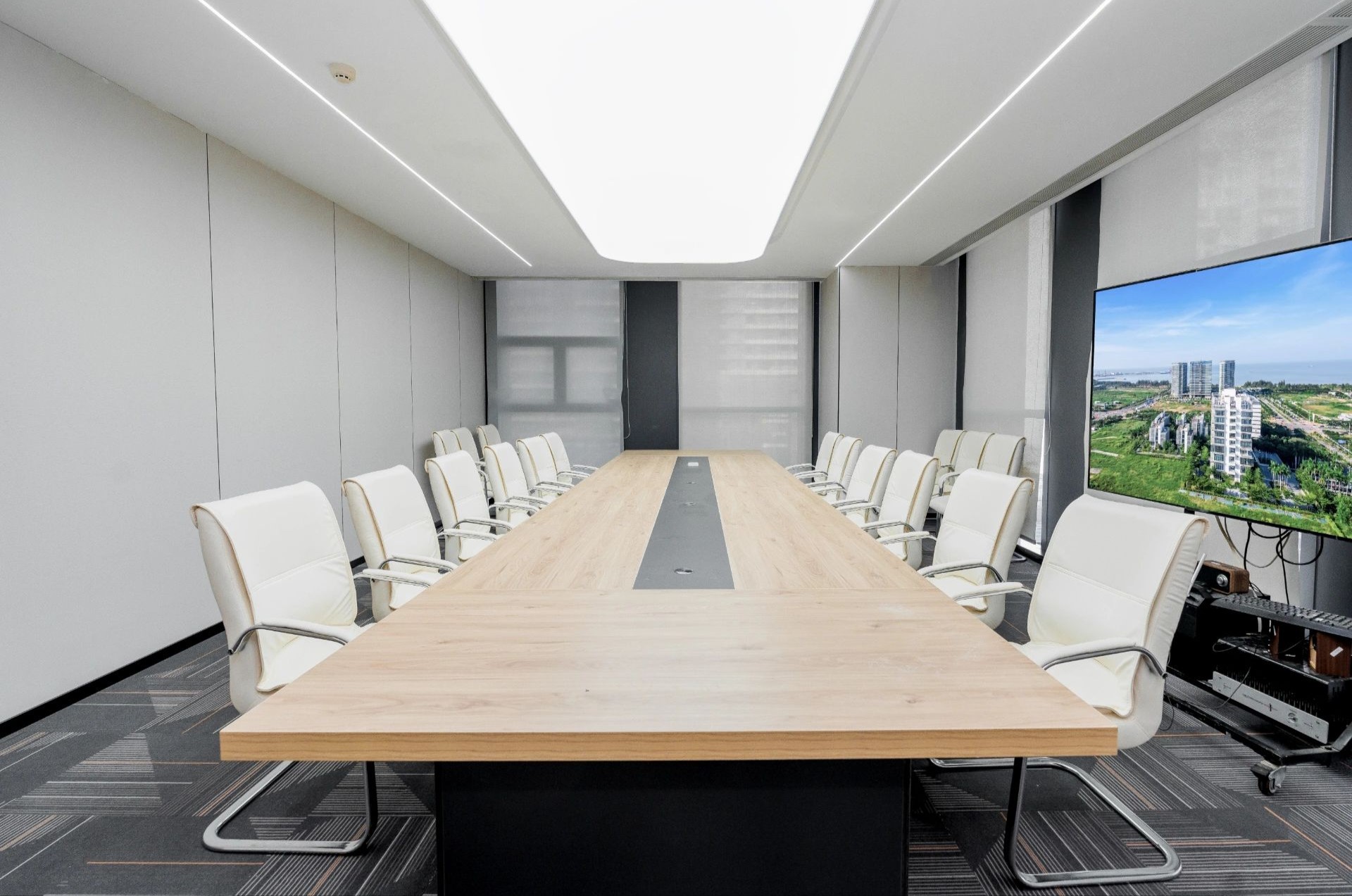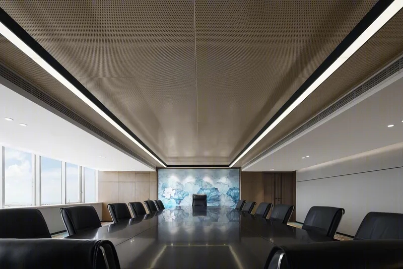 蓝色背景板的运用,为空间注入灵动之感,减轻了紧张感。经理室的设计更加注重品质与气派,细节之处彰显尊贵。空间内的每一件装饰品都经过精心挑选,旨在展现企业领导者的视野与品味。 在这里,设计与功能的完美结合,为董事长提供了一个高效、舒适的工作环境。