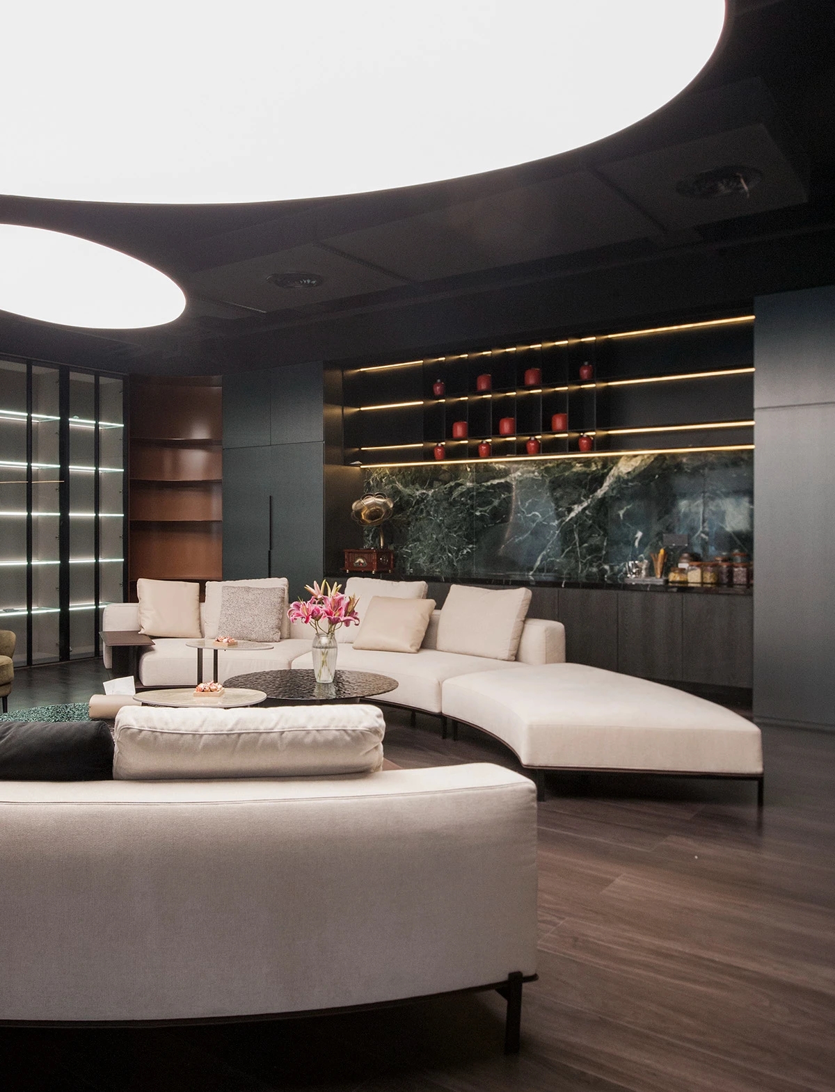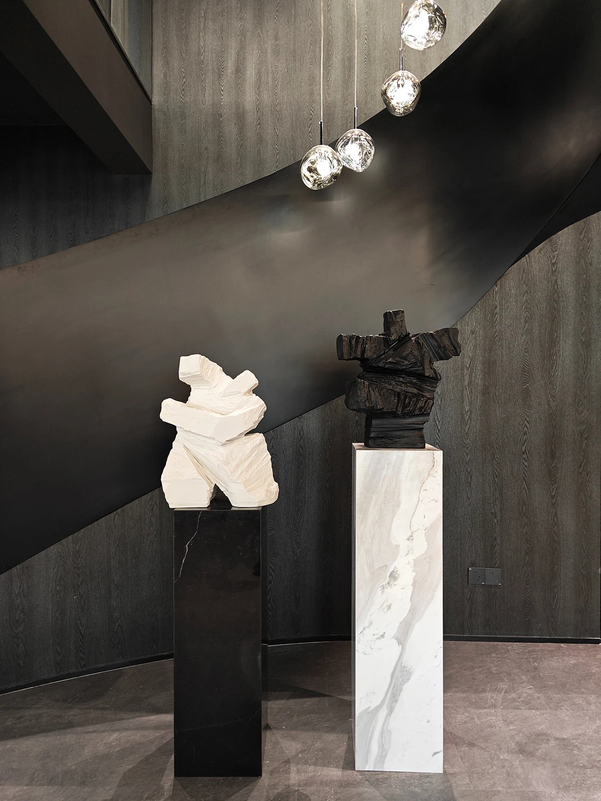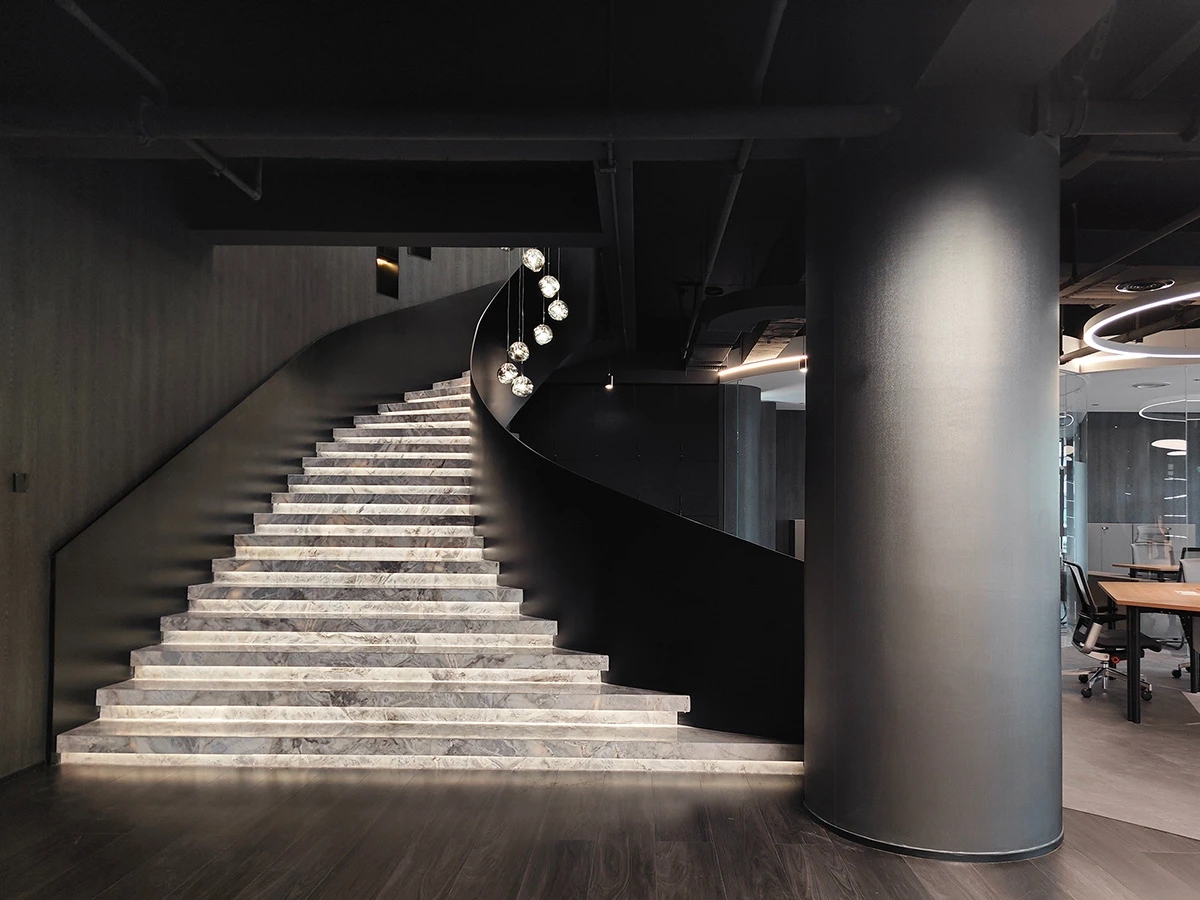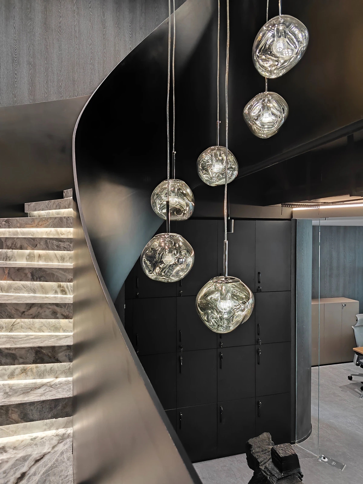 从一楼通向二楼设计了弧形大理石楼梯,鱼肚灰的大理石梯步搭配金属喷漆极简扶手,艺术吊灯错落有致,作为整个空间的亮点设计,弧形楼梯使得向上行走的过程充满了艺术感。二层高度有限,独立办公室以横梁的位置延伸出艺术漆纵横天花,拉高视觉效果。悬空柜连接天与地,仿佛置身盗梦空间。私人的休息冥想区,营造安静又充满艺术氛围的一隅,可入世又可出世。