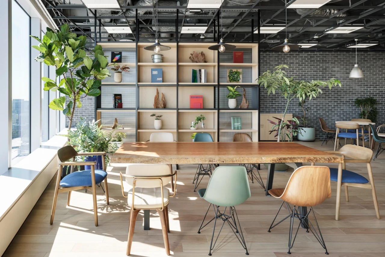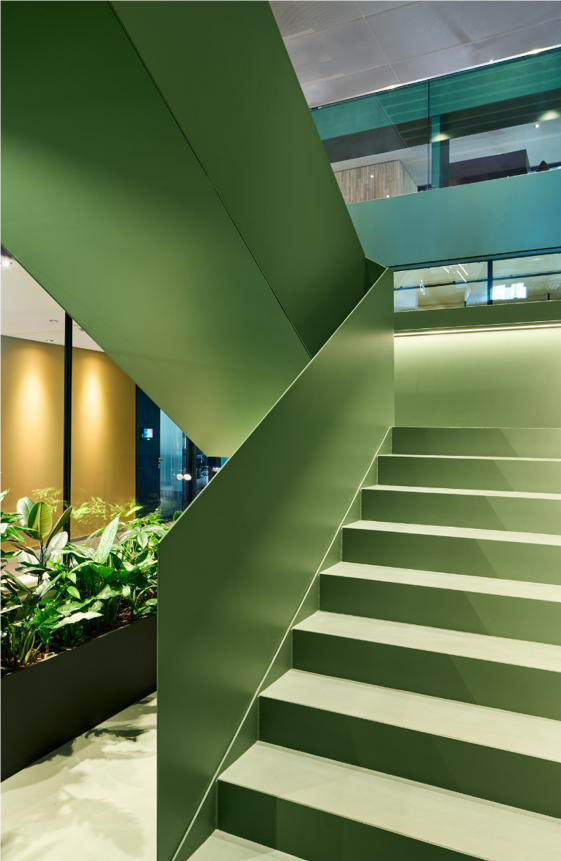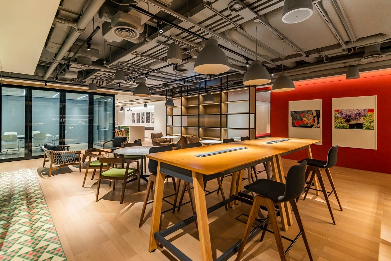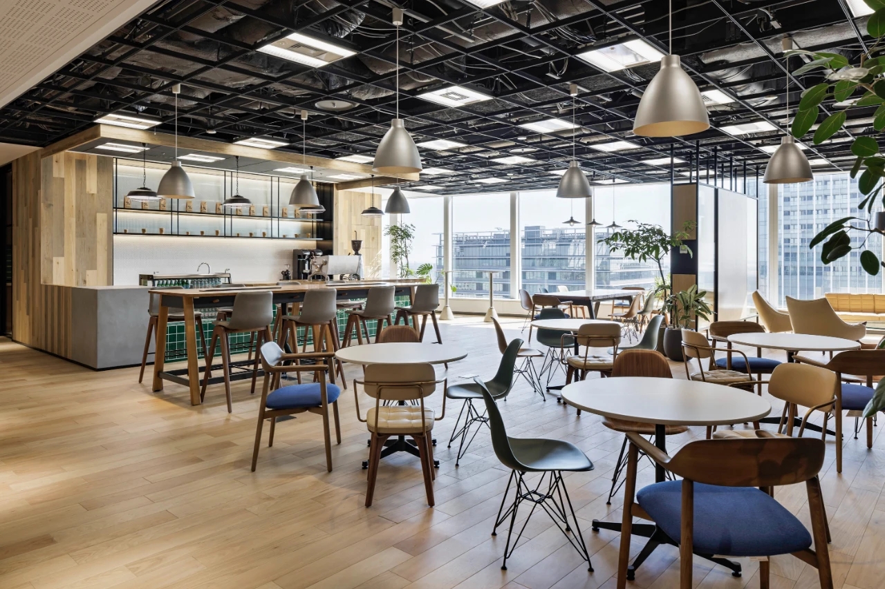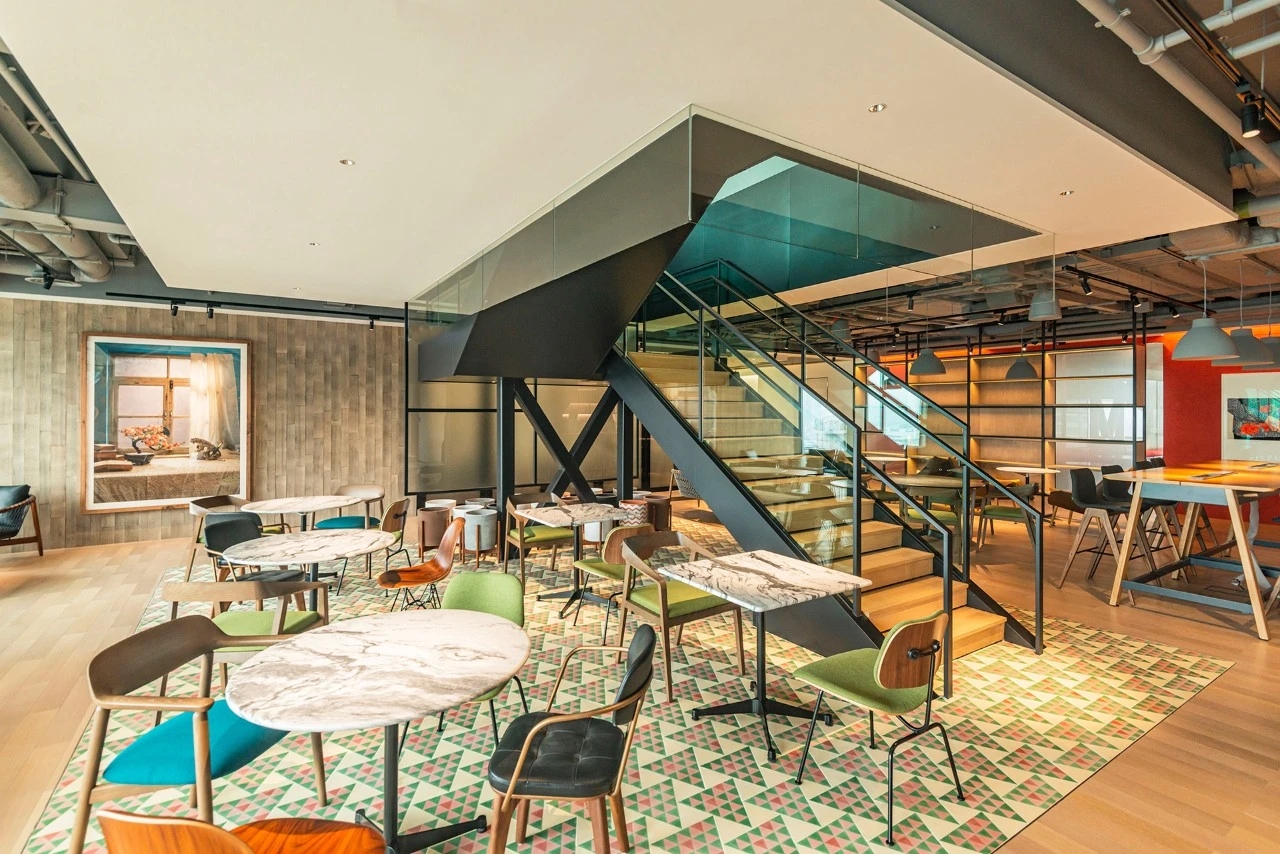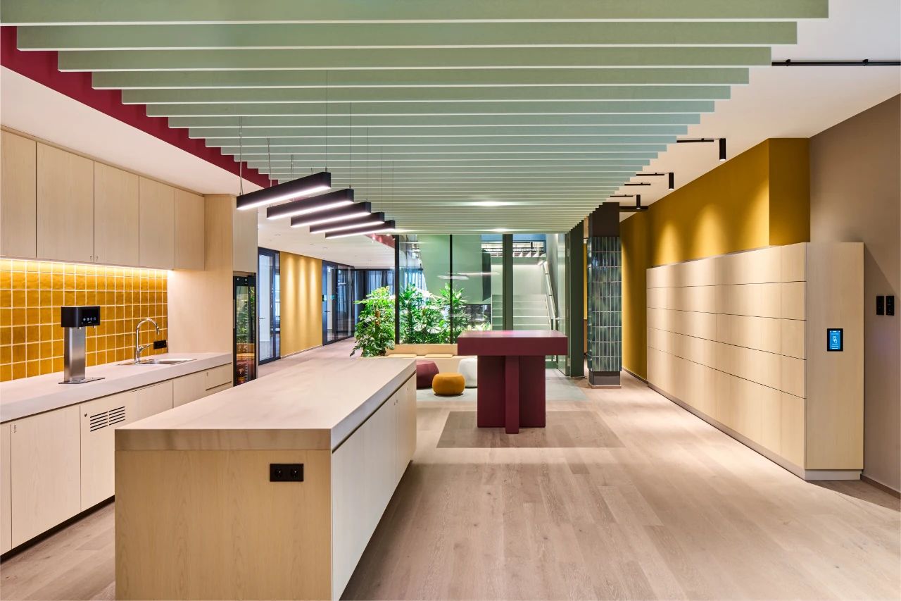 总部的点睛之笔,是一个功能丰富的第三方咖啡馆。专业咖啡师、果汁吧、预制美食餐厅、酒吧,一应俱全。这里不仅为员工们提供了在工作时间和下班后都触手可及的便利设施,还精心配置了各种空间,满足他们临时会议、休闲小憩等多样化需求。