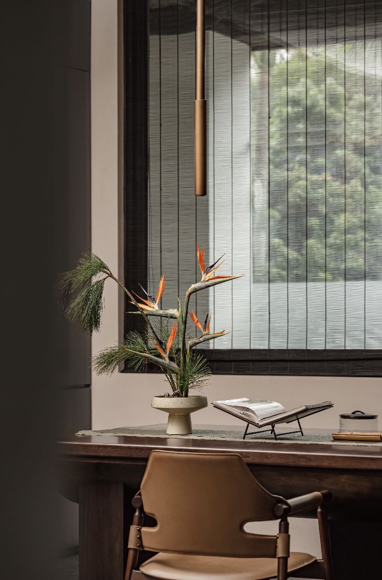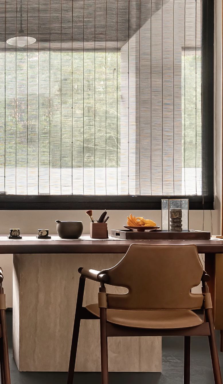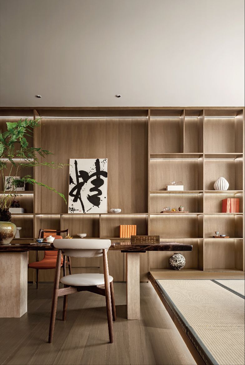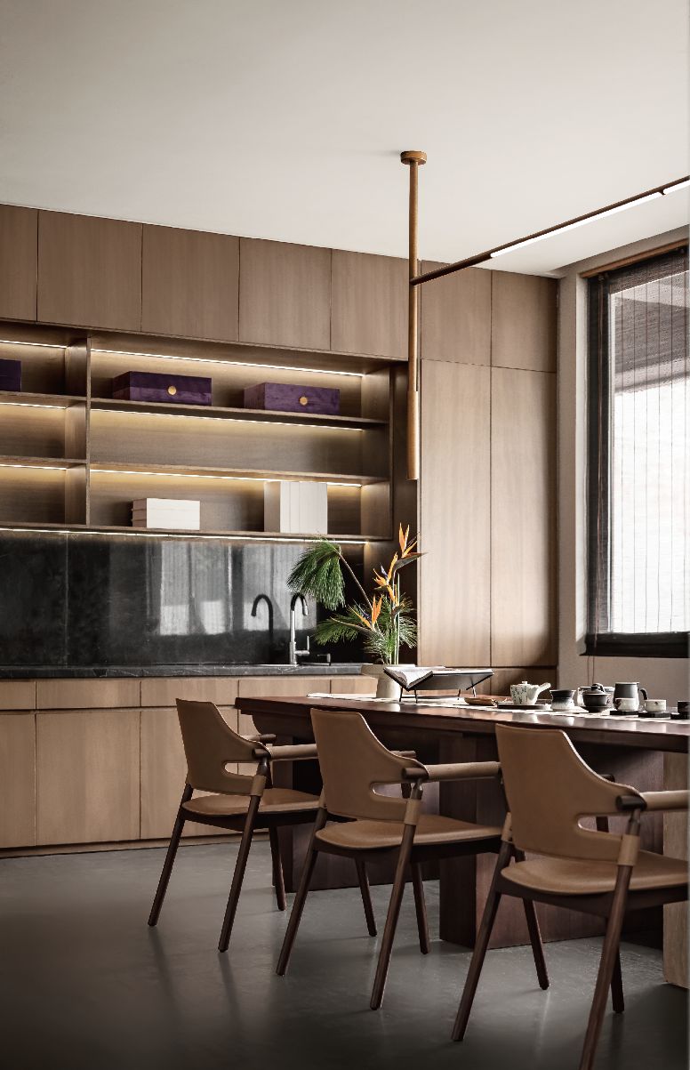 柔和的灯光下,茶具摆放得井井有条,散发出淡淡的光泽,时间仿佛变得缓慢而充实,让人忘却了外界的喧嚣与浮躁。整个空间的软装以侘寂风为主,颜色低调雅致,材质采用天然的石材、木头,结合棉麻布艺及大自然的花草果实、有故事的中古家具及饰品进行装饰。在这里可以品茶、斗茶,尽情体验优雅闲适的艺术享受。