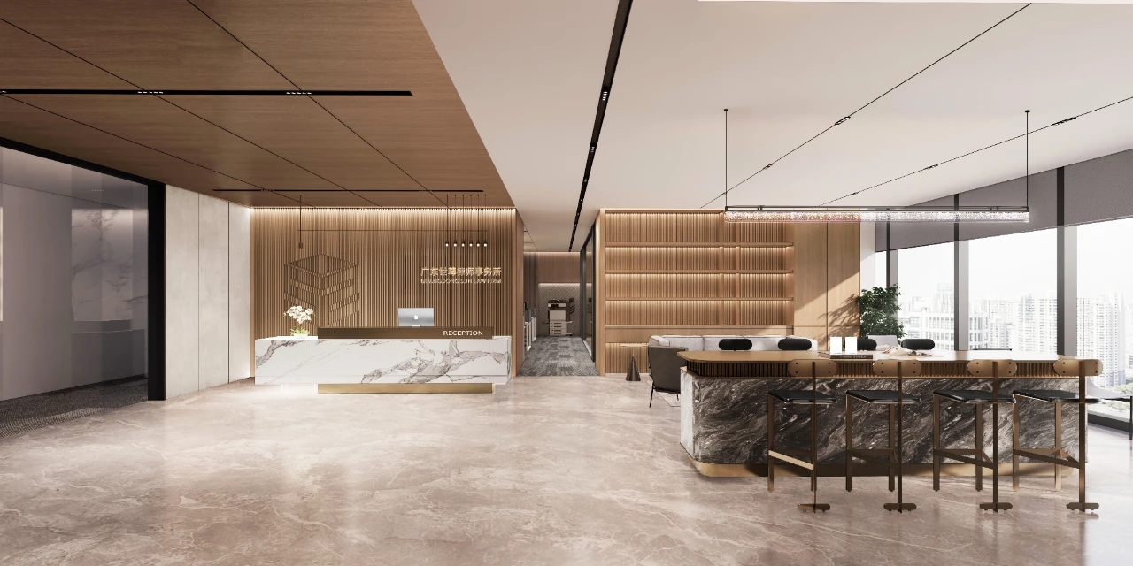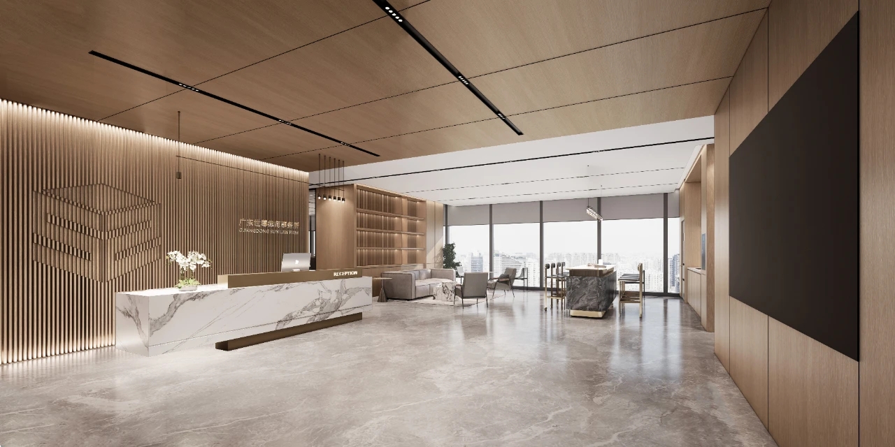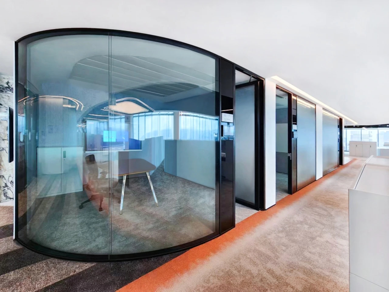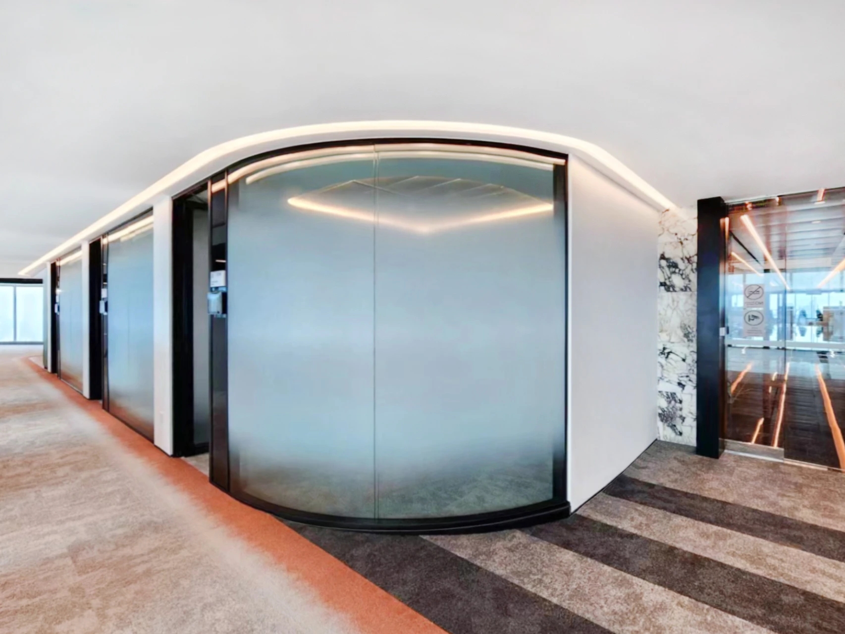 在入口处两侧功能区采用了超大半径的弯弧玻璃,把原本有限的视角无限延伸至室内,框架底边独特的坡度设计,为庄严的办公空间注入了柔和的元素。直角拼接的全景玻璃,对于安装工艺的要求非常严苛,用巧夺天工形容并不夸张。