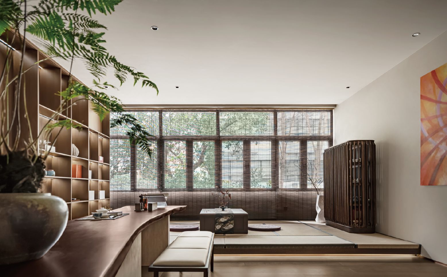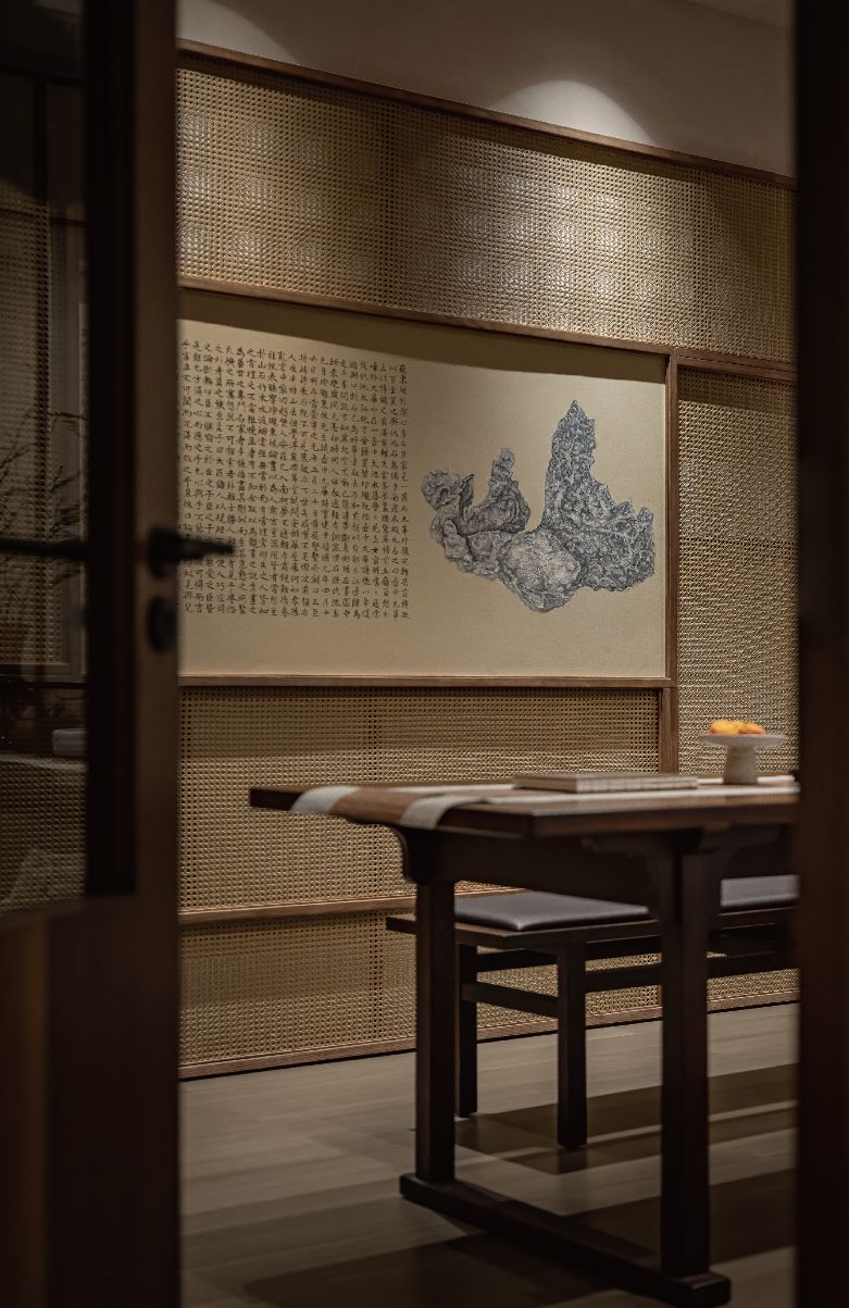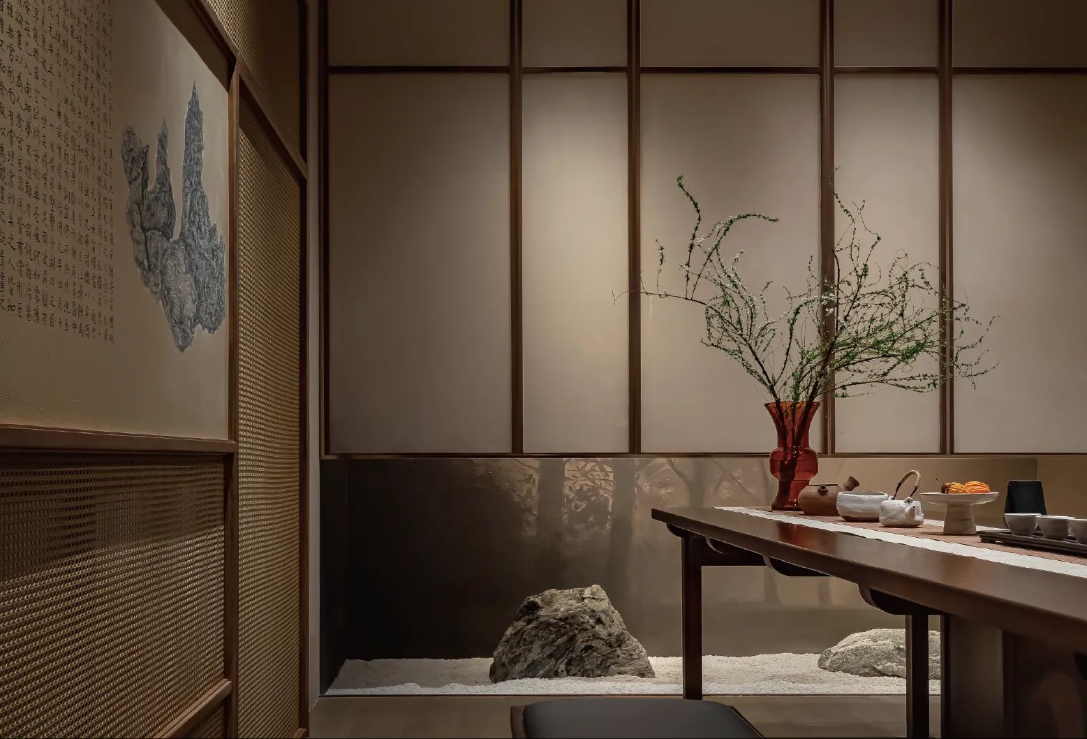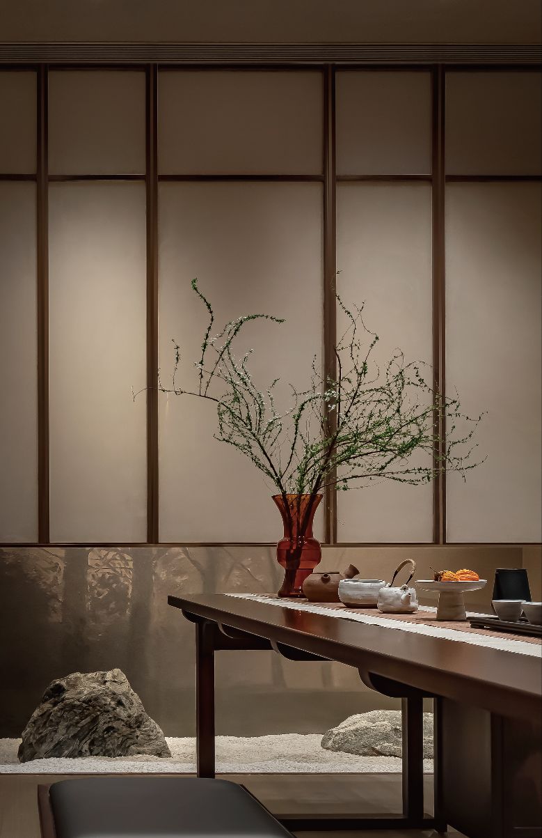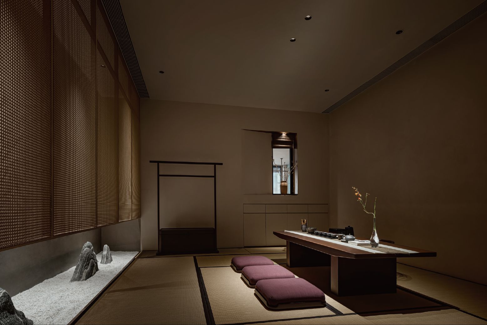 在茶室空间中,我们通过灯光的布置、材质的纹理质感以及空间的布局,共同构建了光与空间之间的紧密联系,通过光的投射获得明暗对比,为茶室赋予了一种特有的氛围和气质,进而展现出独特的美学价值。