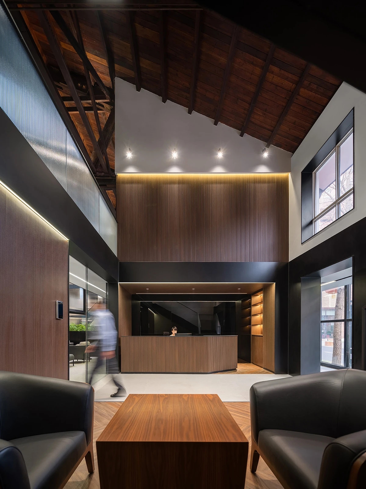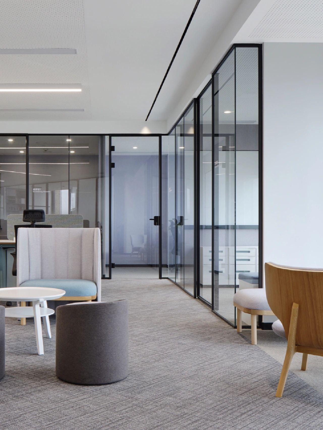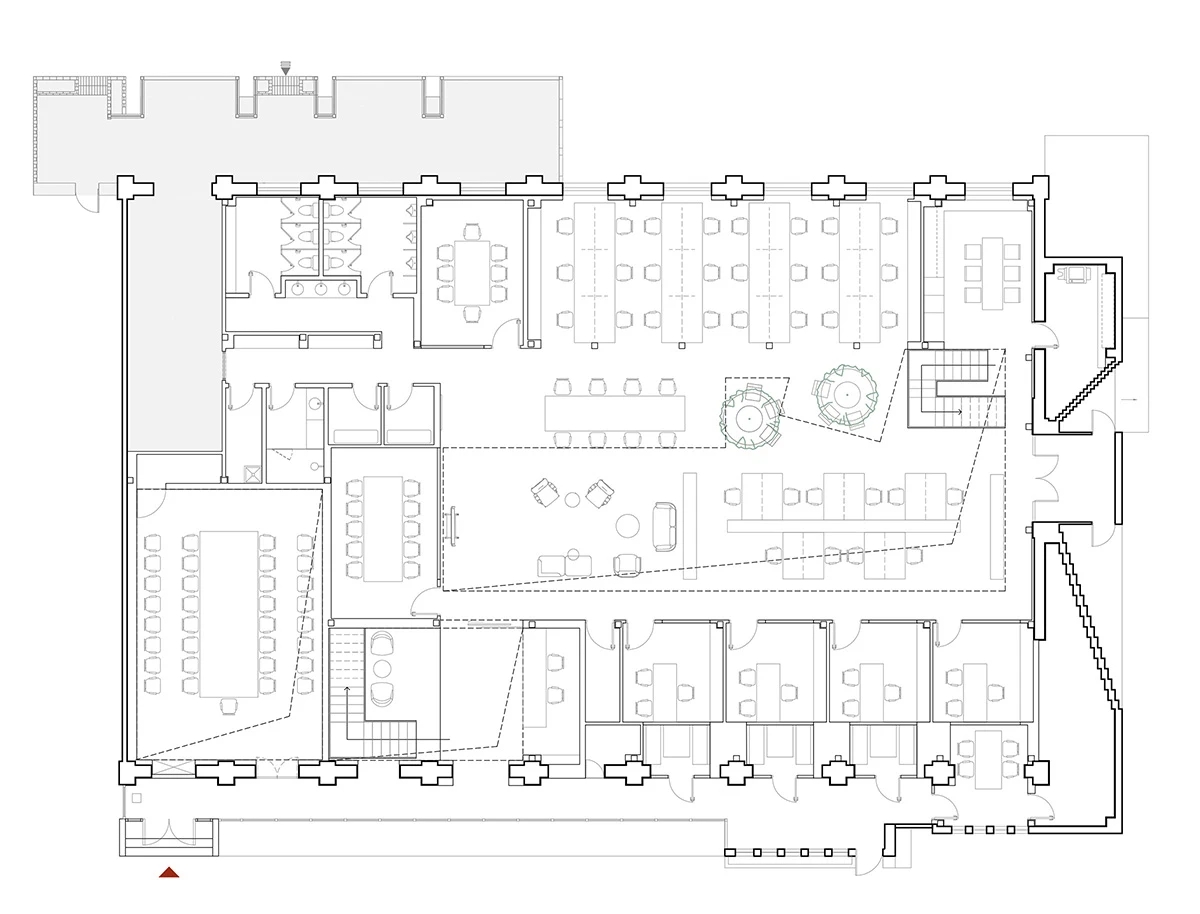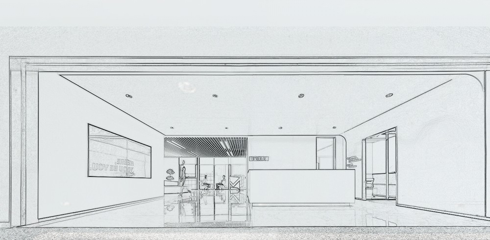 整个项目的主入口在建筑南边靠西的地方,单独设计了一个简约的方形门头,南边大门进入,然后右转从东边推开第二扇玻璃门,进入一道长长的外加的玻璃走廊,走廊的北面就是红砖的建筑外墙,依次是大会议室(挑空层高),前台(往北穿过前台就会进入内部广场),然后是若干小的封闭的独立洽谈室或工作间,形成了一个完整的、对外的会议区。