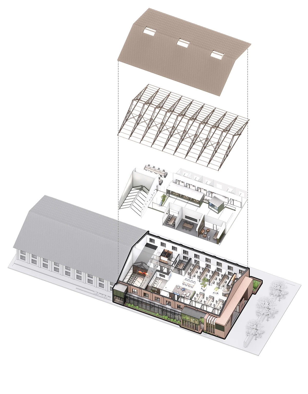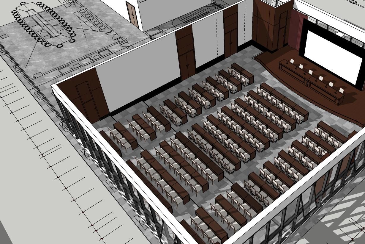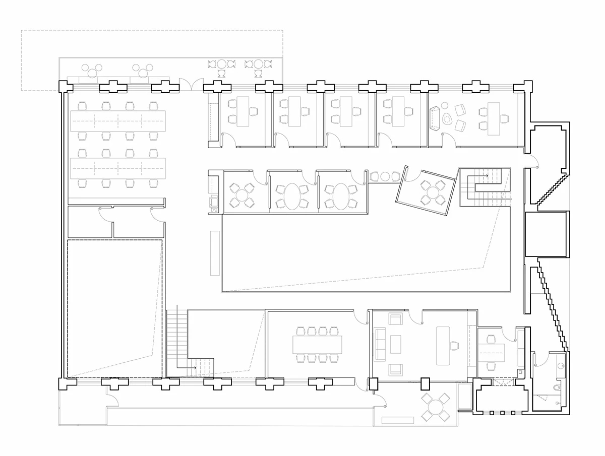 整个项目的主入口在建筑南边靠西的地方,单独设计了一个简约的方形门头,南边大门进入,然后右转从东边推开第二扇玻璃门,进入一道长长的外加的玻璃走廊,走廊的北面就是红砖的建筑外墙,依次是大会议室(挑空层高),前台(往北穿过前台就会进入内部广场),然后是若干小的封闭的独立洽谈室或工作间,形成了一个完整的、对外的会议区。