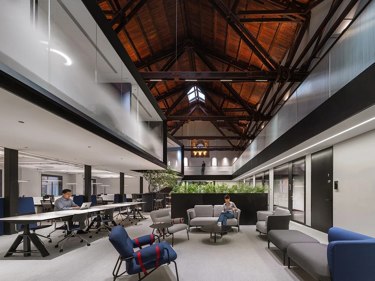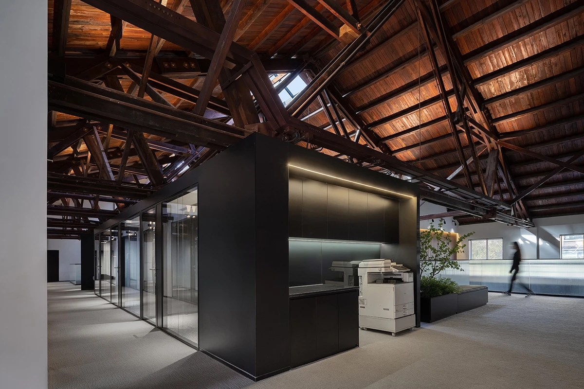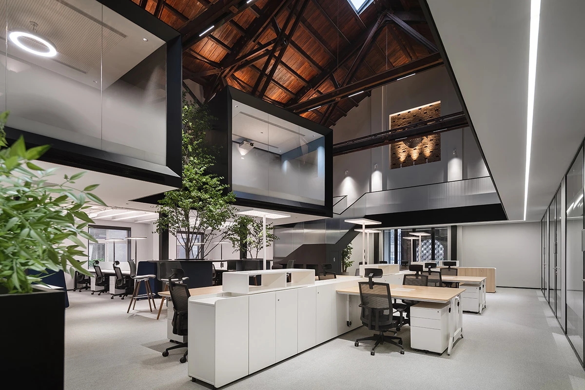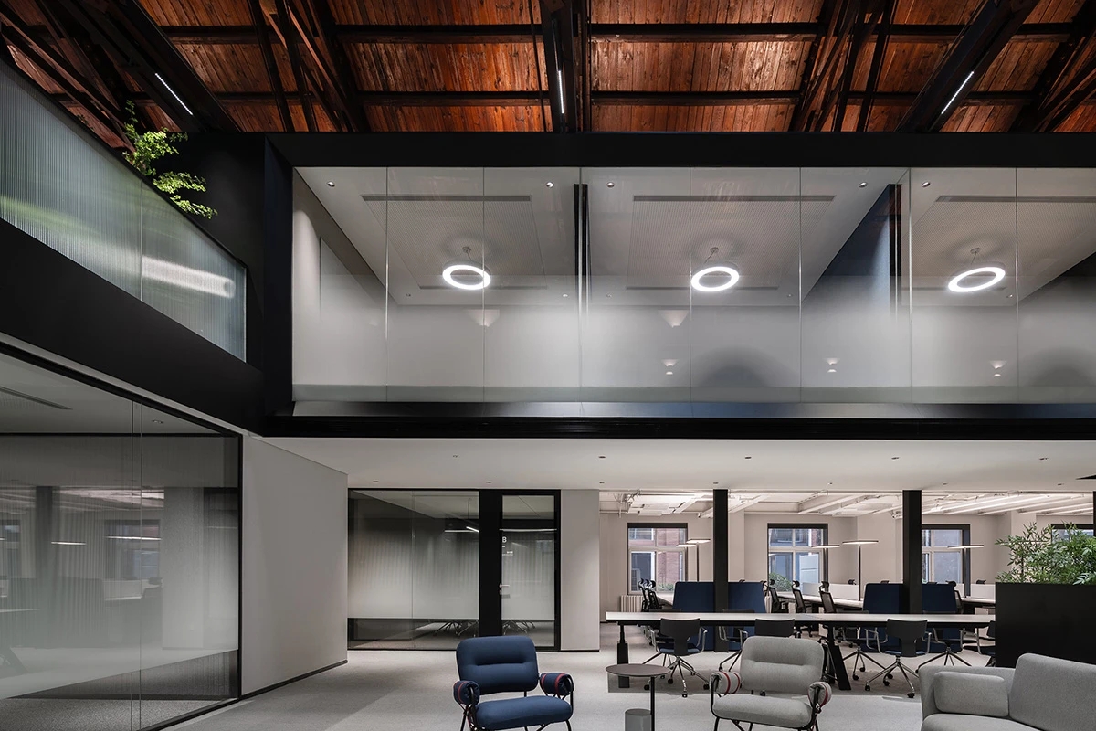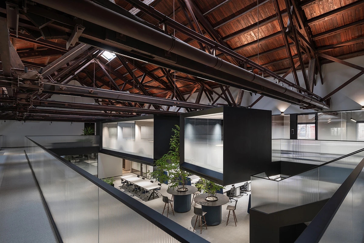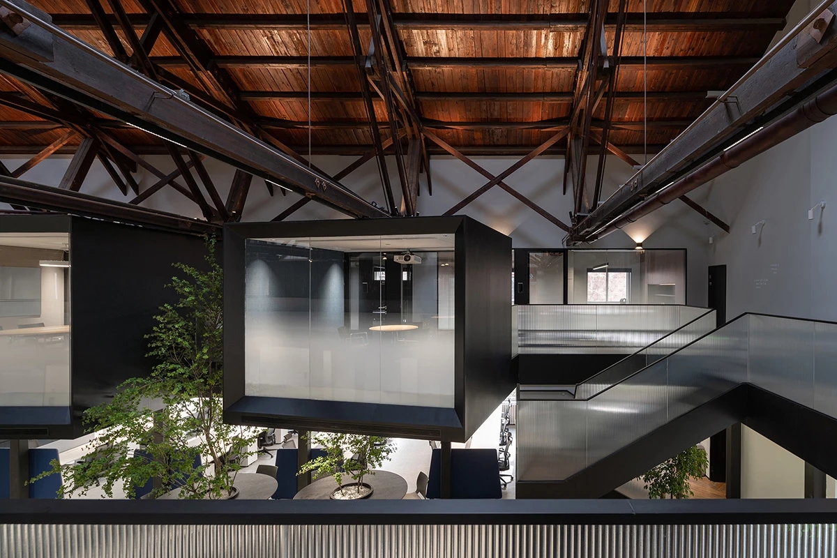 广场的西边为建筑出口,南、北和西边形成上下两层的结构,南边上下两层、北边的上层和西边的下层为独立的房间,北边下层为开放的办公区,广场则变成兼顾等候、洽谈、路演、灵动办公、团队交流的多功能区域,而广场北边的上层悬空横挑出来四个玻璃盒子:三个顺接连排,稍微错开后,一个斜靠,形成四个俯视广场的独立会议。悬挑方块、阳光广场,以及屋顶悬架一起,营造出富有节奏感的空间主旋律。