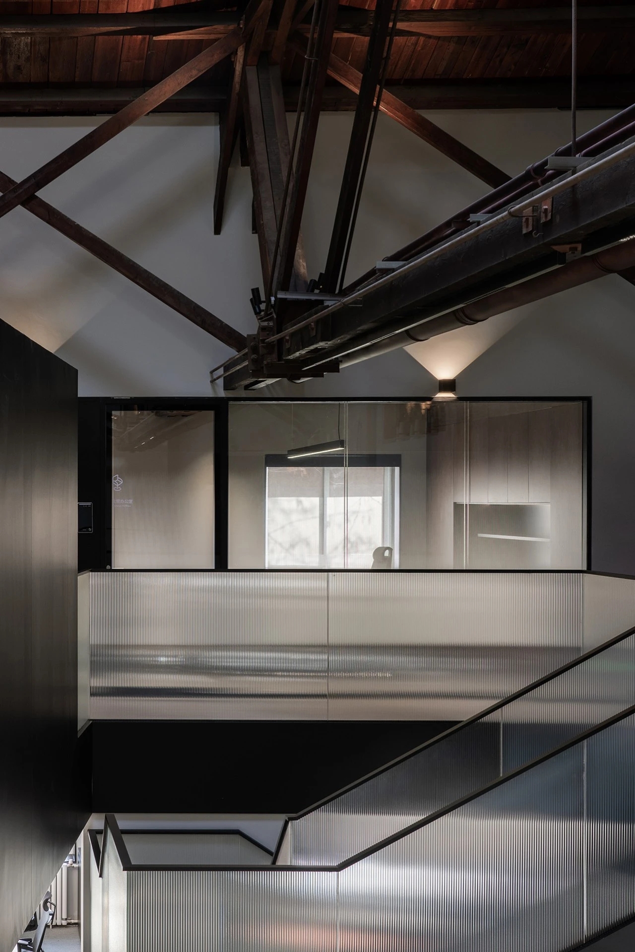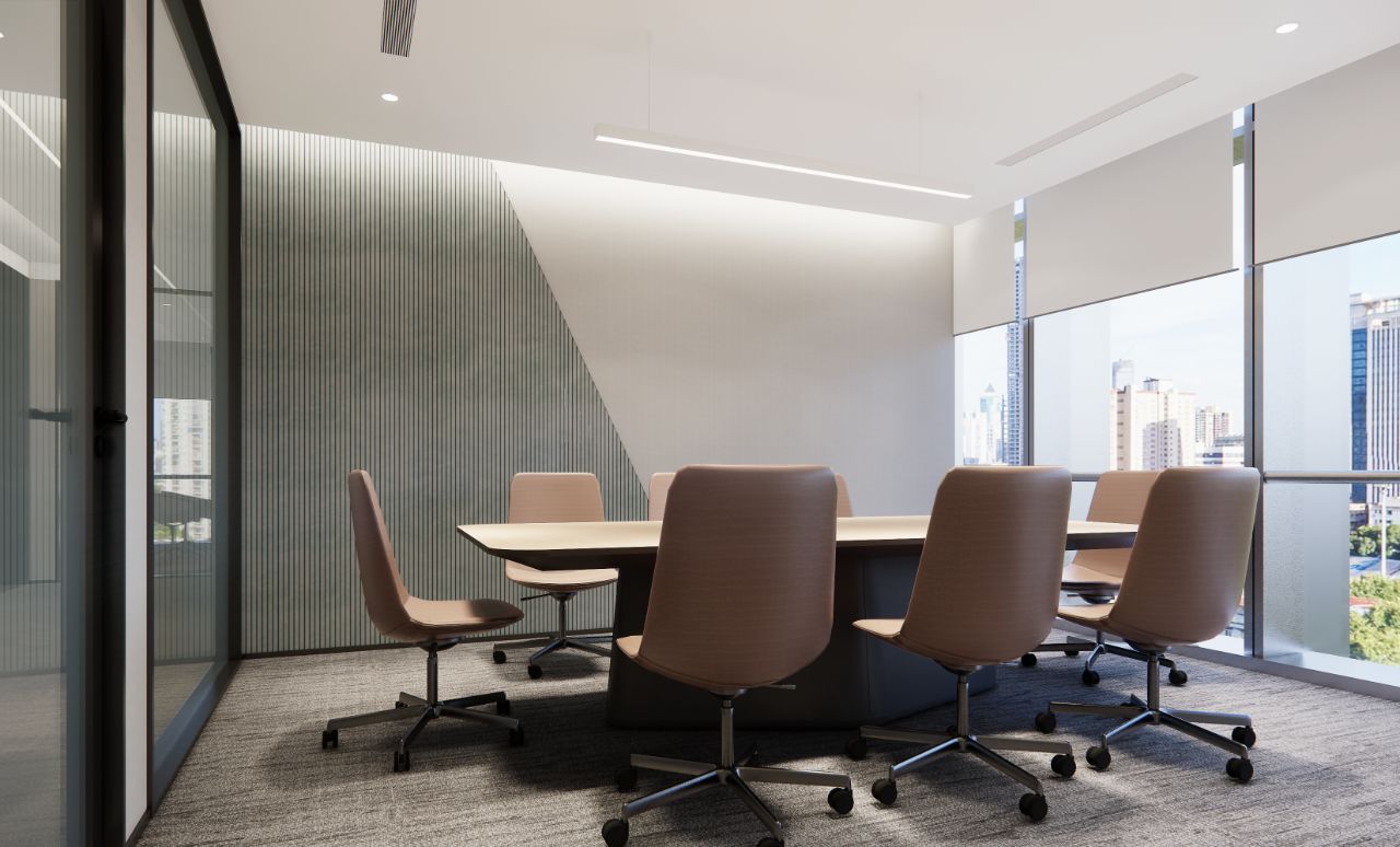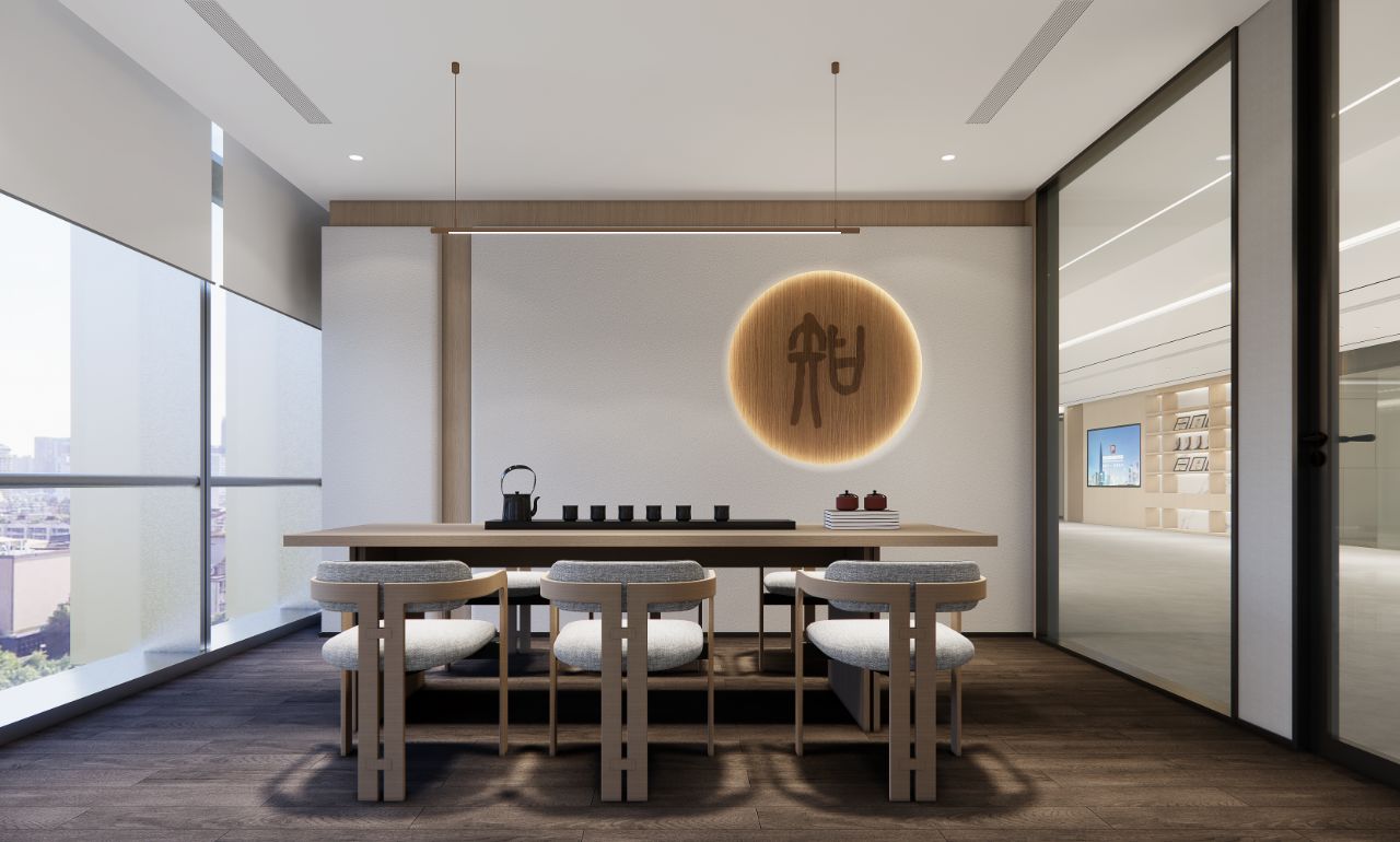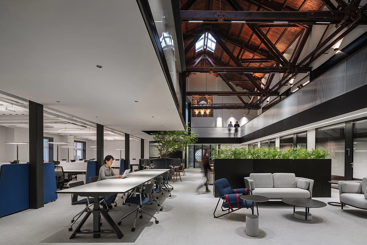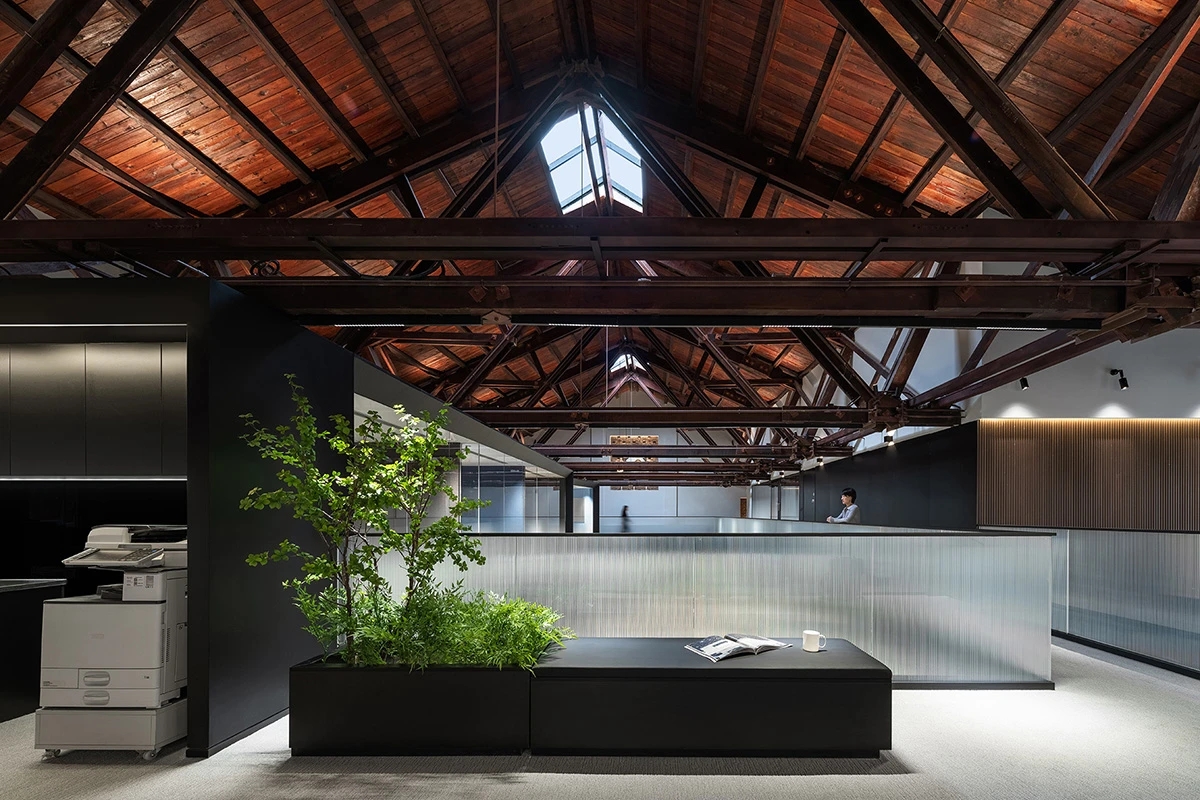 广场的西边为建筑出口,南、北和西边形成上下两层的结构,南边上下两层、北边的上层和西边的下层为独立的房间,北边下层为开放的办公区,广场则变成兼顾等候、洽谈、路演、灵动办公、团队交流的多功能区域,而广场北边的上层悬空横挑出来四个玻璃盒子:三个顺接连排,稍微错开后,一个斜靠,形成四个俯视广场的独立会议。悬挑方块、阳光广场,以及屋顶悬架一起,营造出富有节奏感的空间主旋律。