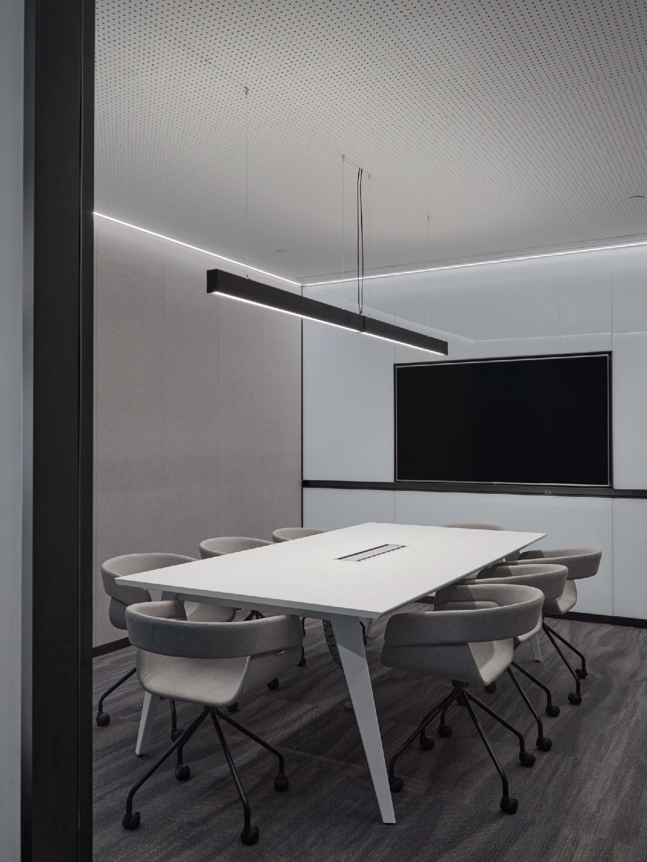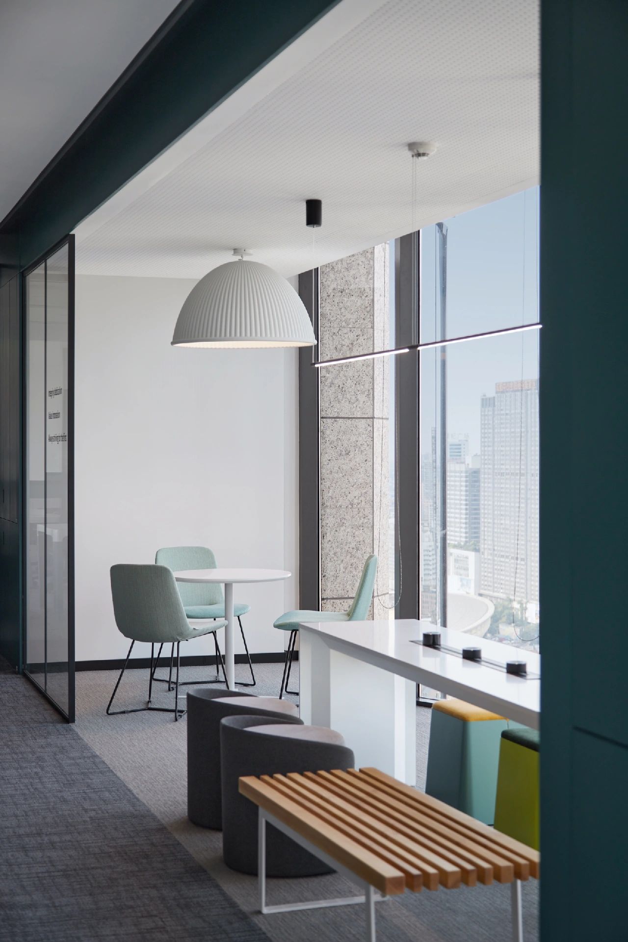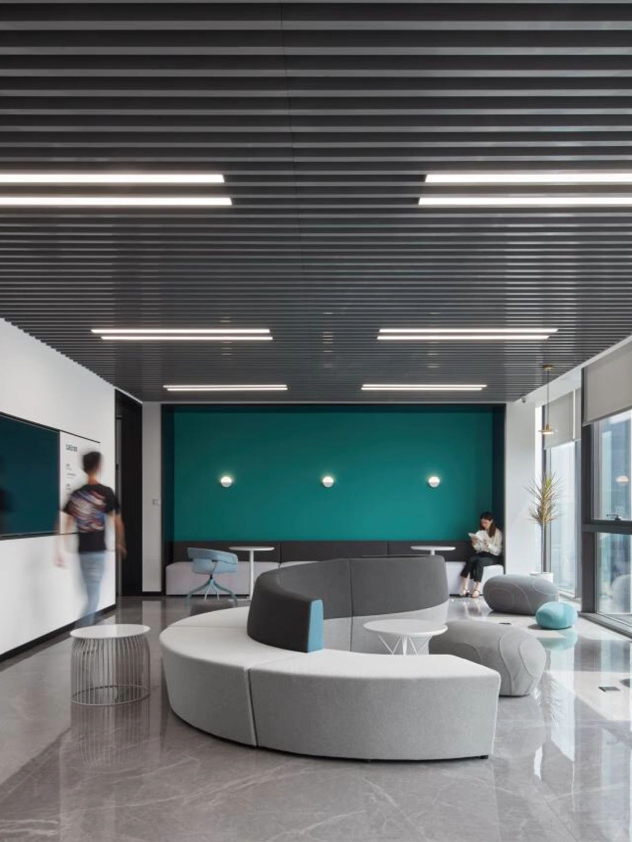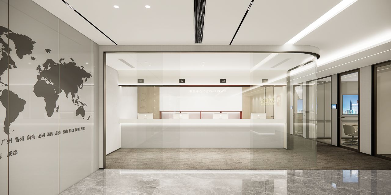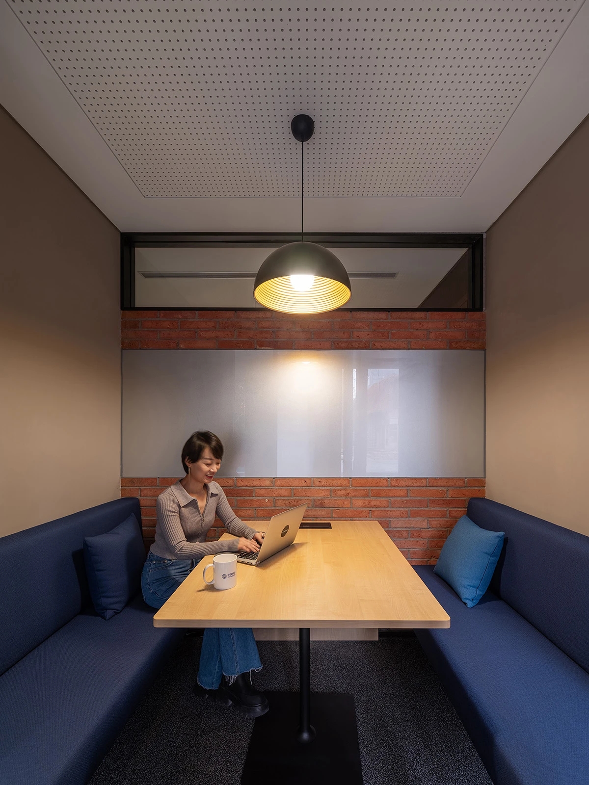 广场的西边为建筑出口,南、北和西边形成上下两层的结构,南边上下两层、北边的上层和西边的下层为独立的房间,北边下层为开放的办公区,广场则变成兼顾等候、洽谈、路演、灵动办公、团队交流的多功能区域,而广场北边的上层悬空横挑出来四个玻璃盒子:三个顺接连排,稍微错开后,一个斜靠,形成四个俯视广场的独立会议。悬挑方块、阳光广场,以及屋顶悬架一起,营造出富有节奏感的空间主旋律。