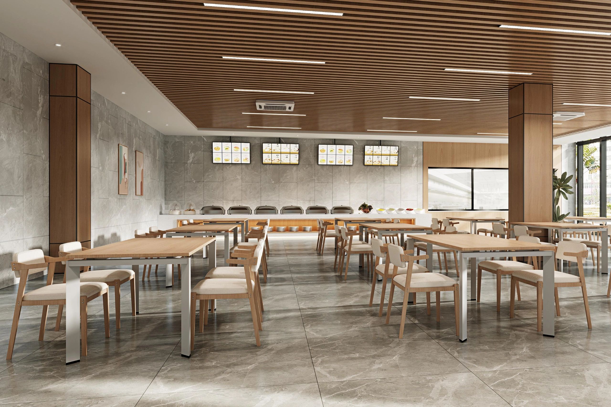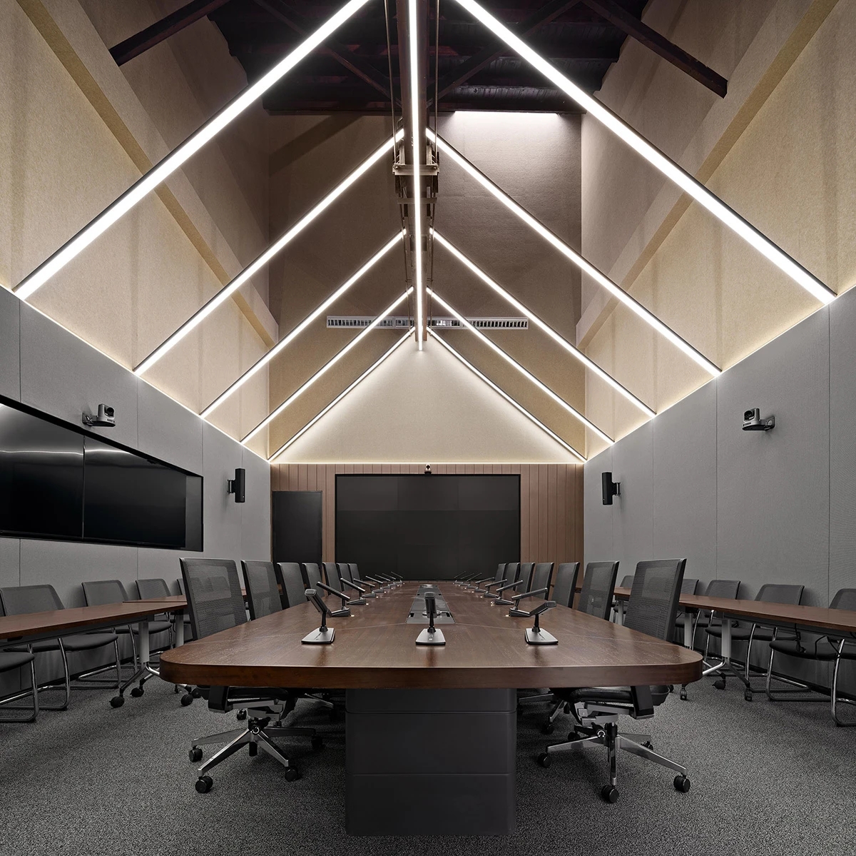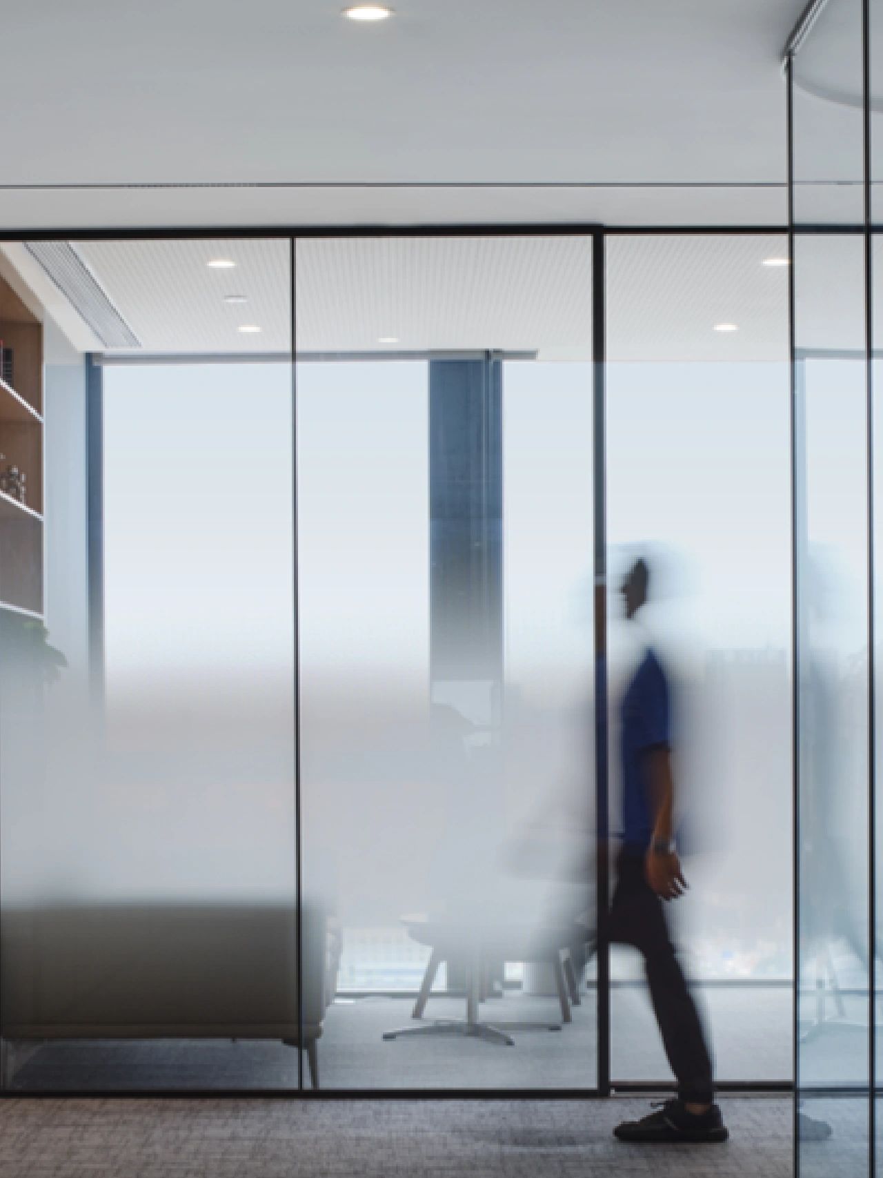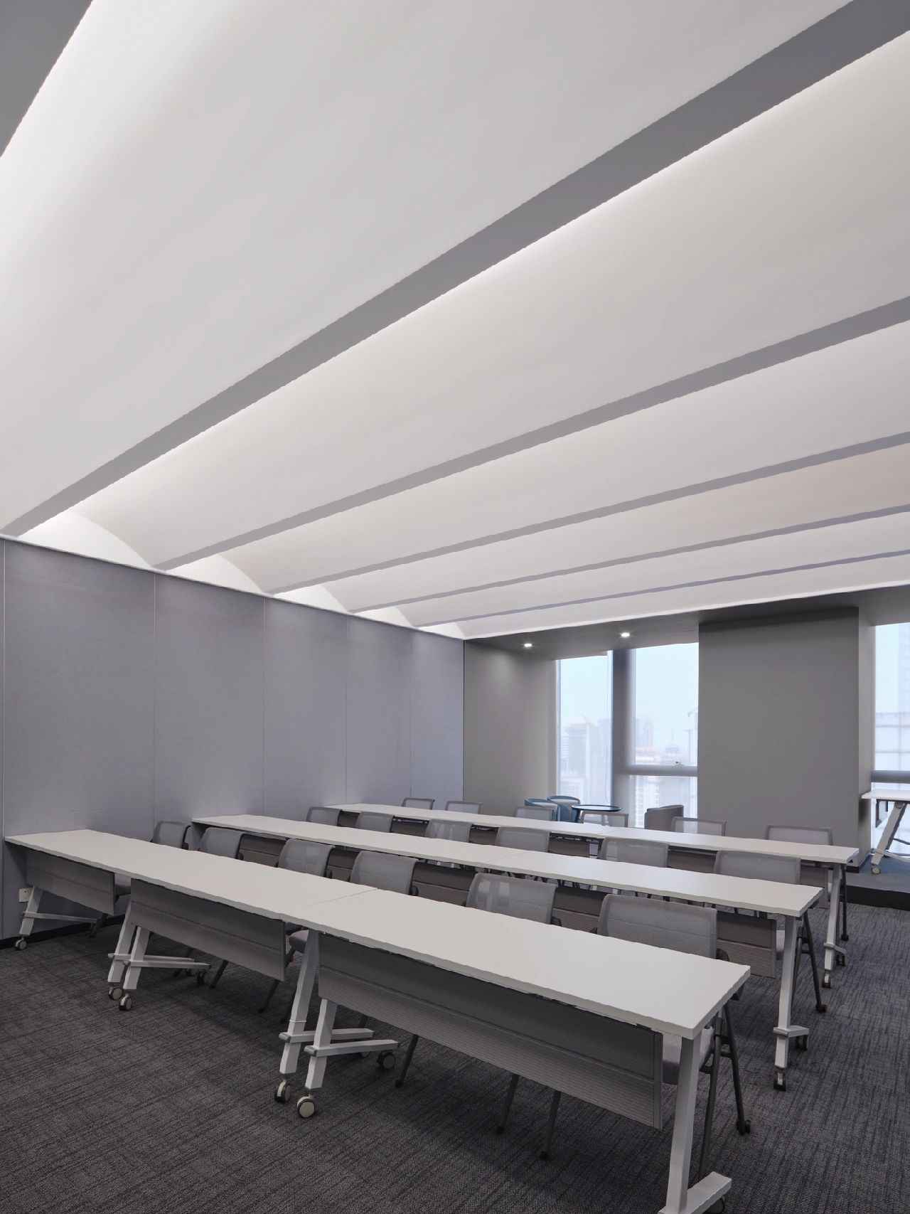 广场的西边为建筑出口,南、北和西边形成上下两层的结构,南边上下两层、北边的上层和西边的下层为独立的房间,北边下层为开放的办公区,广场则变成兼顾等候、洽谈、路演、灵动办公、团队交流的多功能区域,而广场北边的上层悬空横挑出来四个玻璃盒子:三个顺接连排,稍微错开后,一个斜靠,形成四个俯视广场的独立会议。悬挑方块、阳光广场,以及屋顶悬架一起,营造出富有节奏感的空间主旋律。