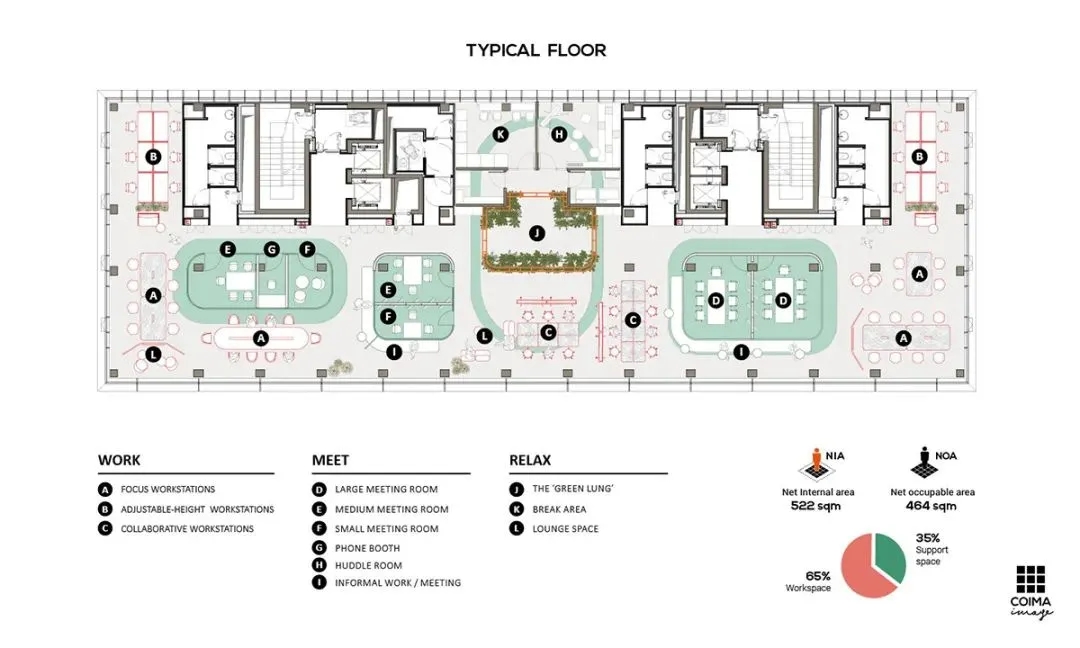 空间规划遵循“ABW”的逻辑——根据手头的任务提供各种选择,以有效和最佳的方式完成工作。每一层都提供开放和封闭的混合环境,并根据不同部门的需求进行战略规划;新总部不仅有标准办公桌,还有高度可调节的办公桌,以及众多配备丰富家具和先进技术的辅助支撑空间,具有高度的灵活性和可重构的自由度。