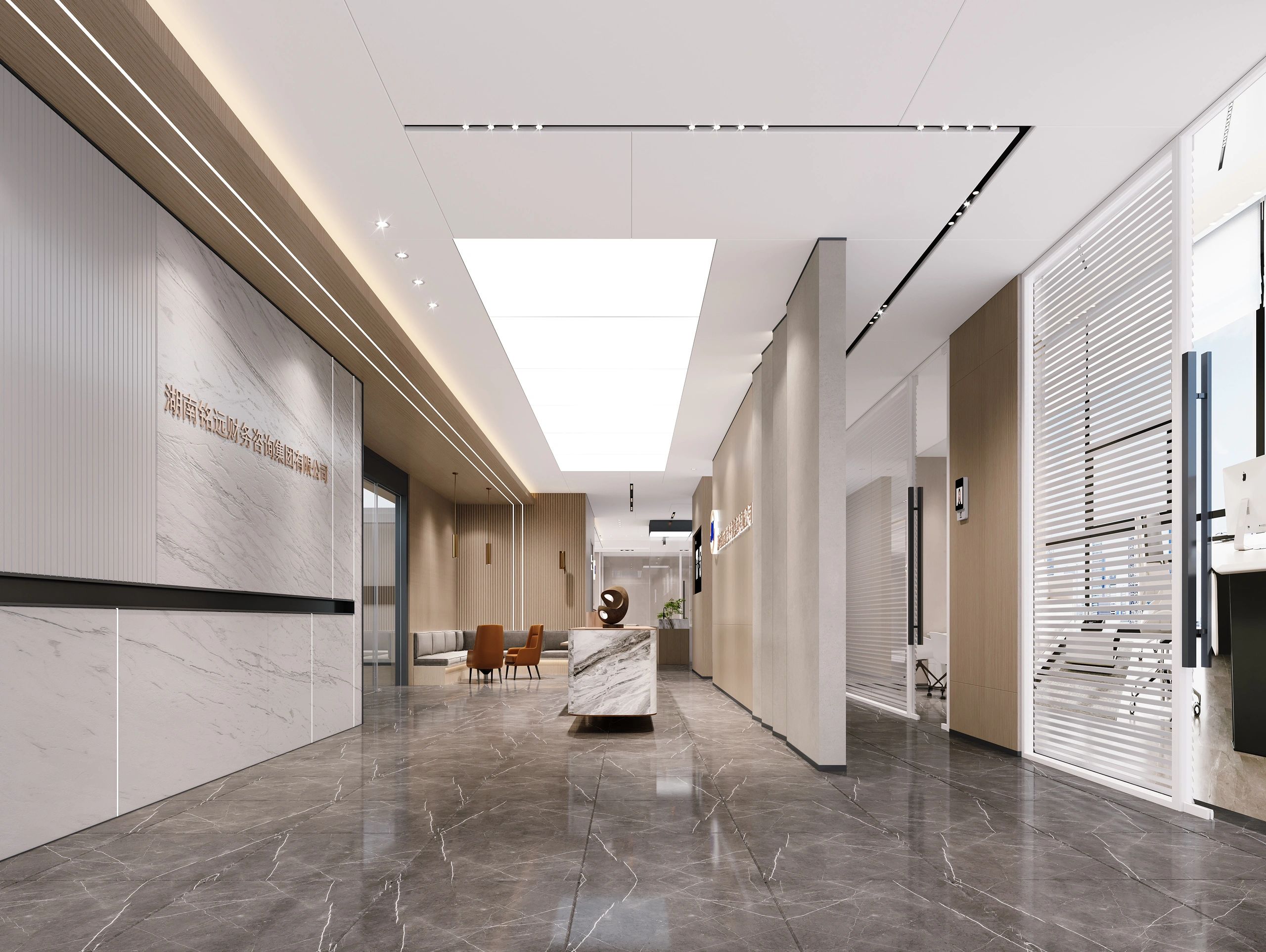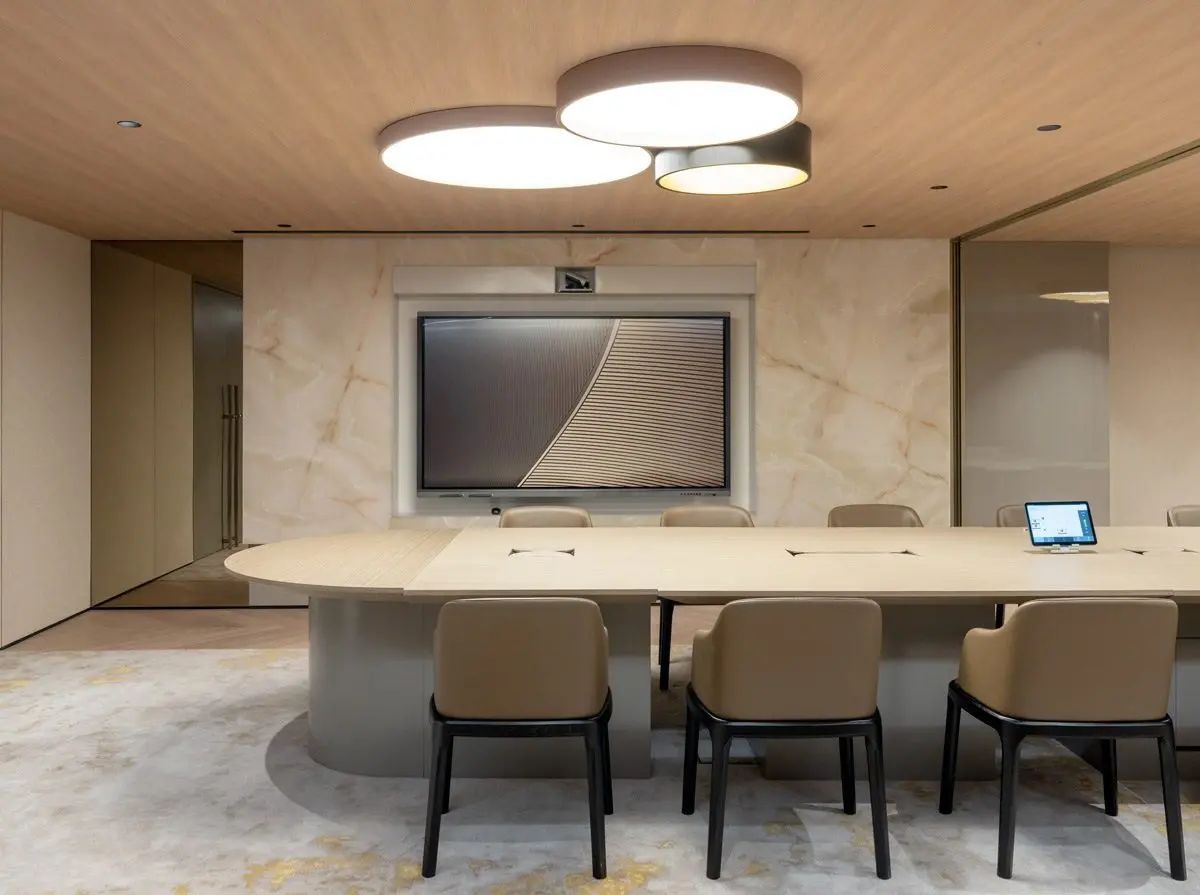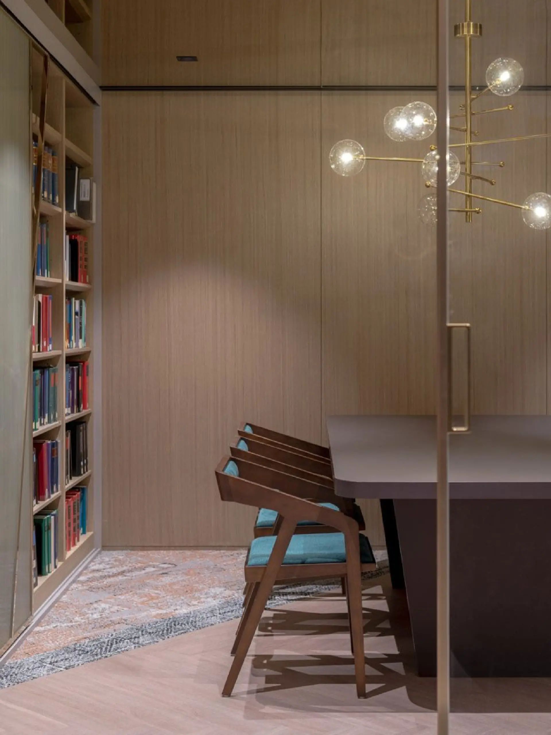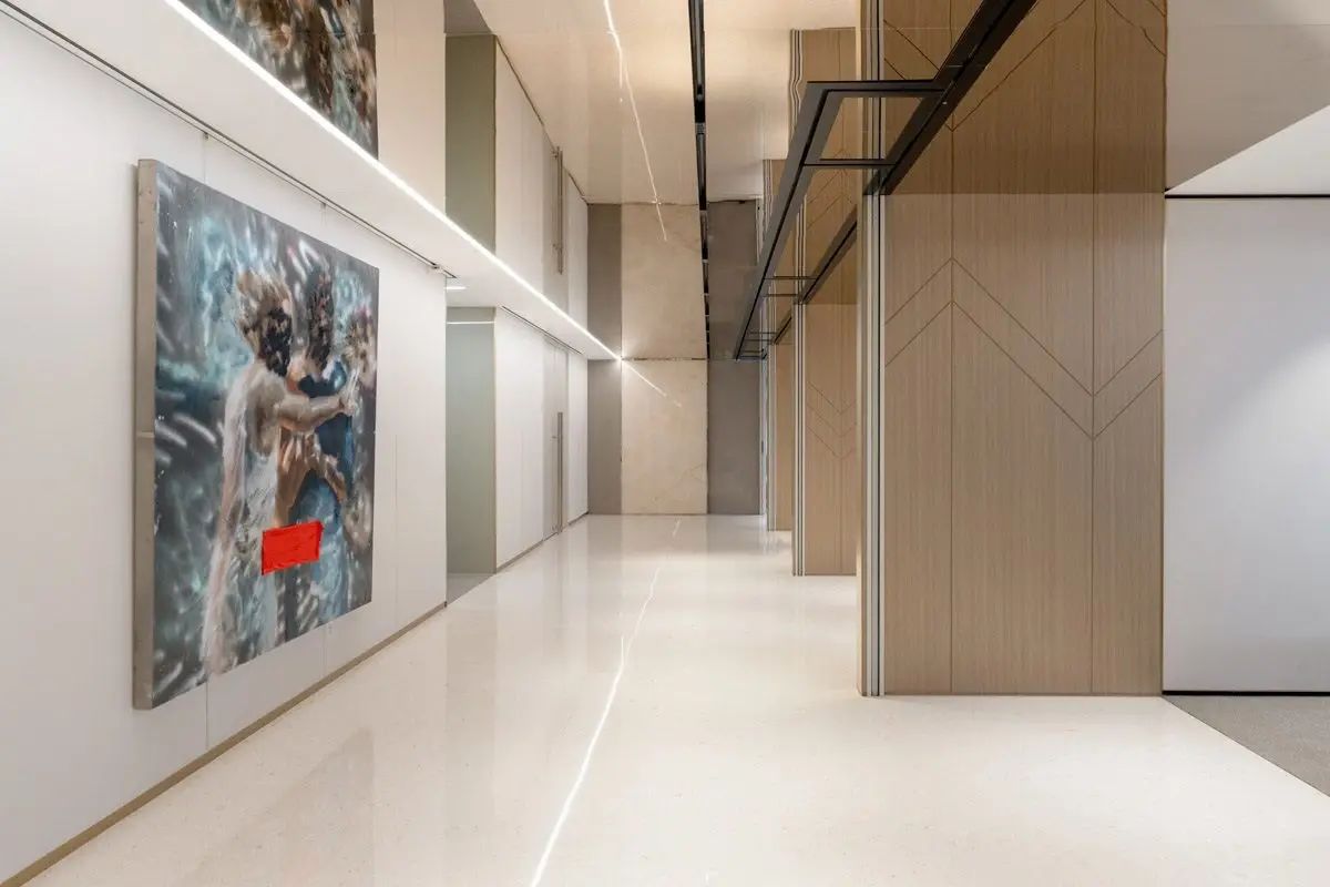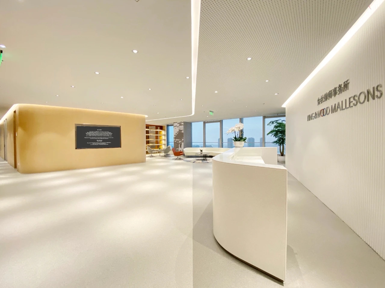 设计师取其“静”的精神,将沉静淡雅的风格立为此次设计任务的“文眼”,希望通过构建这样一间办公空间,来匹应金杜律师的专业气质。简洁的线条、素雅的色调,使得每一位进入这间办公室的人们都能感到舒适放松。斜向分立两侧的主题墙面呈现出拥抱欢迎的姿态,亲切而体贴。设计师将前厅的视野中心留给了等候区,访客在这里落座,窗外正是金陵壮阔的天际线,动静结合、内外呼应,譬喻着金杜律师与客户合作发展的前景长远辽阔,必达于无限。
