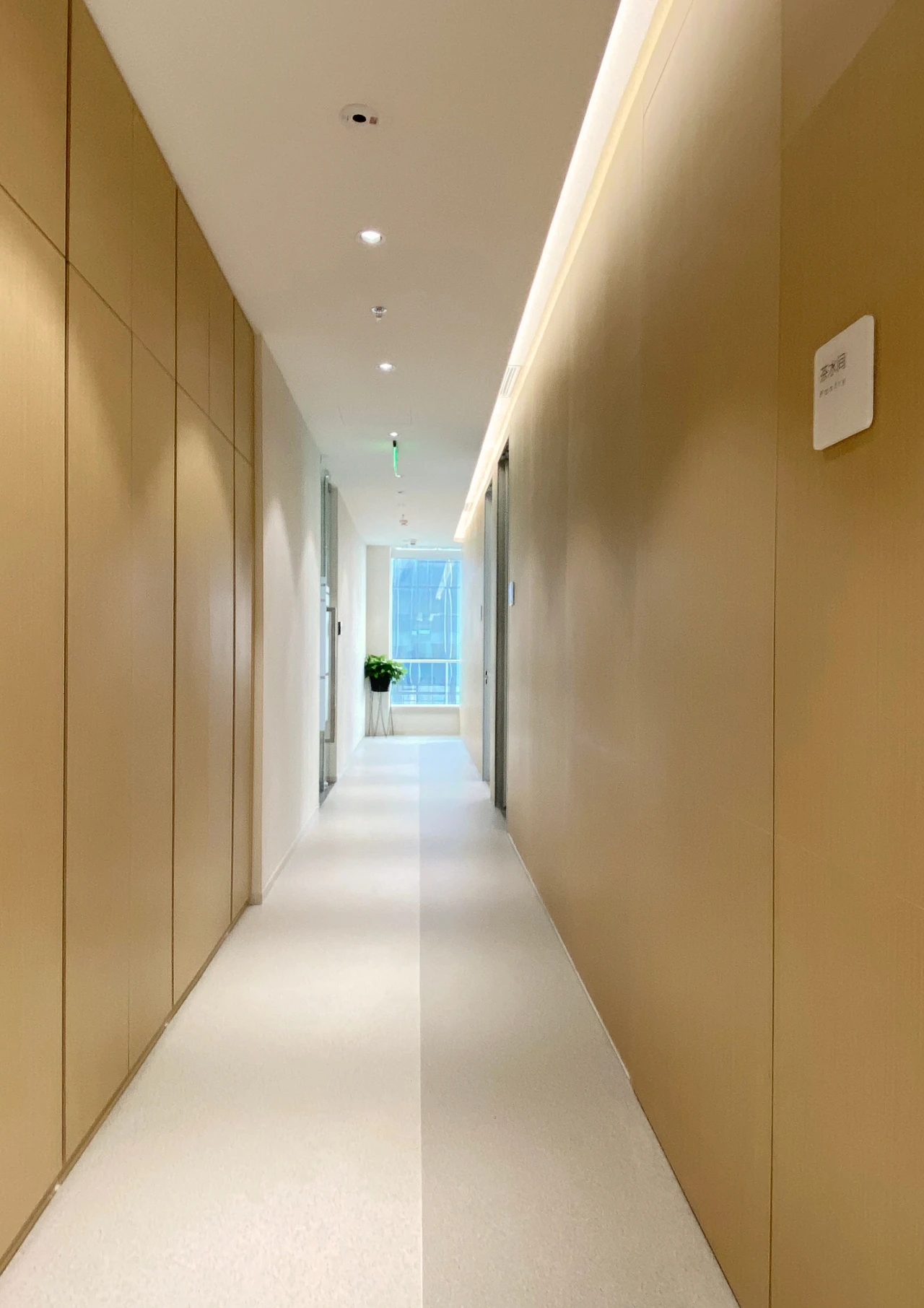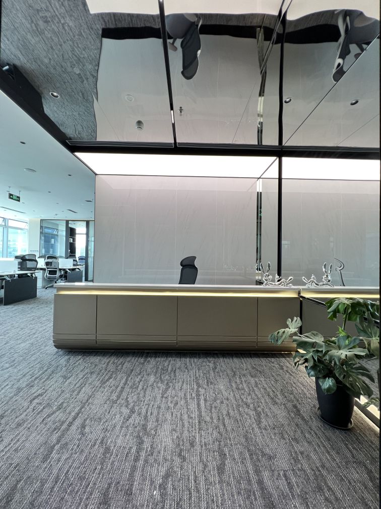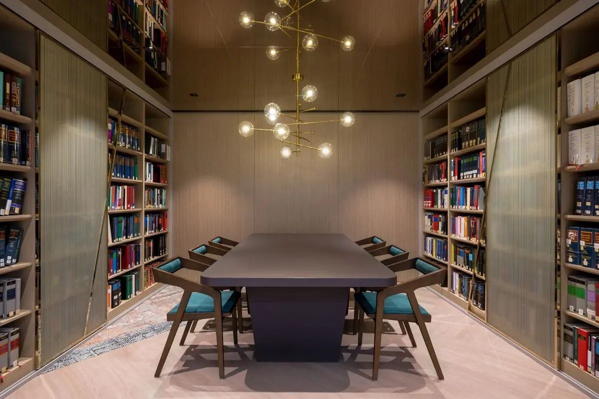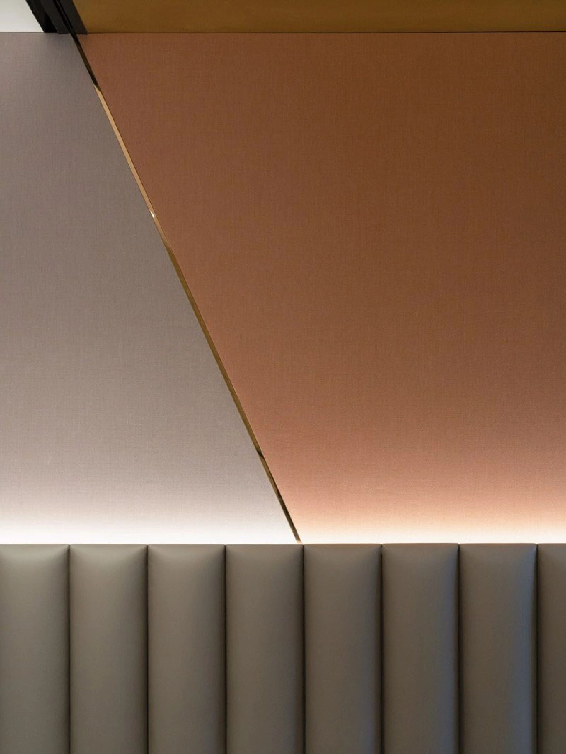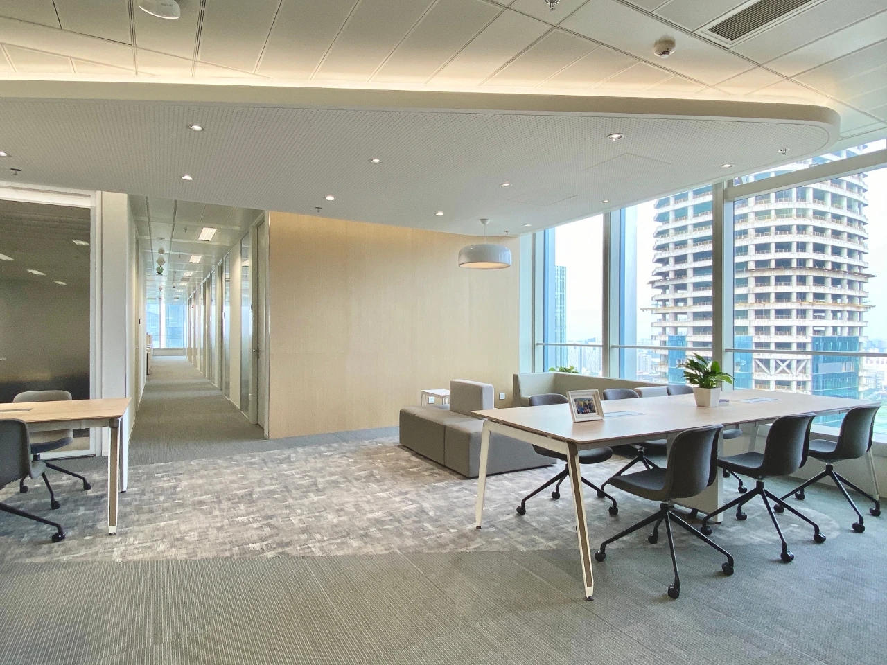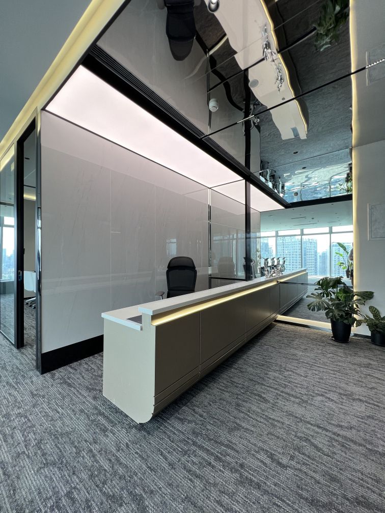 设计师取其“静”的精神,将沉静淡雅的风格立为此次设计任务的“文眼”,希望通过构建这样一间办公空间,来匹应金杜律师的专业气质。简洁的线条、素雅的色调,使得每一位进入这间办公室的人们都能感到舒适放松。斜向分立两侧的主题墙面呈现出拥抱欢迎的姿态,亲切而体贴。设计师将前厅的视野中心留给了等候区,访客在这里落座,窗外正是金陵壮阔的天际线,动静结合、内外呼应,譬喻着金杜律师与客户合作发展的前景长远辽阔,必达于无限。