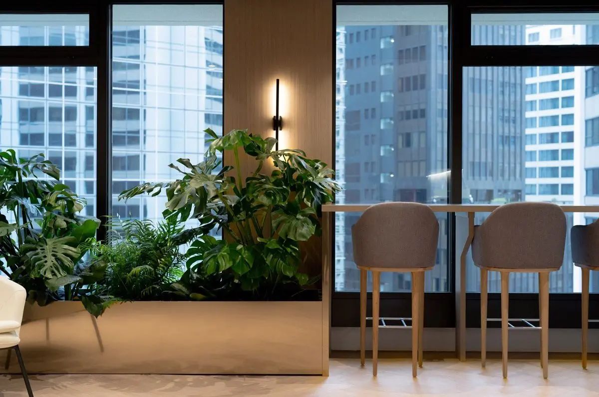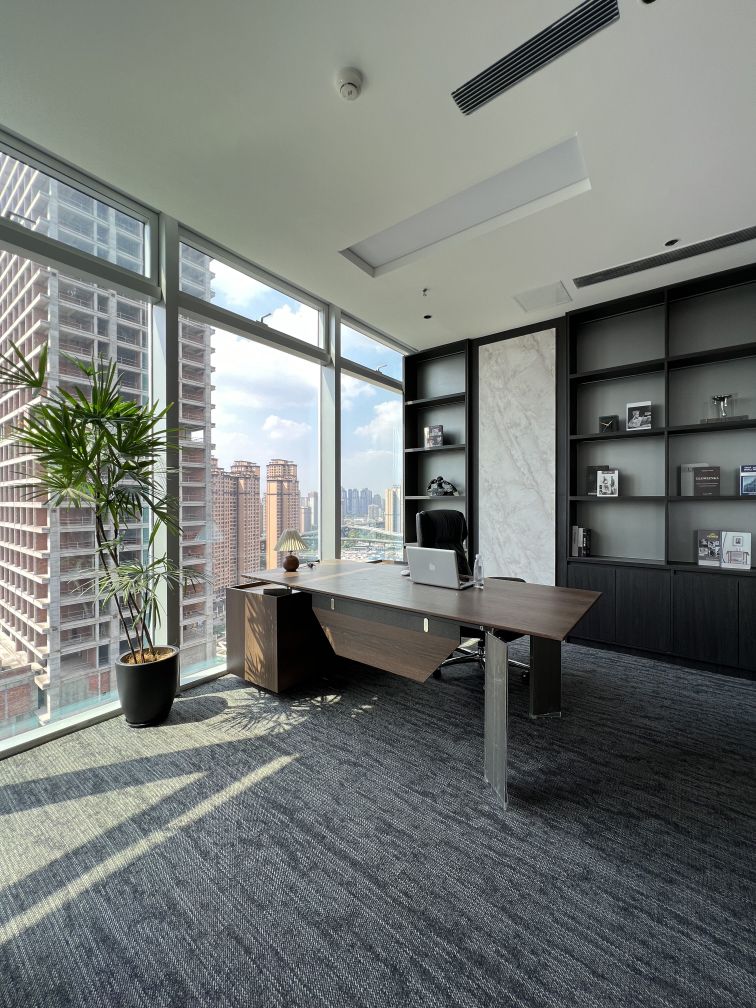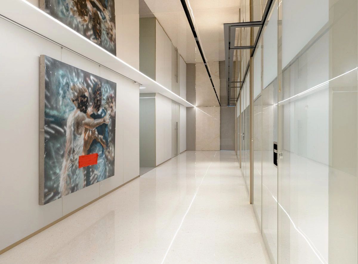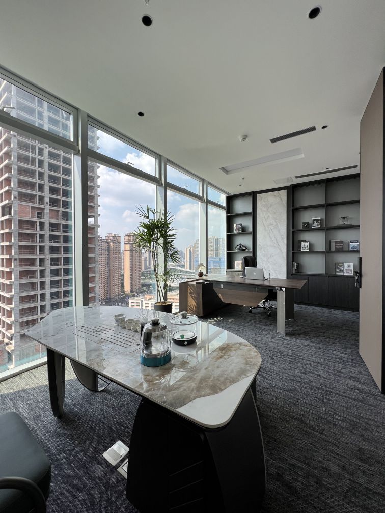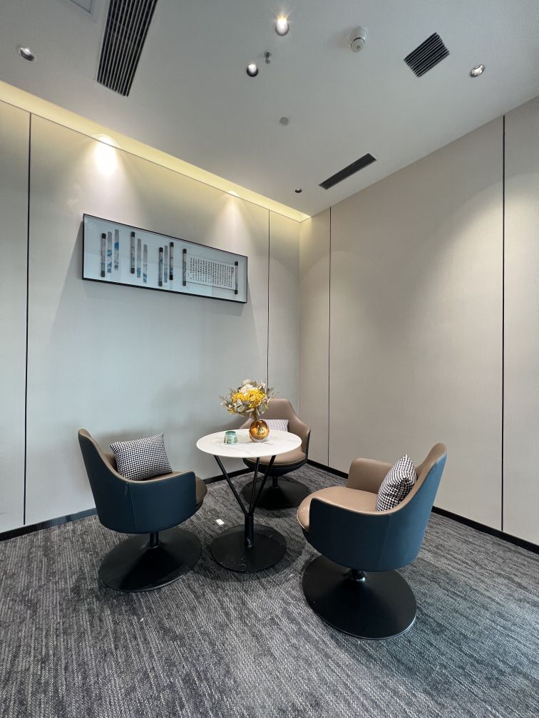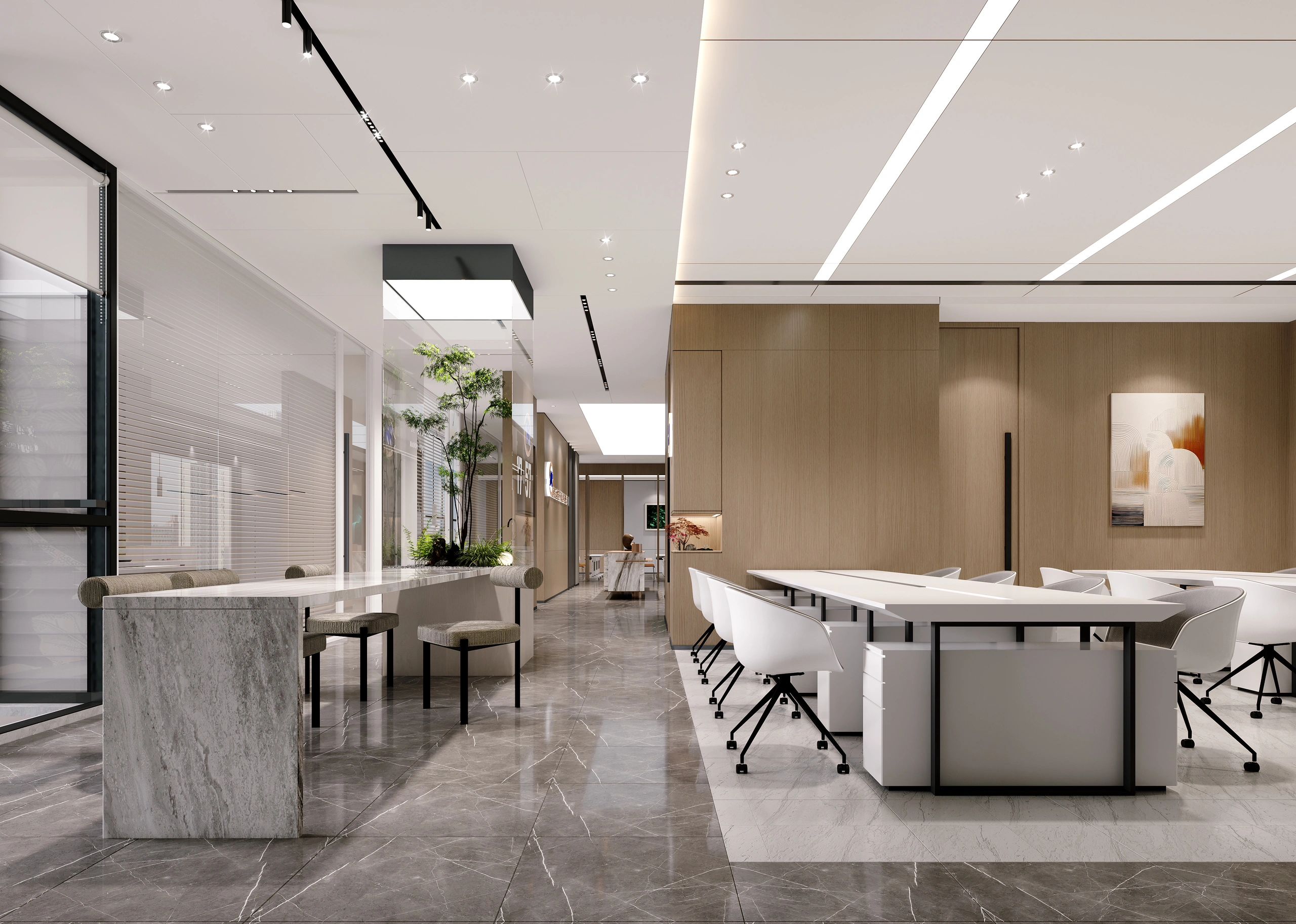 设计师取其“静”的精神,将沉静淡雅的风格立为此次设计任务的“文眼”,希望通过构建这样一间办公空间,来匹应金杜律师的专业气质。简洁的线条、素雅的色调,使得每一位进入这间办公室的人们都能感到舒适放松。斜向分立两侧的主题墙面呈现出拥抱欢迎的姿态,亲切而体贴。设计师将前厅的视野中心留给了等候区,访客在这里落座,窗外正是金陵壮阔的天际线,动静结合、内外呼应,譬喻着金杜律师与客户合作发展的前景长远辽阔,必达于无限。