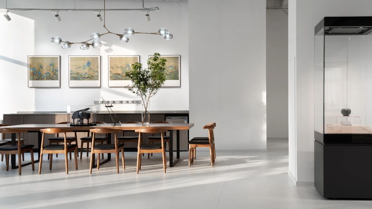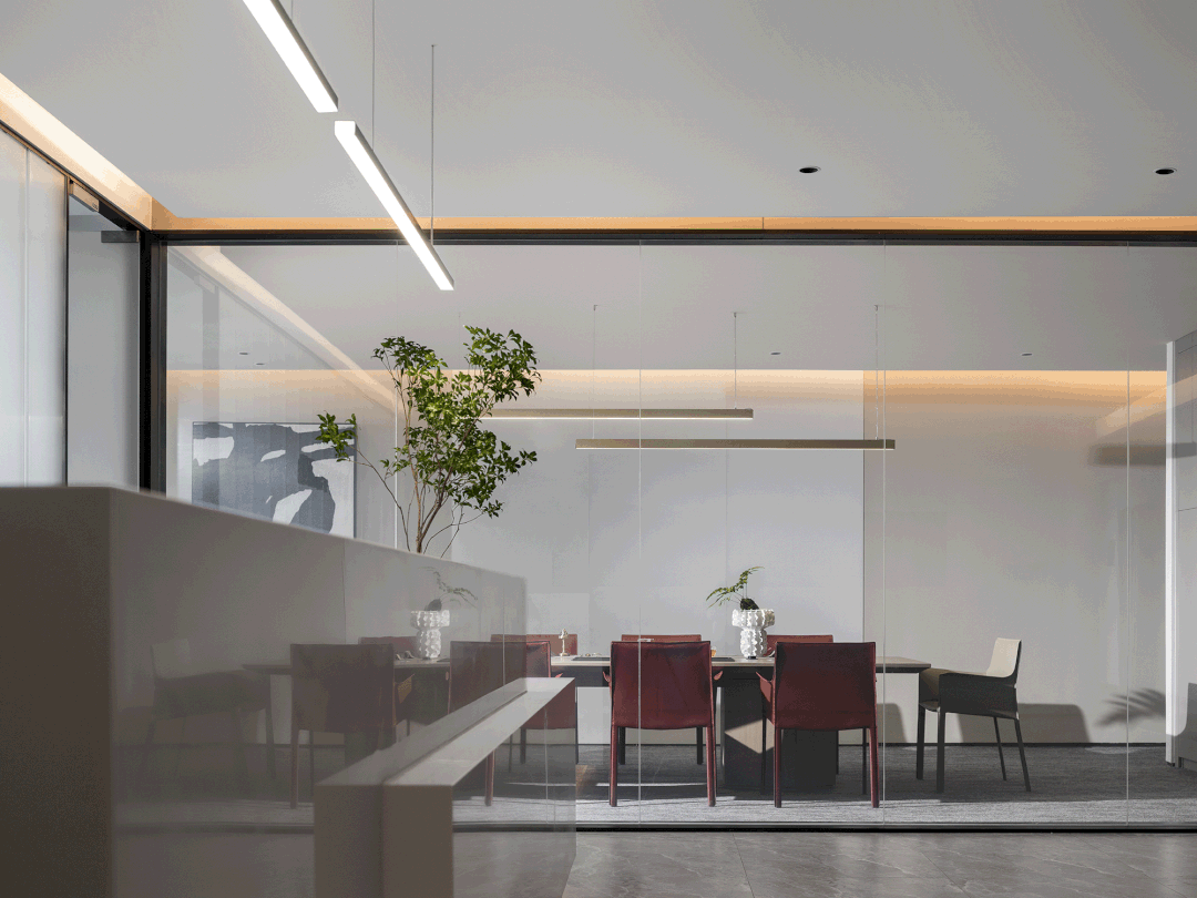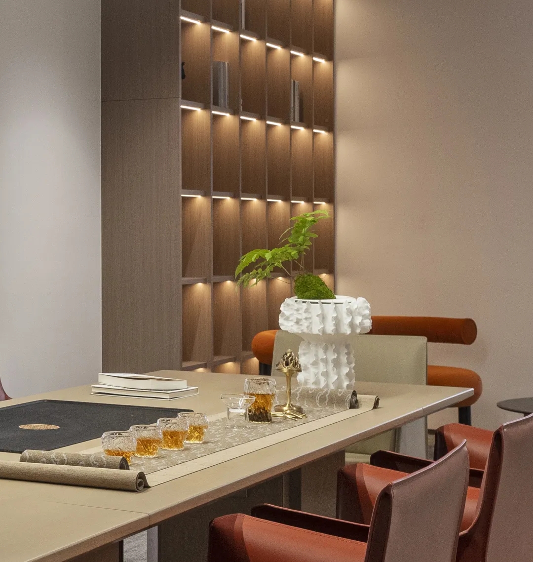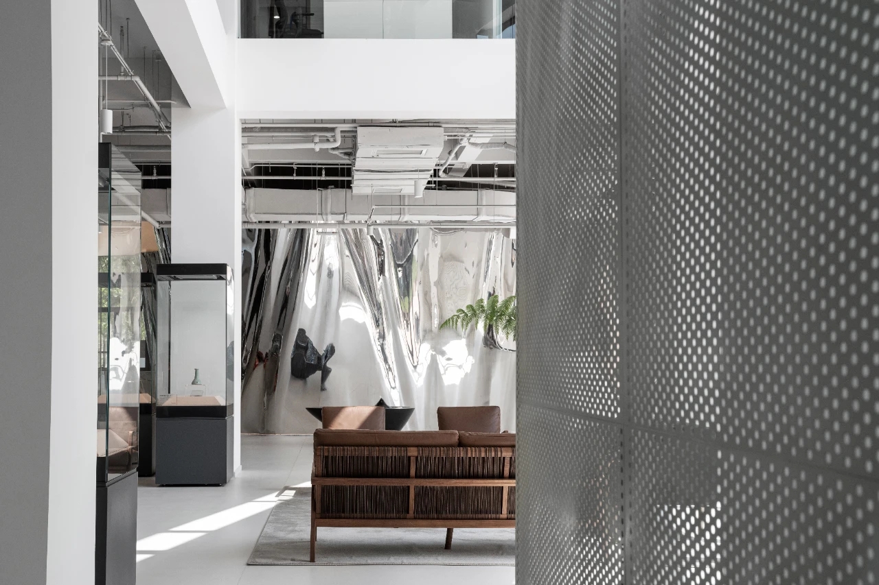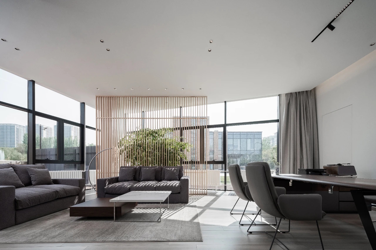 电离玻璃与山水屏风将一楼办公室与公共区域有效隔离开来,两侧艺术藏品弱化生活与审美文化之间的边界。白昼日光穿过木格栅屏风投射到沙发与地板上,灵动的倒影,将云卷云舒的意向动态呈现。绿植延续室外的盎然绿色,与周遭蓬勃生机形成序列,使空间更显沉静且利于思辨。