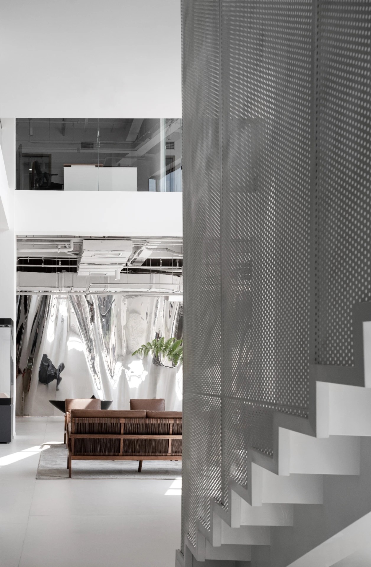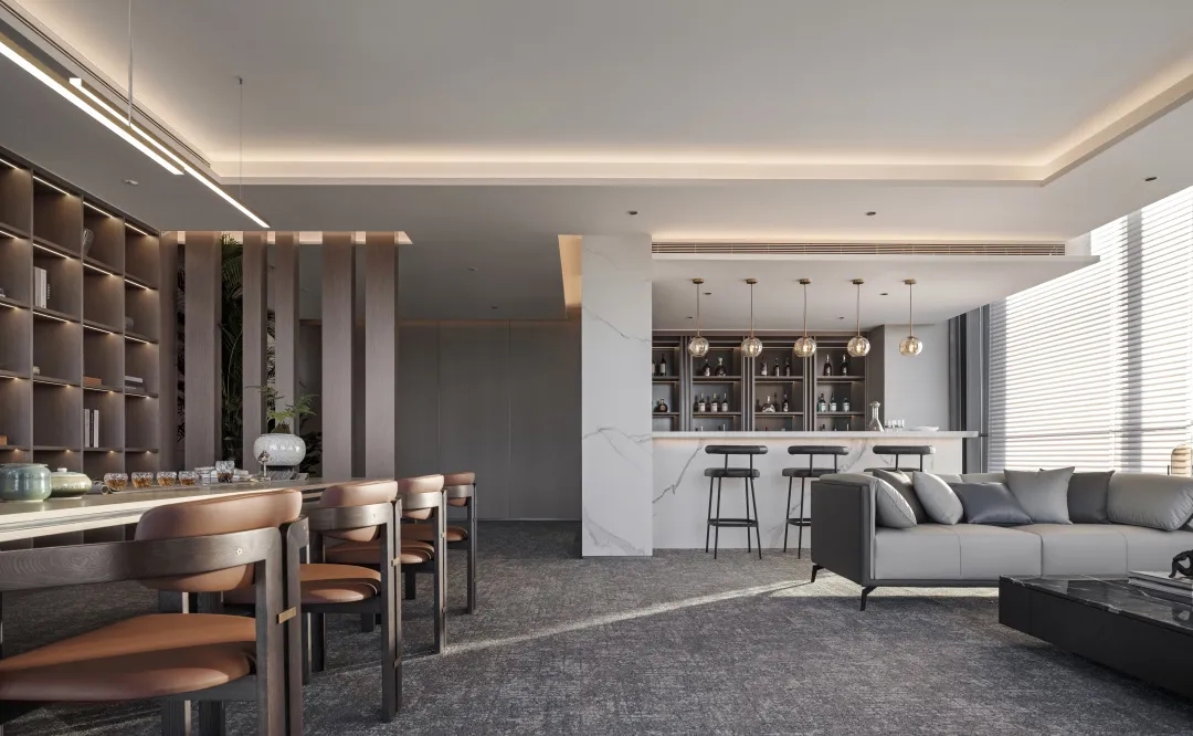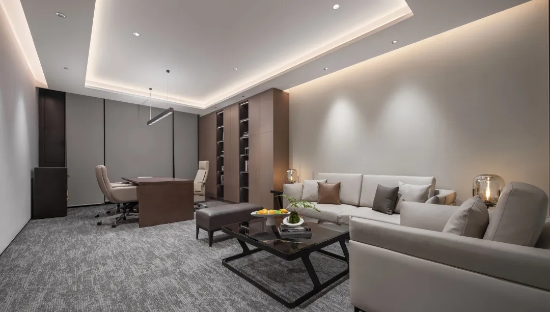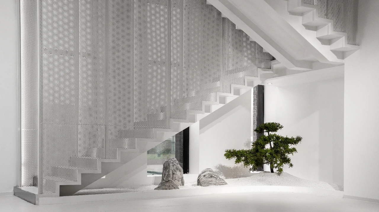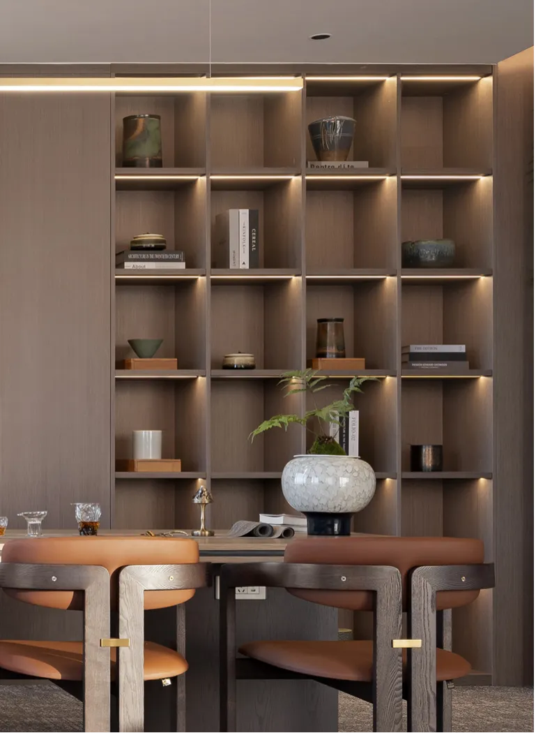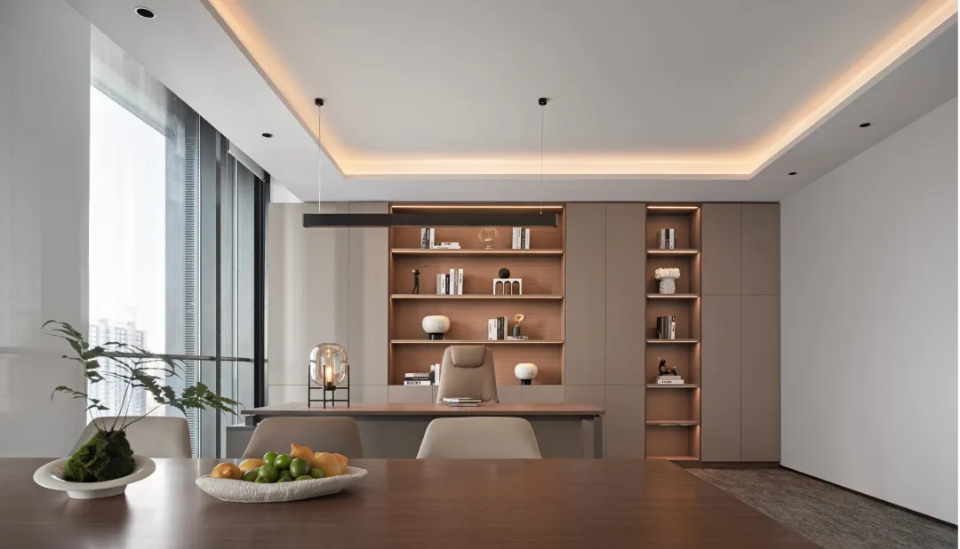 电离玻璃与山水屏风将一楼办公室与公共区域有效隔离开来,两侧艺术藏品弱化生活与审美文化之间的边界。白昼日光穿过木格栅屏风投射到沙发与地板上,灵动的倒影,将云卷云舒的意向动态呈现。绿植延续室外的盎然绿色,与周遭蓬勃生机形成序列,使空间更显沉静且利于思辨。