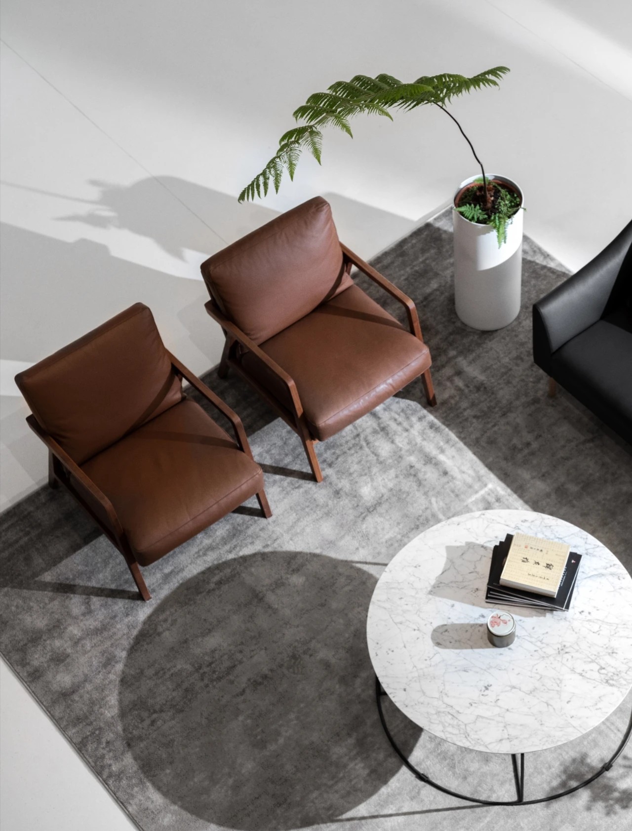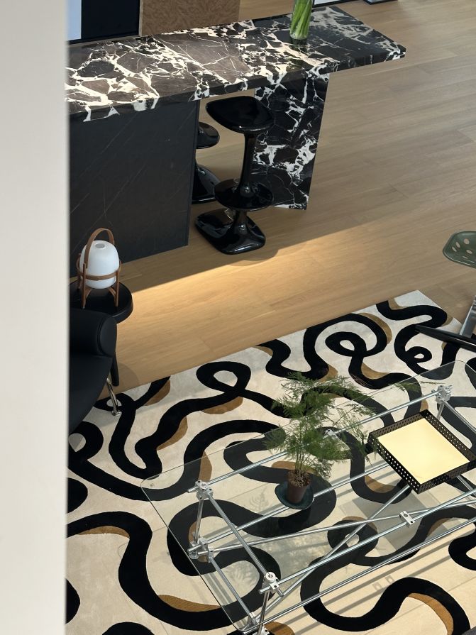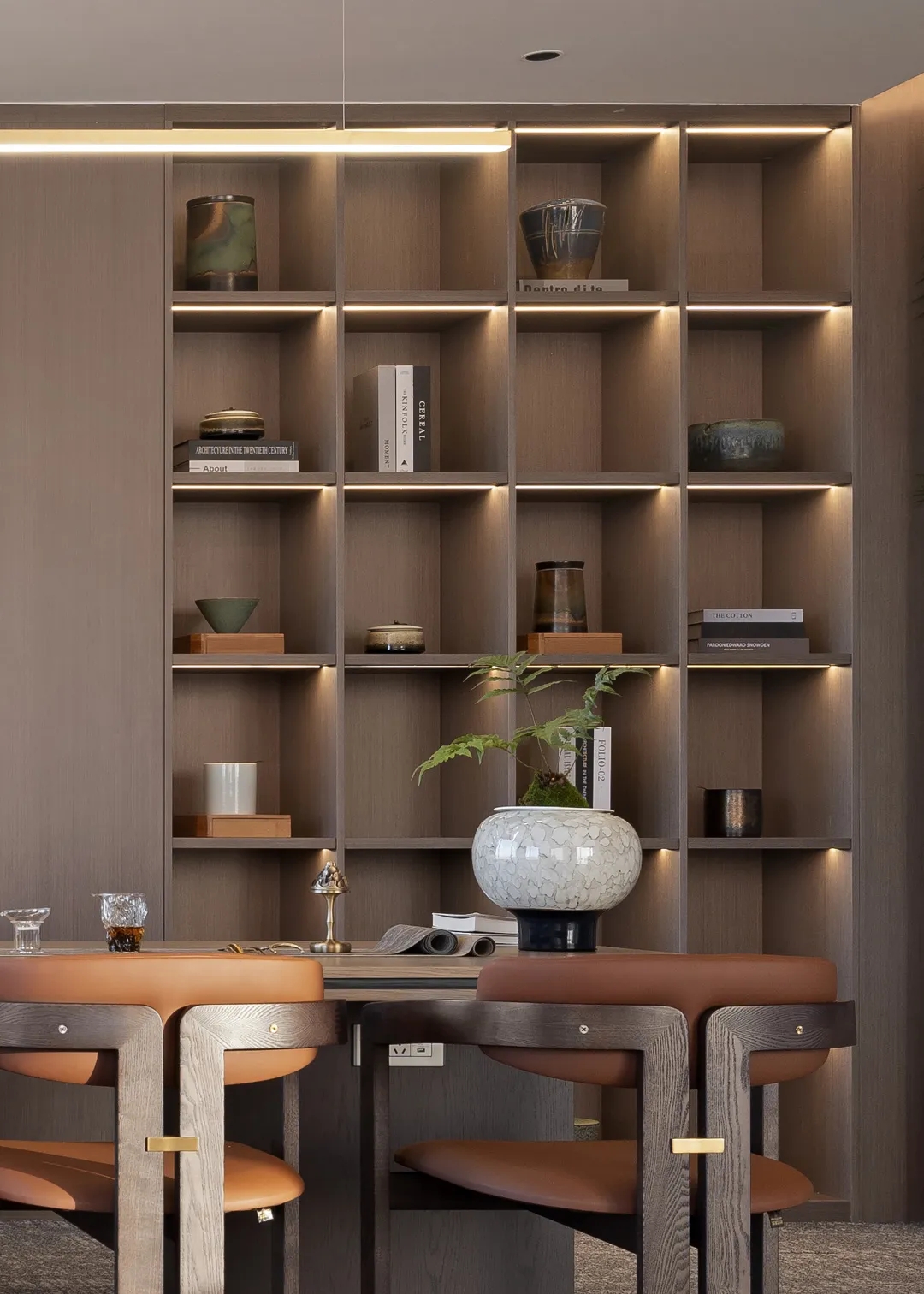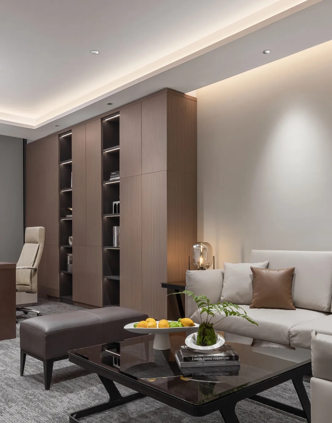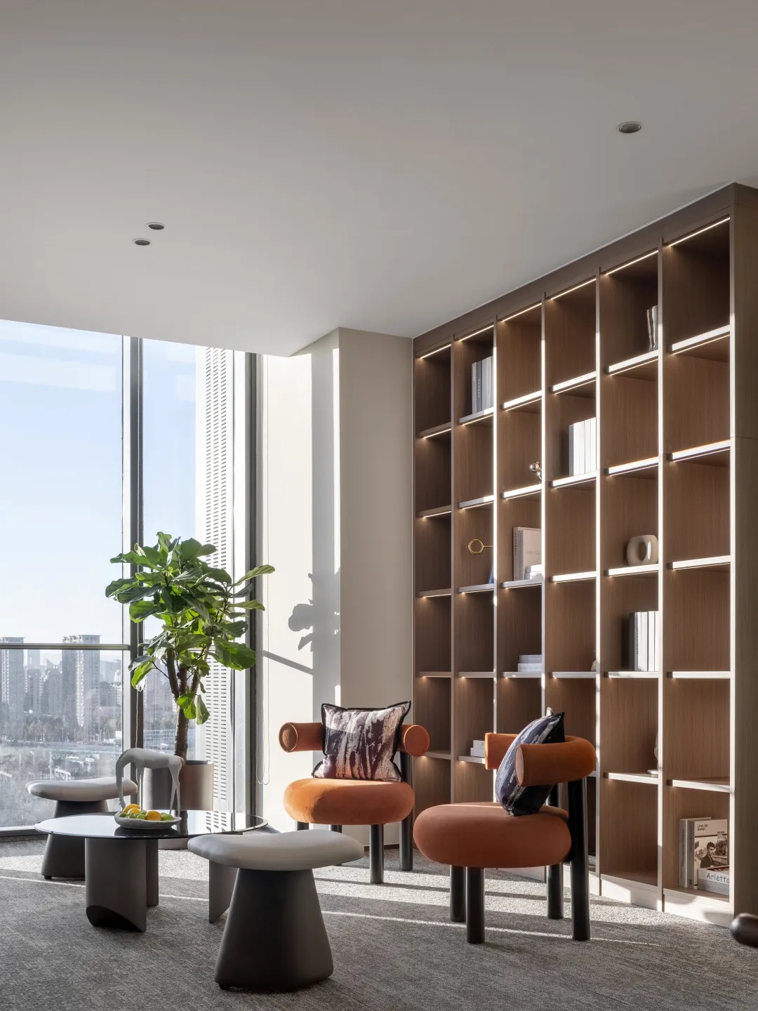 电离玻璃与山水屏风将一楼办公室与公共区域有效隔离开来,两侧艺术藏品弱化生活与审美文化之间的边界。白昼日光穿过木格栅屏风投射到沙发与地板上,灵动的倒影,将云卷云舒的意向动态呈现。绿植延续室外的盎然绿色,与周遭蓬勃生机形成序列,使空间更显沉静且利于思辨。