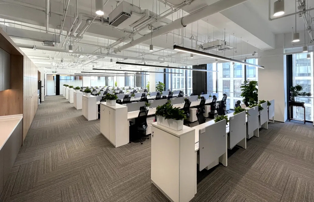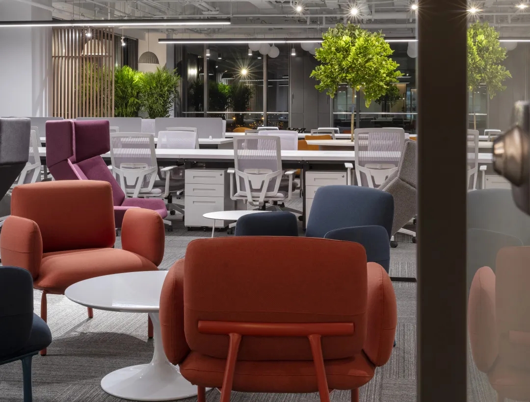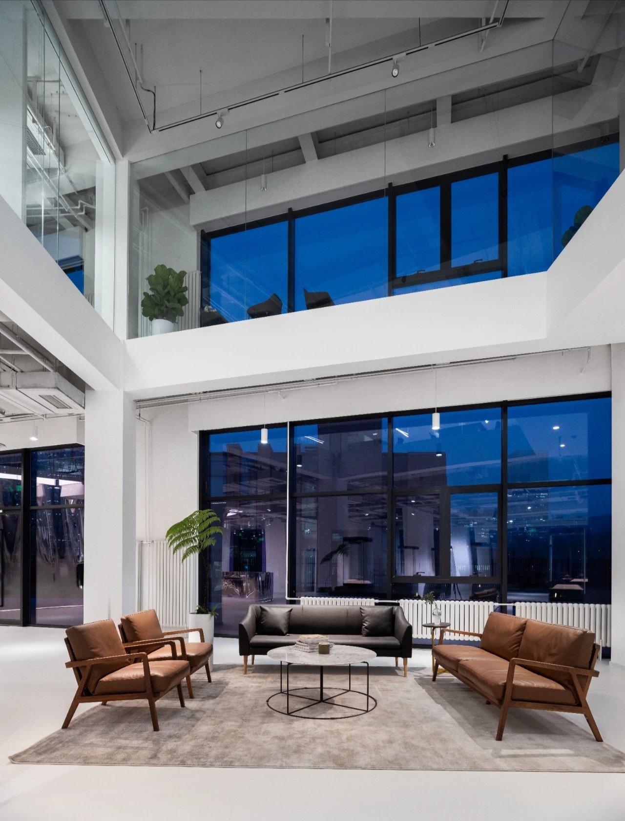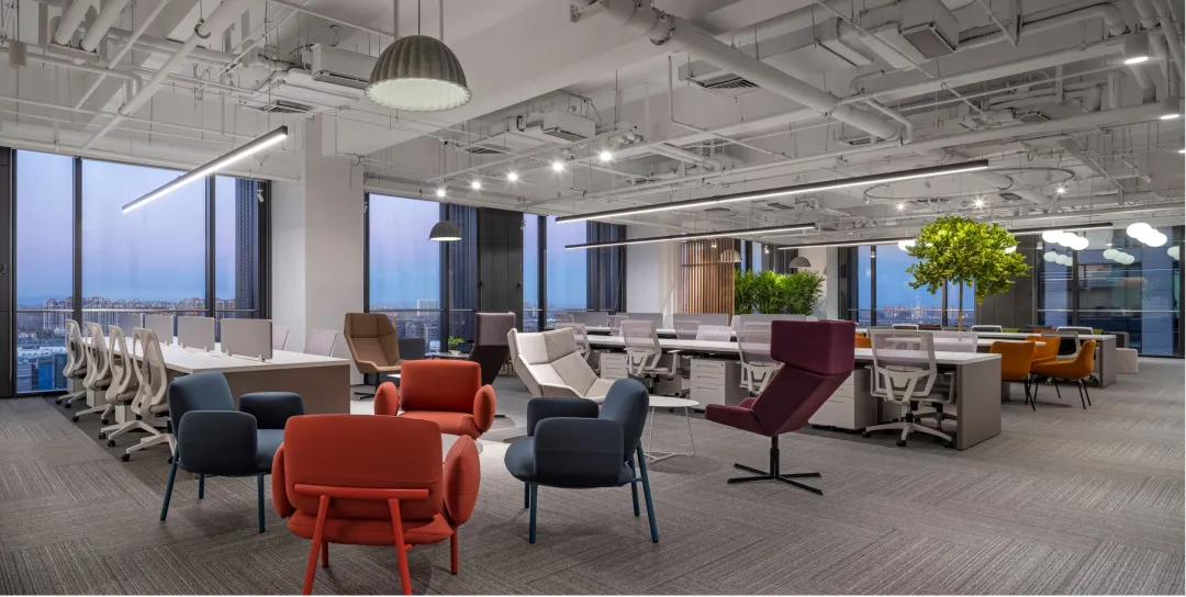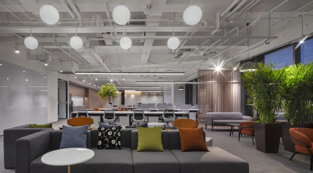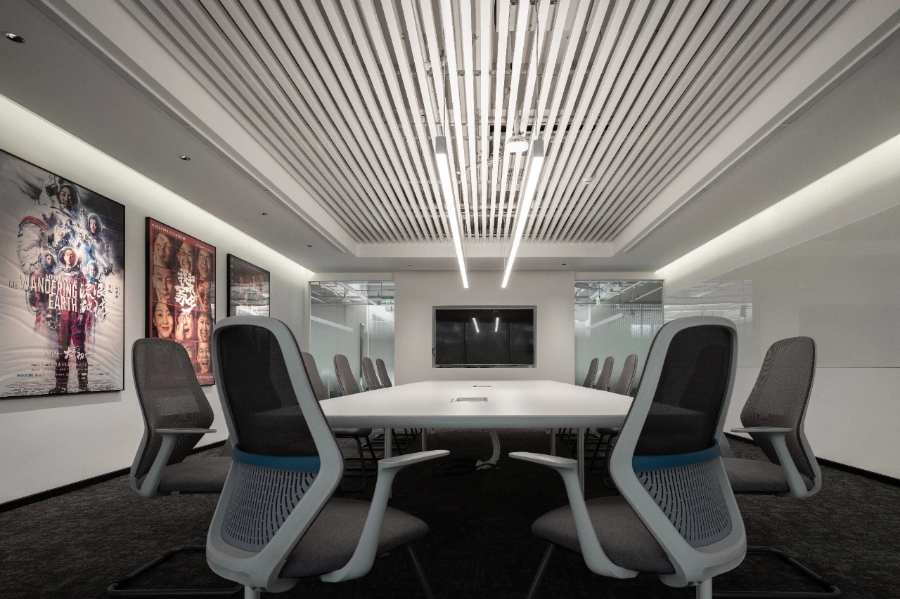 二层办公区视野开阔,公共区域长条形灯光营造柔和明亮氛围,休闲区大面积通体落地窗将景色最大限度纳入空间,白昼与晨昏之际,时令之景变幻万千,会议室宽敞大气,玻璃门窗通透澄明,电影海报象征性游走于空间中,奠定场域精神气场之余与所属行业彼此呼应。