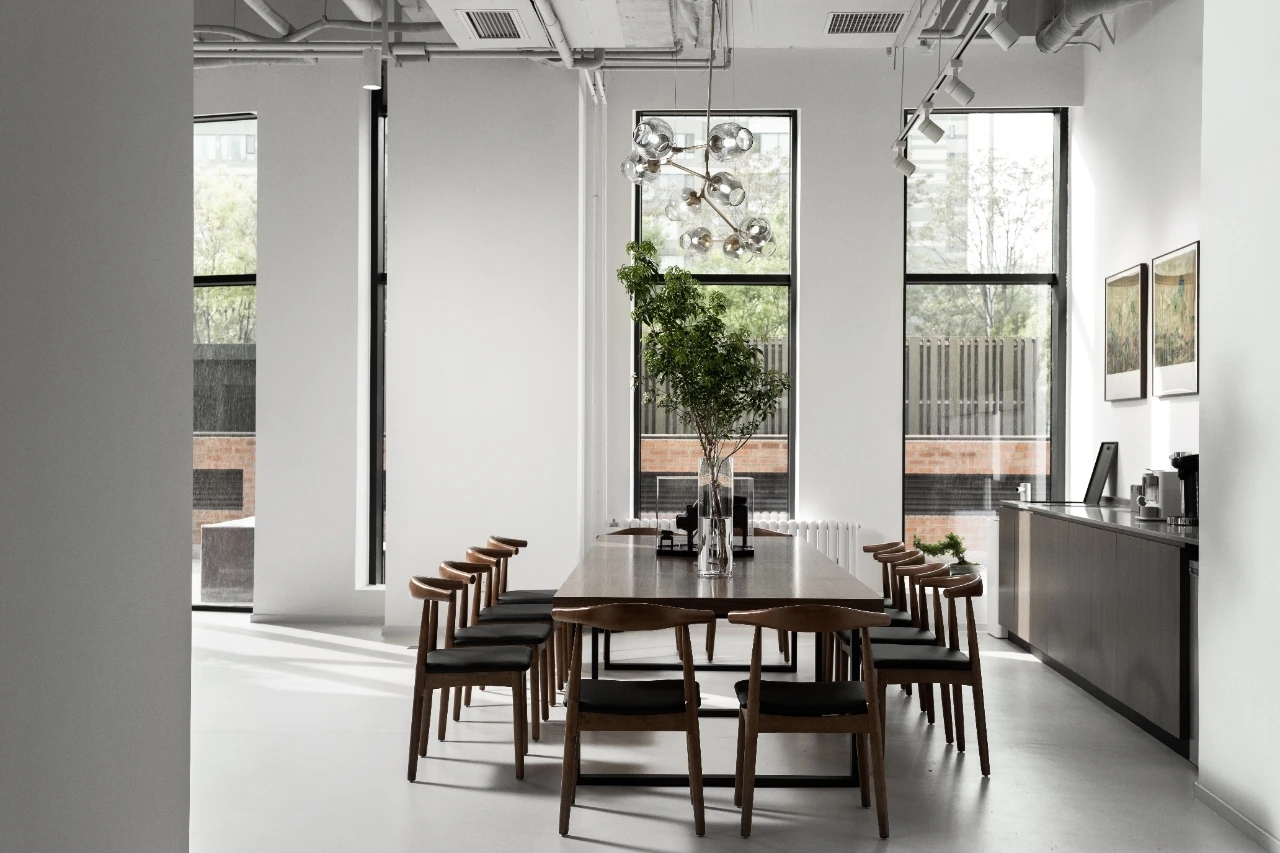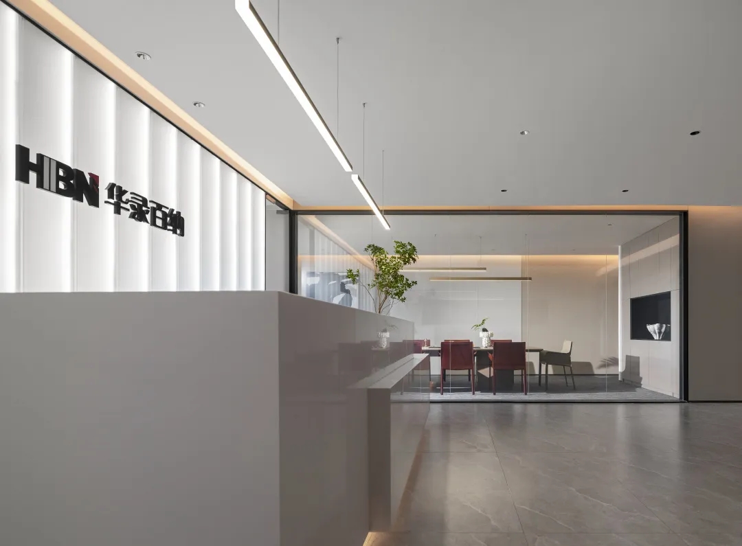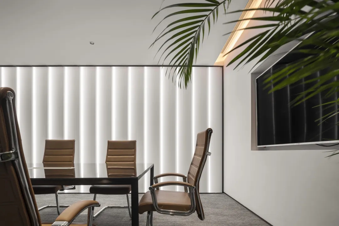 中型会议室用于接待访客与召开项目组会,介于正式会议与头脑风暴的会议空间,释放出惬意与自然的气息。中型会议与前厅连为一体,延续了简洁、现代的空间气息,既独立,又与整体相互牵制。