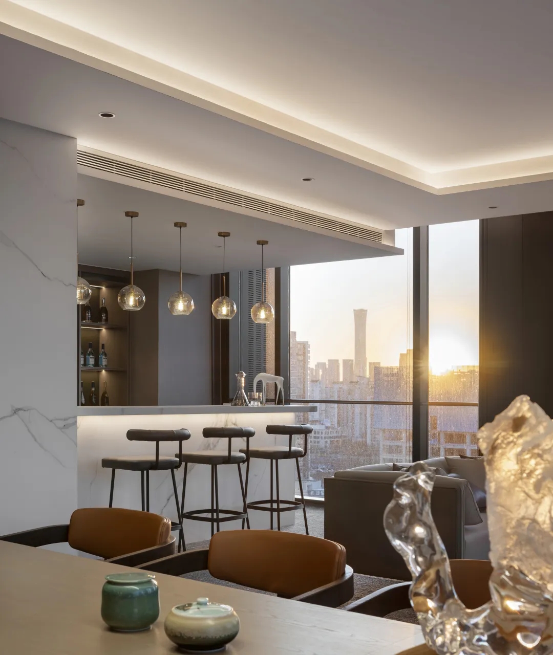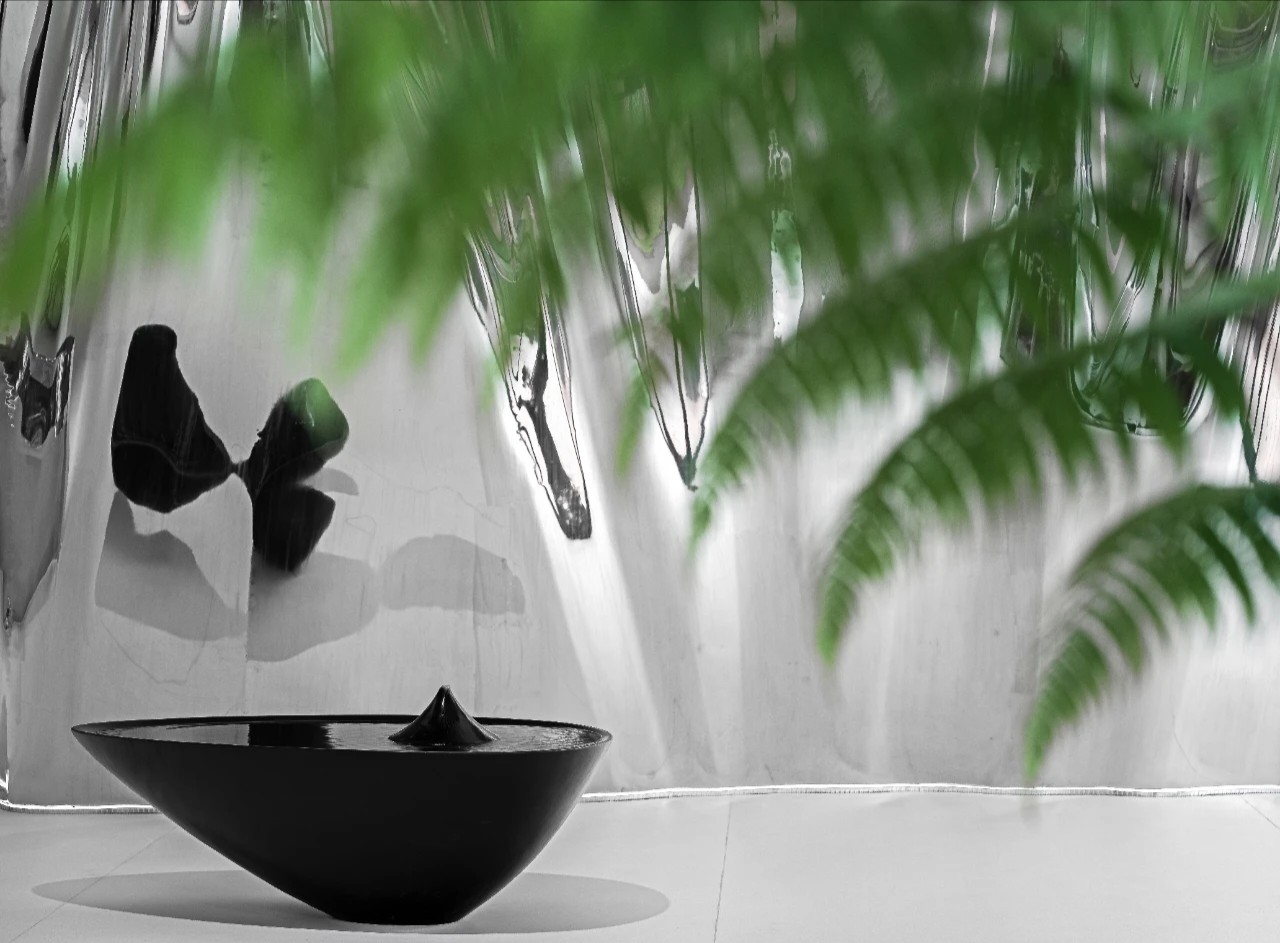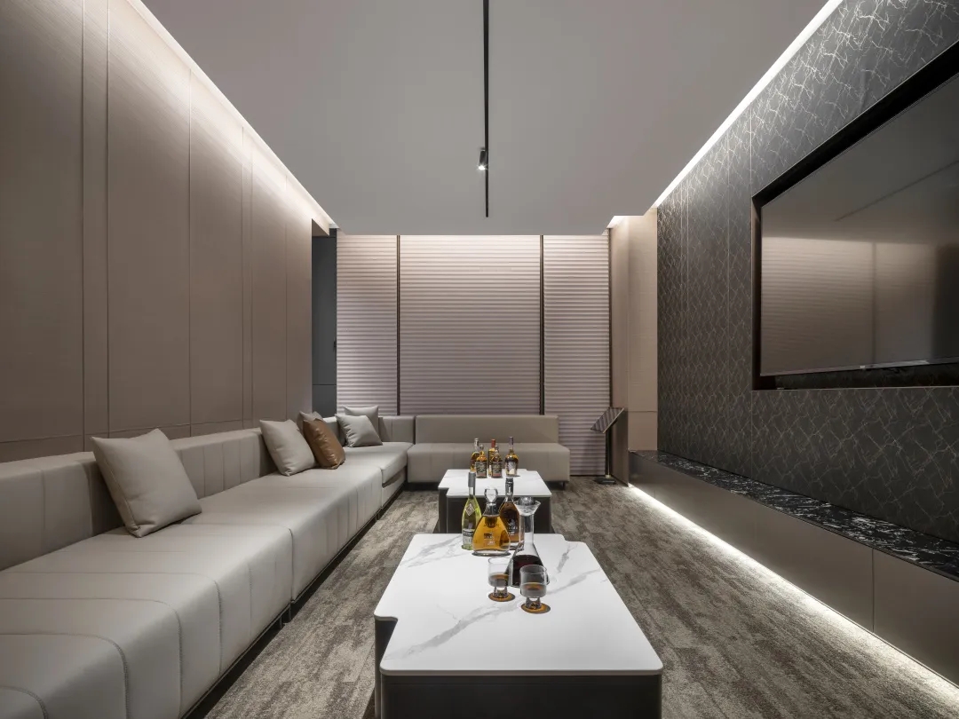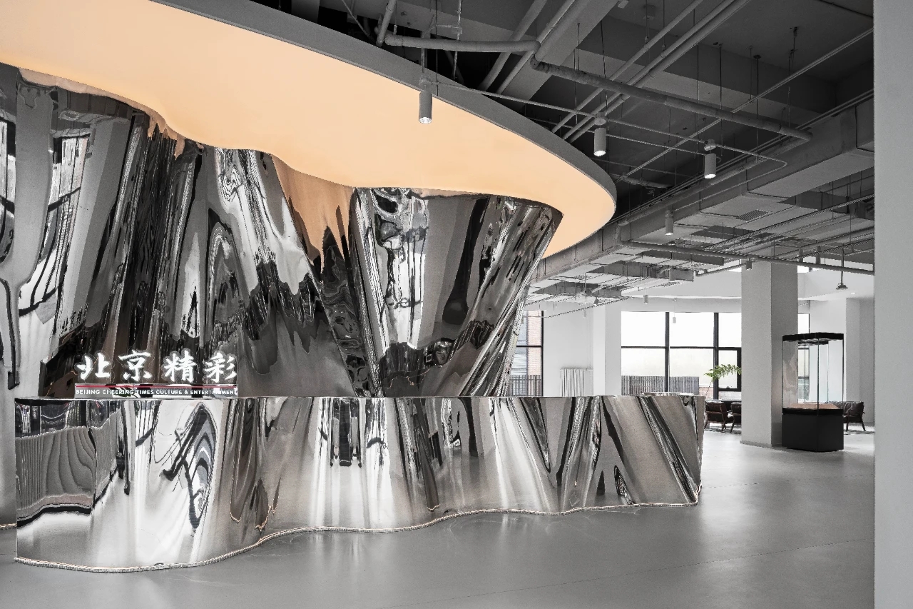 前厅接待处山水镜面装置既是空间结构,亦是装饰雕塑,曲线舒展,光影流动,颇具「烟销日出不见人,欸乃一声山水绿」之意。水滴形喷泉装置,伴随自然水声连结静谧、诗意与未来。 山水装置上增加了可以调节冷暖与亮度的软膜天花面光,同时地面增设软性灯带让灯光于下侧照亮整个装置,泾渭分明的十二时辰,空间的界定与镜面反映存在一种相互呼应、似是而非的朦胧感,在漫长的年代里,山水叠印了一代又一代人的目光,这正是属于东方的人文记忆与美学历史”设计师说道。