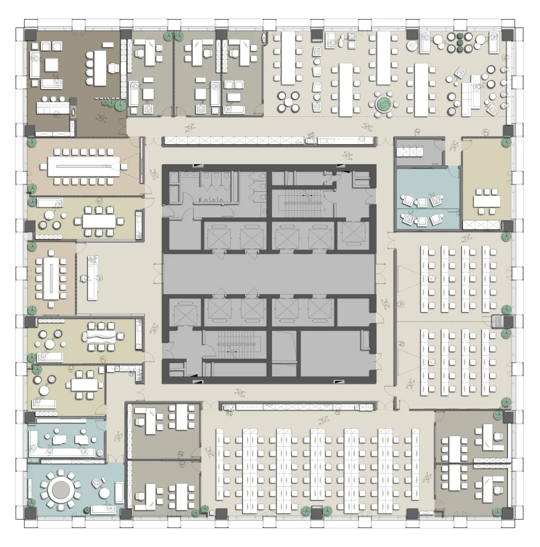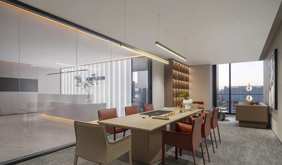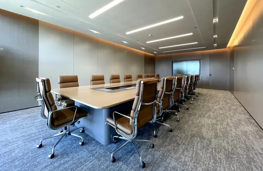 延续整体空间简洁、现代的调性,大型会议室简约而不失格调,用于接待客户与召开正式会议,整体以灰色与金色为主调,采用简练的硬装,去除繁杂的装饰,呈现出沉稳、大气的质感。