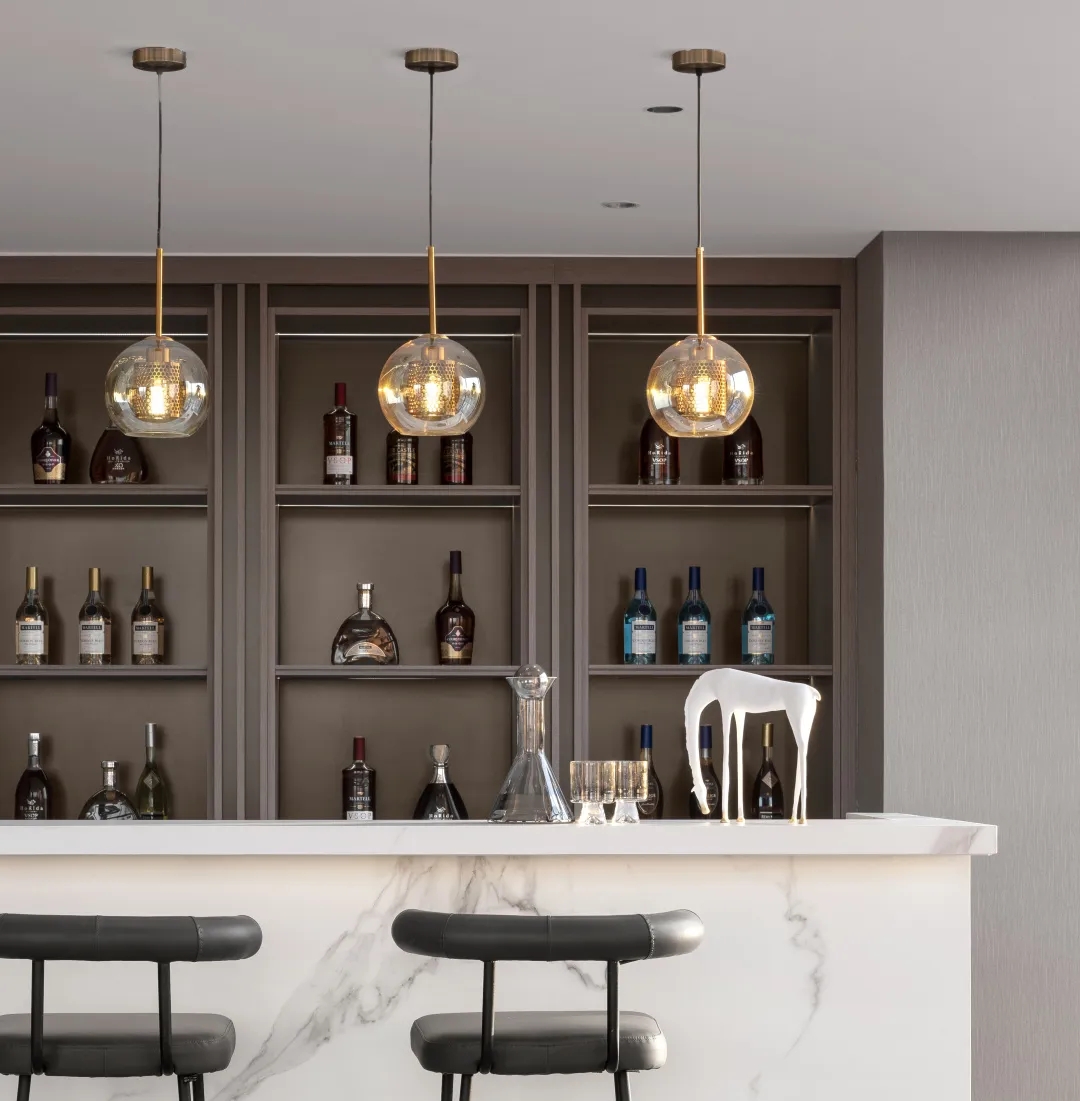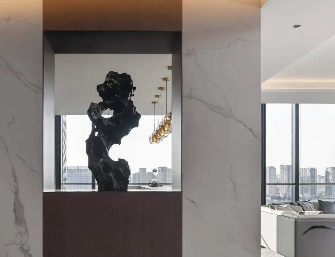 拾级而上,楼梯顶端处流浪地球的道具映入眼帘,通过从业主工作中的电影道具采撷灵感并布置其中,建构人与空间情感联通的桥梁。“我们不是艺术家,更像是倾听者,通过想客户之“想”,捕捉他们的内在心理需求,并不断地梳理、细化、描摹情感图像,最后完美呈现出来”设计师对此解释道。