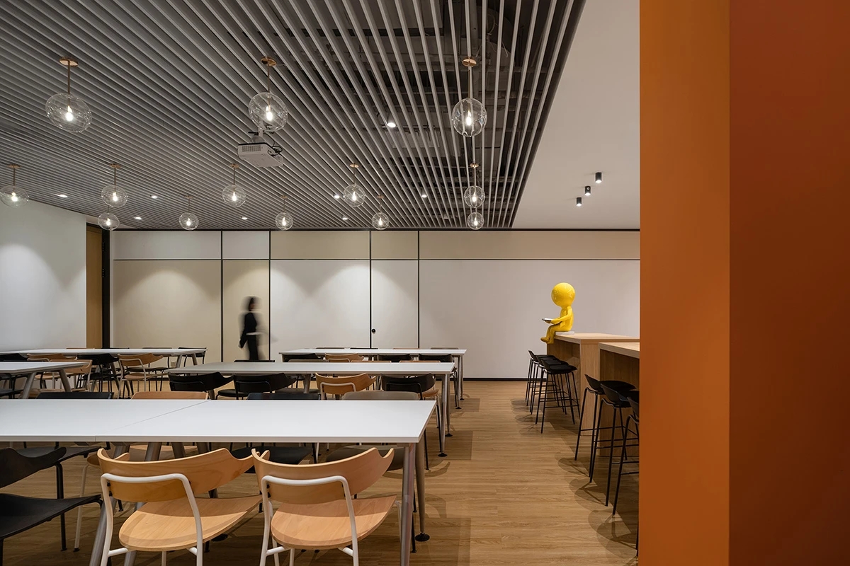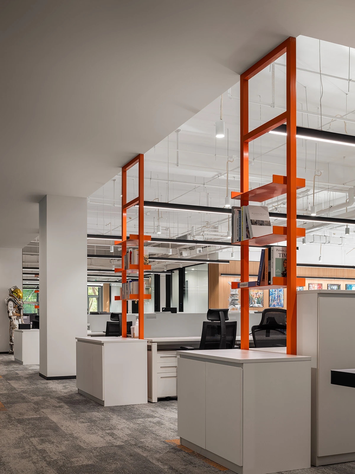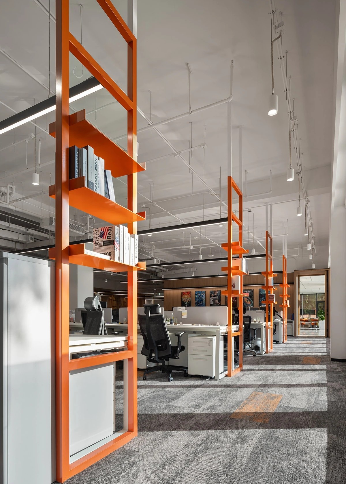 白描任写意,落拓有韵成。统一的灰白色调,“撑开”素练简约的画布,尽显公共办公区的开阔和轩敞。返璞归真的空间静谧如画,浅色调的克制与沉稳,烘托质朴与“虚怀若谷”的包容气场。长桌一端,梯形置物架“矗立”,提供多元化便捷收纳体验,而橙色的活泼之韵,成为全景场域中的显象,引起视觉观感的对比与糅合,升华“和而不同,并蓄兼收”的空间内涵。