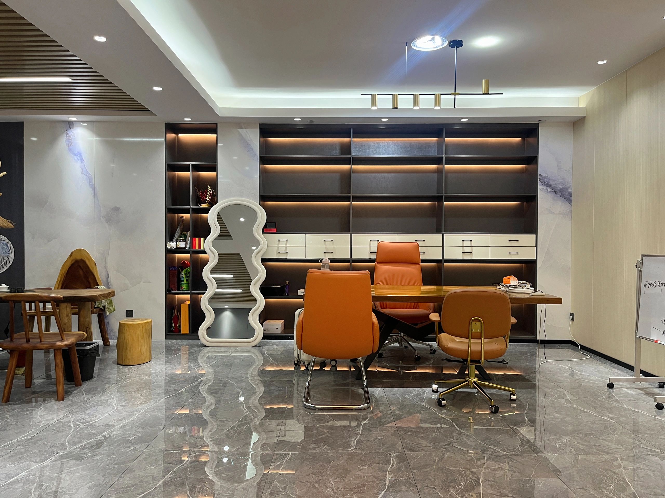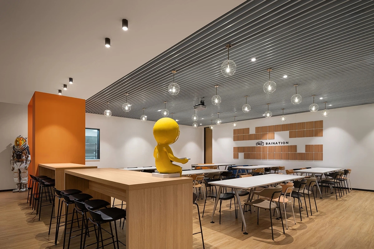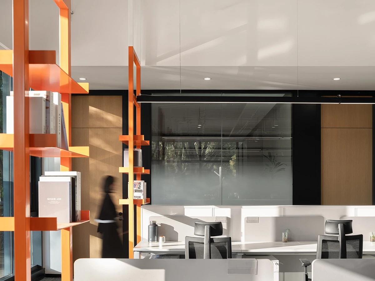 白描任写意,落拓有韵成。统一的灰白色调,“撑开”素练简约的画布,尽显公共办公区的开阔和轩敞。返璞归真的空间静谧如画,浅色调的克制与沉稳,烘托质朴与“虚怀若谷”的包容气场。长桌一端,梯形置物架“矗立”,提供多元化便捷收纳体验,而橙色的活泼之韵,成为全景场域中的显象,引起视觉观感的对比与糅合,升华“和而不同,并蓄兼收”的空间内涵。
