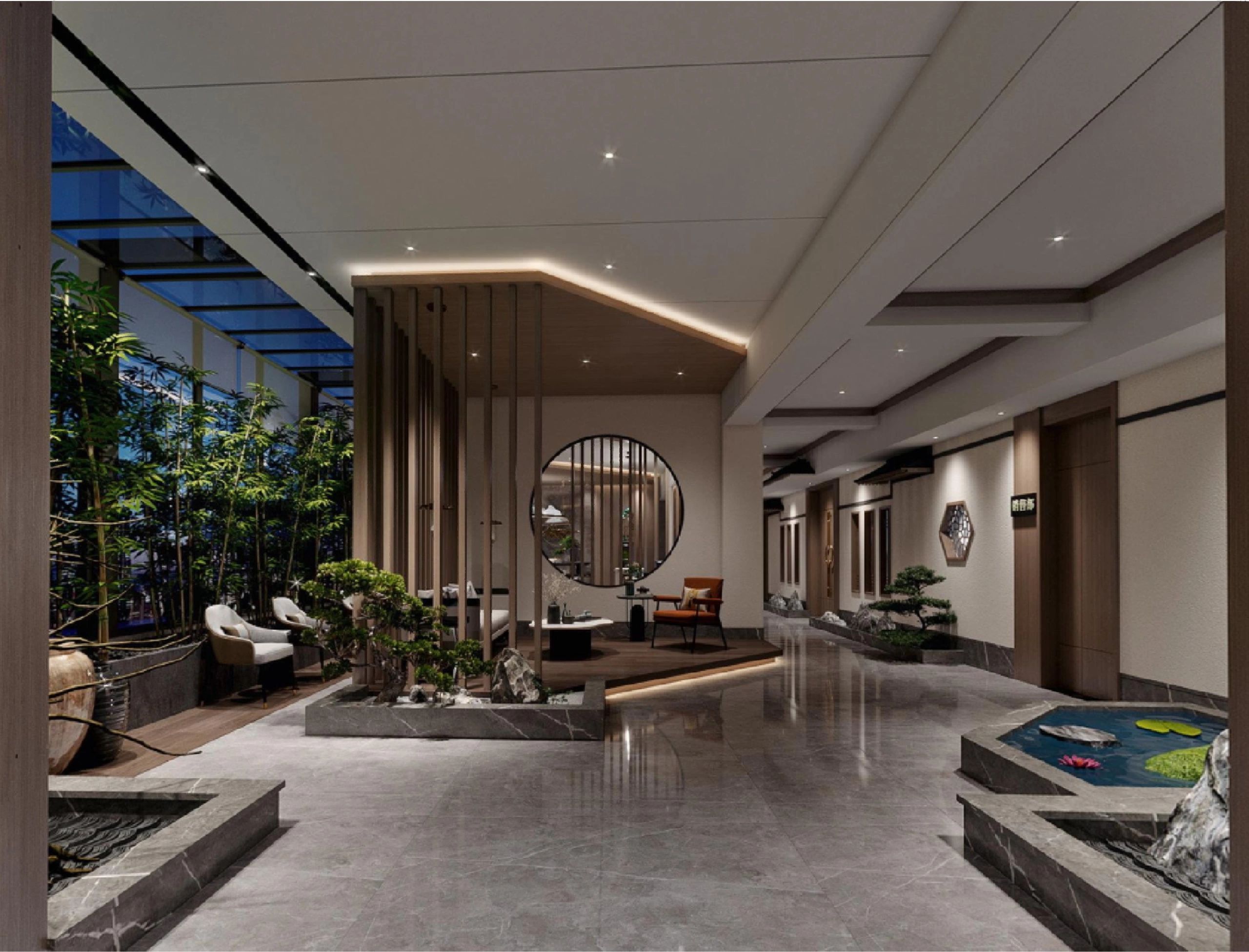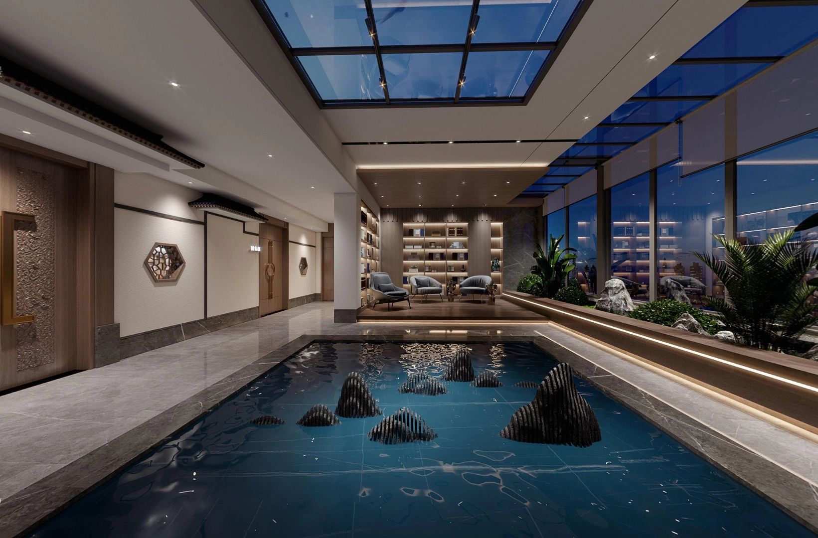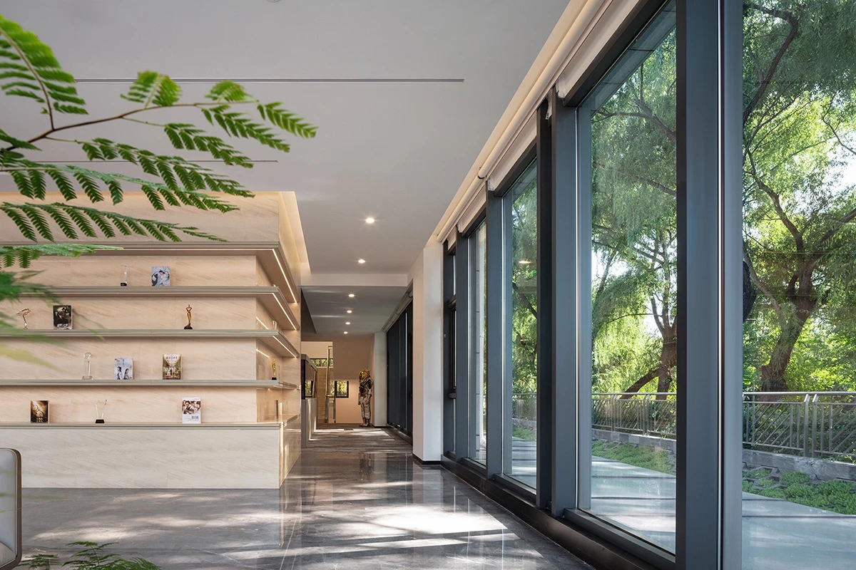 “疏影横斜水清浅”,流光无声,浮沉错列,廊道两侧,树影的斑驳与鱼水的明澈相对应,素描出雅致与清欢的诗意之美。立面删繁就简而成的轻盈感,让光影的明暗、轻重、厚薄,都有序可循,如同电影中的造型语言,技法纯熟,直观形象,在体验者迂回踱步之时,将“潜台词”尽皆吐露。