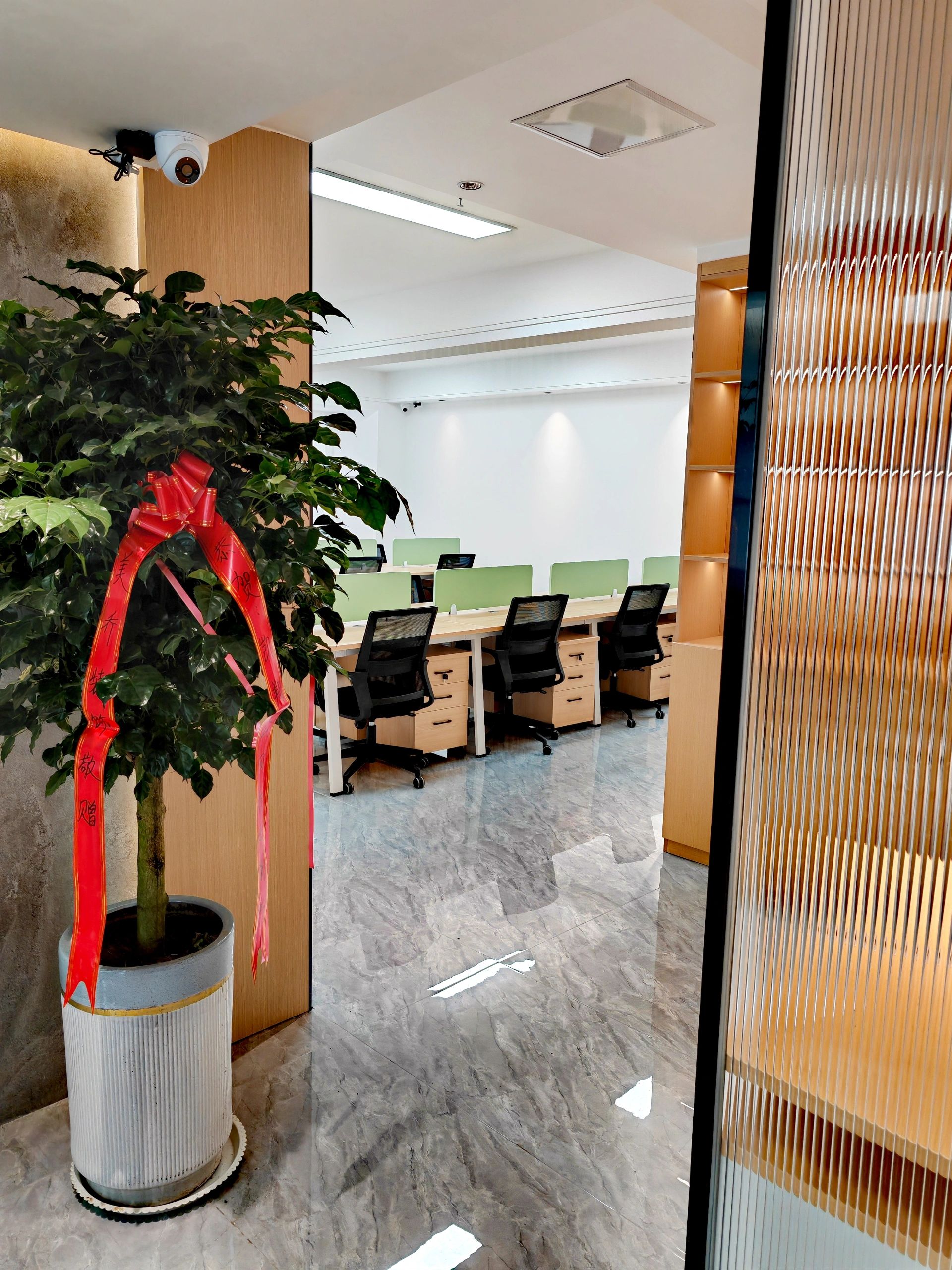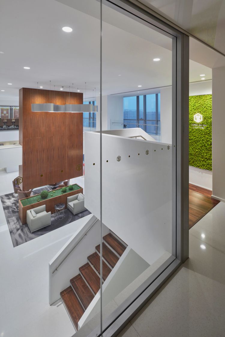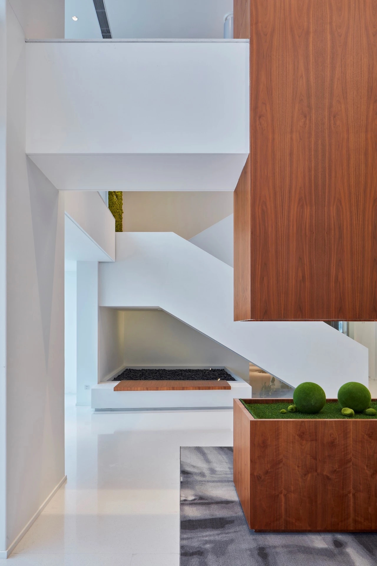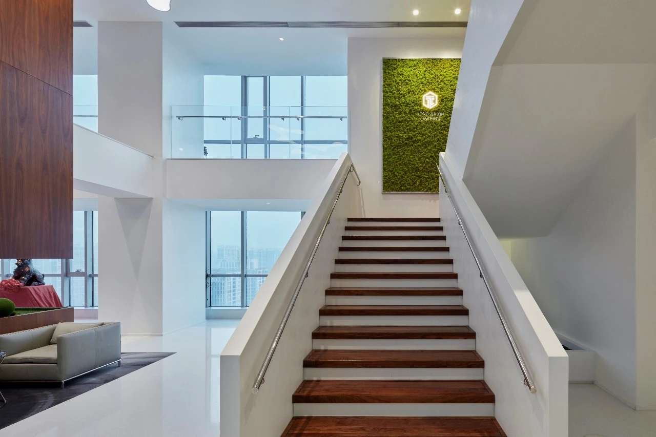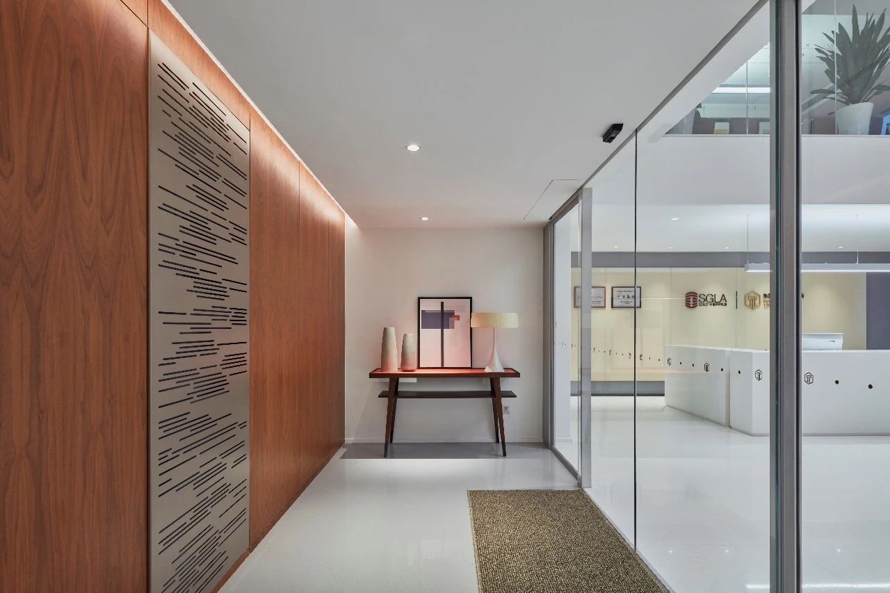 办公空间的基调是理性,带着冷静的思考,同时迸发思想性与活跃性,激发感性的领悟。墙顶地以干净的白色作为空间主基调,木饰面、绿植墙与办公家具适配空间氛围,营造理性与感性结合的办公空间。在空间构造上,设计团队尝试用建筑的手法去表达,通过拆除前厅区域的楼板,最大限度的引入自然光线,营造出通透明亮的接待区域,拔高的竖向空间带来了强烈的视觉感受,同时串联起整个场域。开放式的办公空间需要一个清晰的布局和分区,以确保每个人都可进行视线交流。