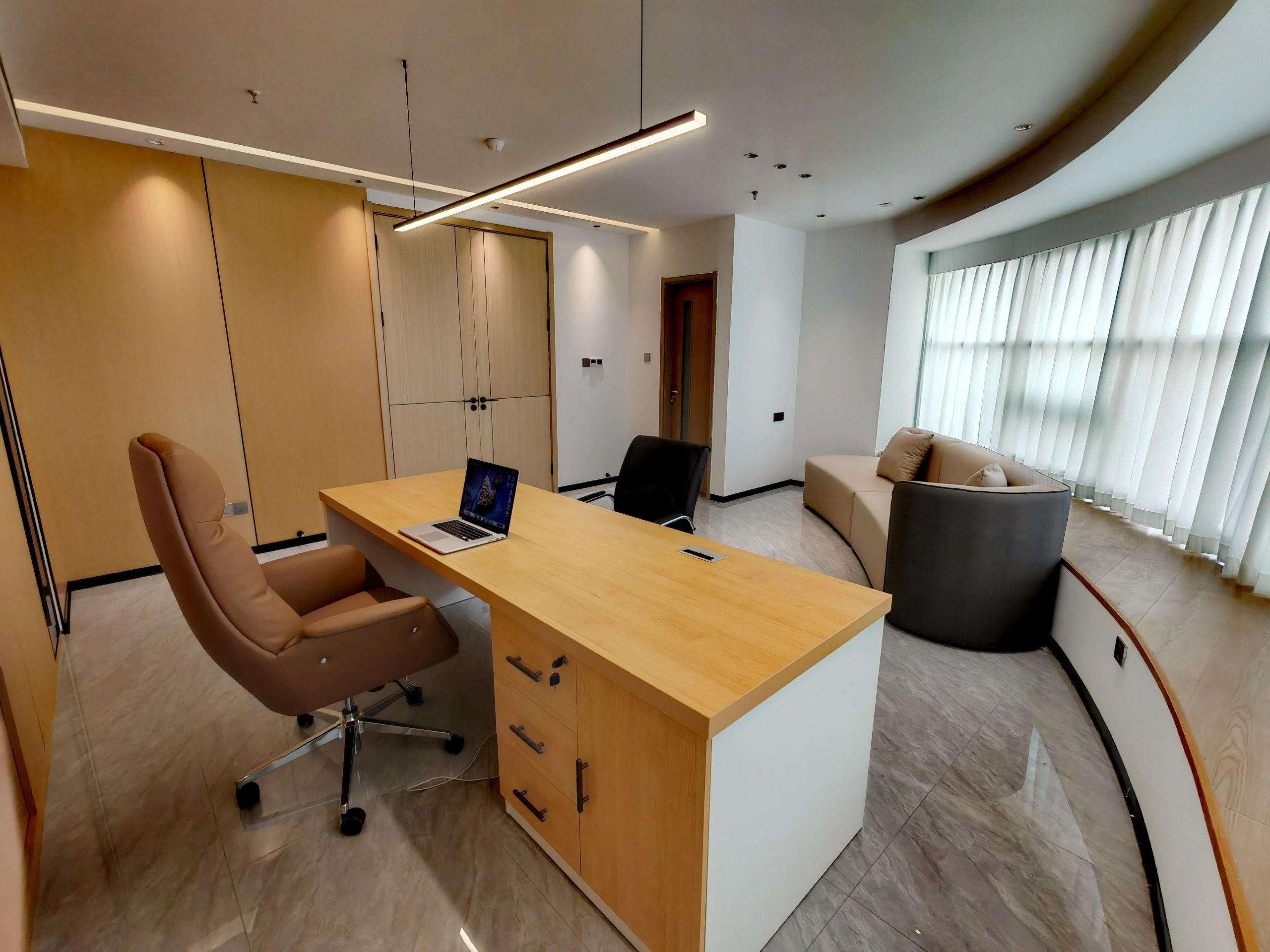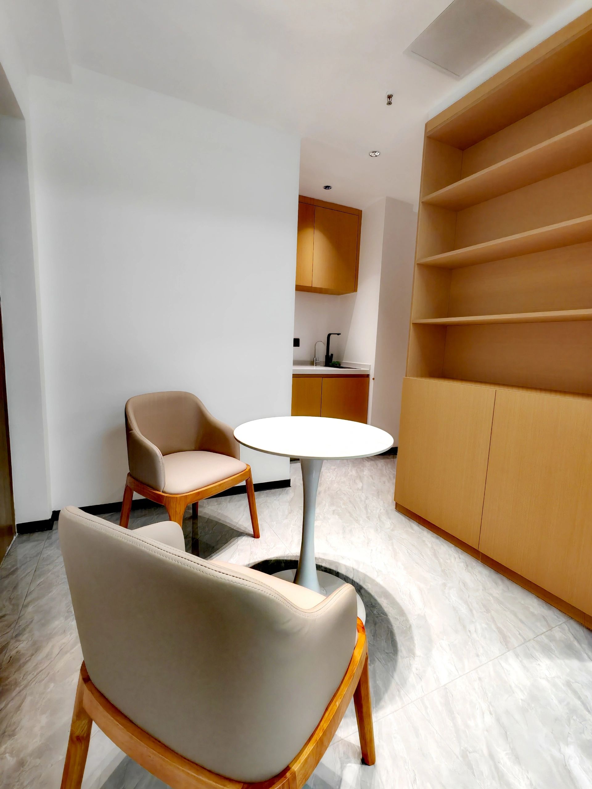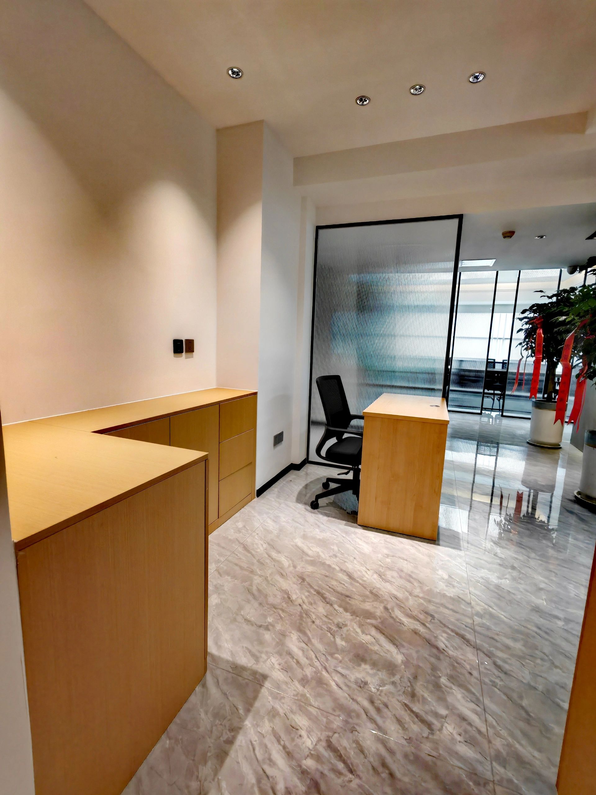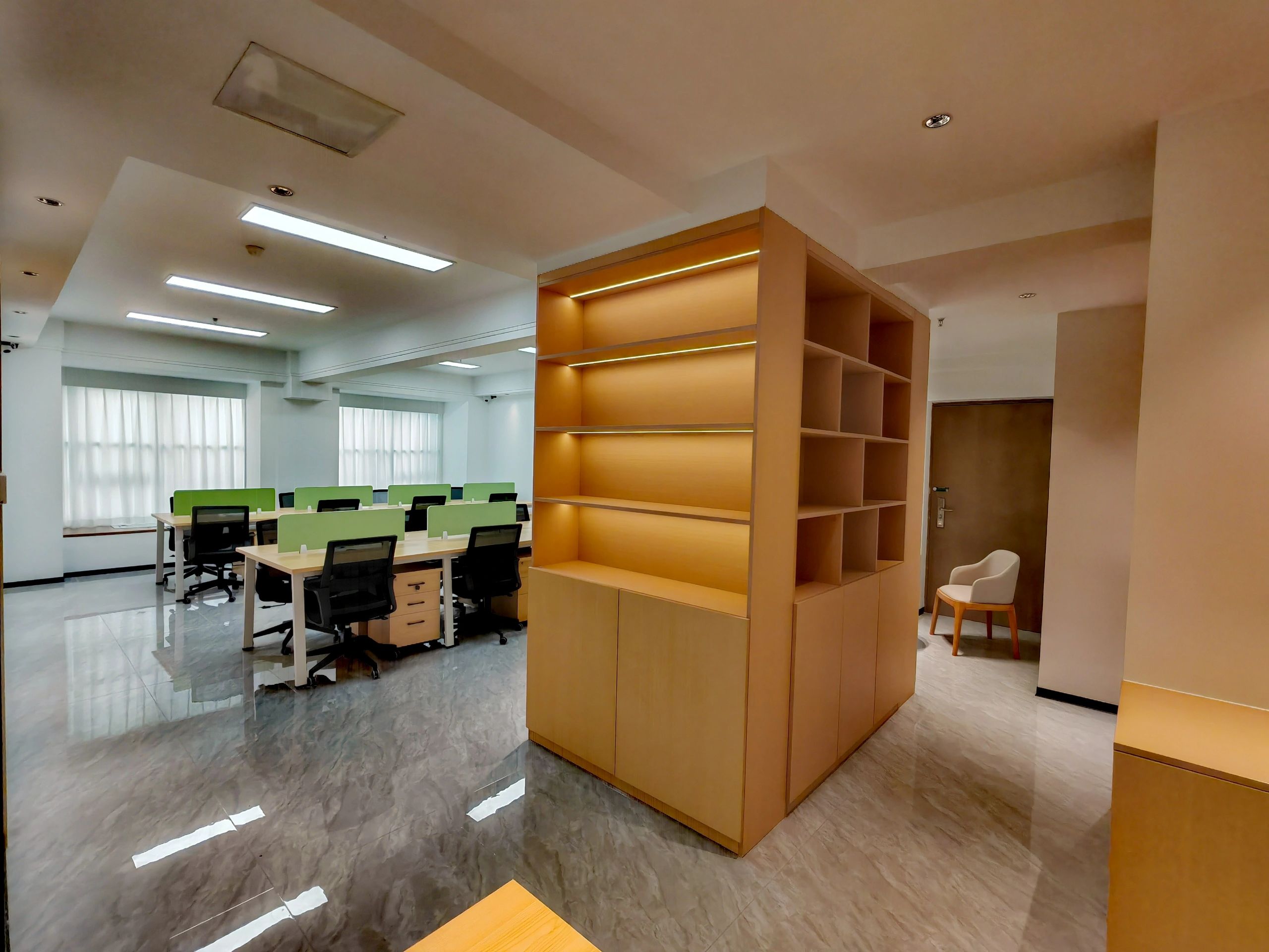 办公空间的基调是理性,带着冷静的思考,同时迸发思想性与活跃性,激发感性的领悟。墙顶地以干净的白色作为空间主基调,木饰面、绿植墙与办公家具适配空间氛围,营造理性与感性结合的办公空间。在空间构造上,设计团队尝试用建筑的手法去表达,通过拆除前厅区域的楼板,最大限度的引入自然光线,营造出通透明亮的接待区域,拔高的竖向空间带来了强烈的视觉感受,同时串联起整个场域。开放式的办公空间需要一个清晰的布局和分区,以确保每个人都可进行视线交流。