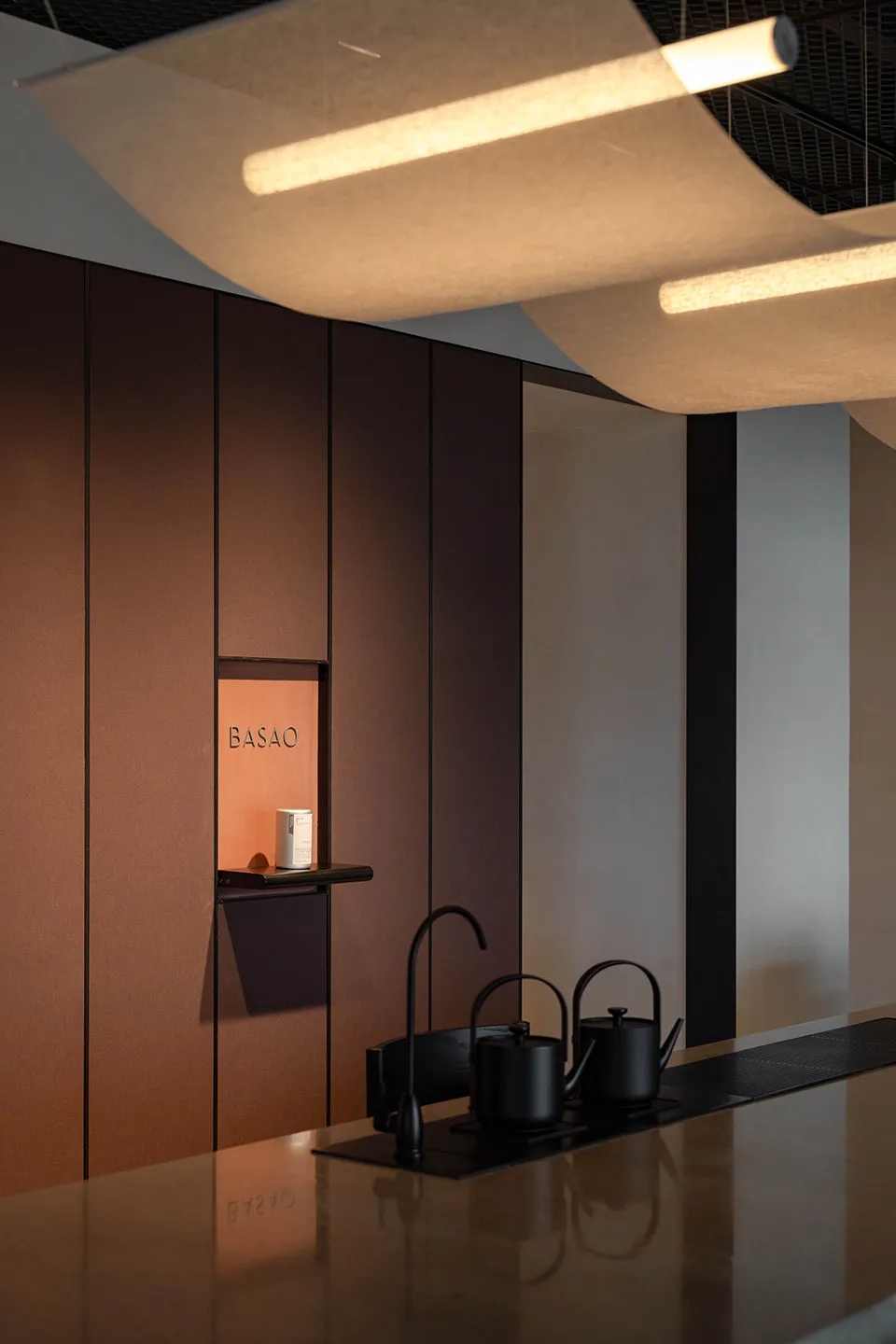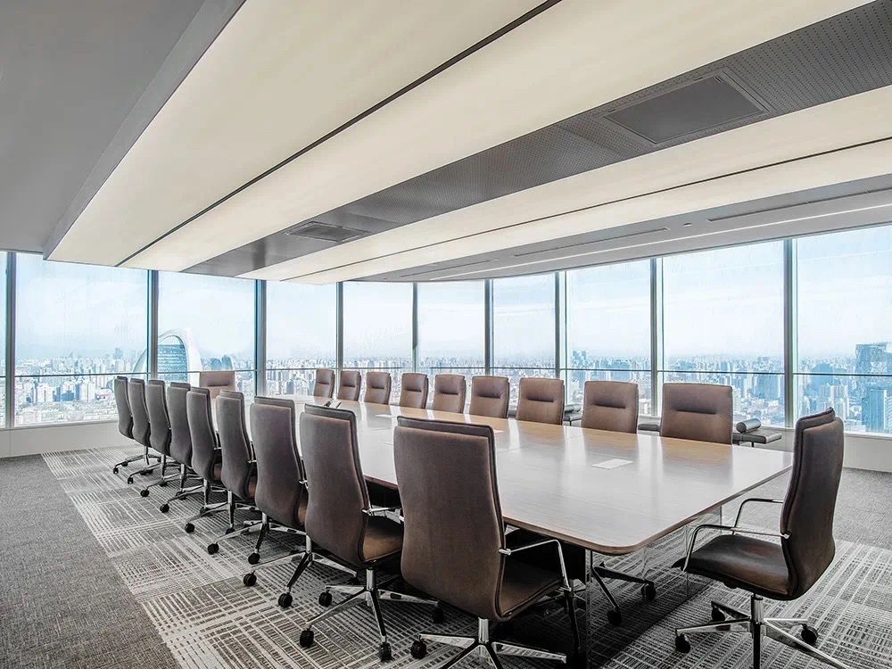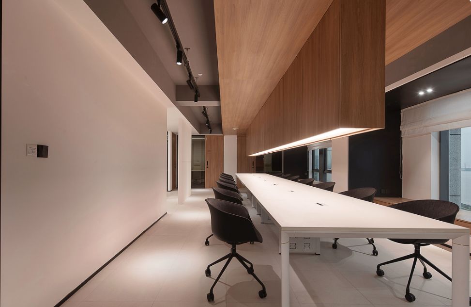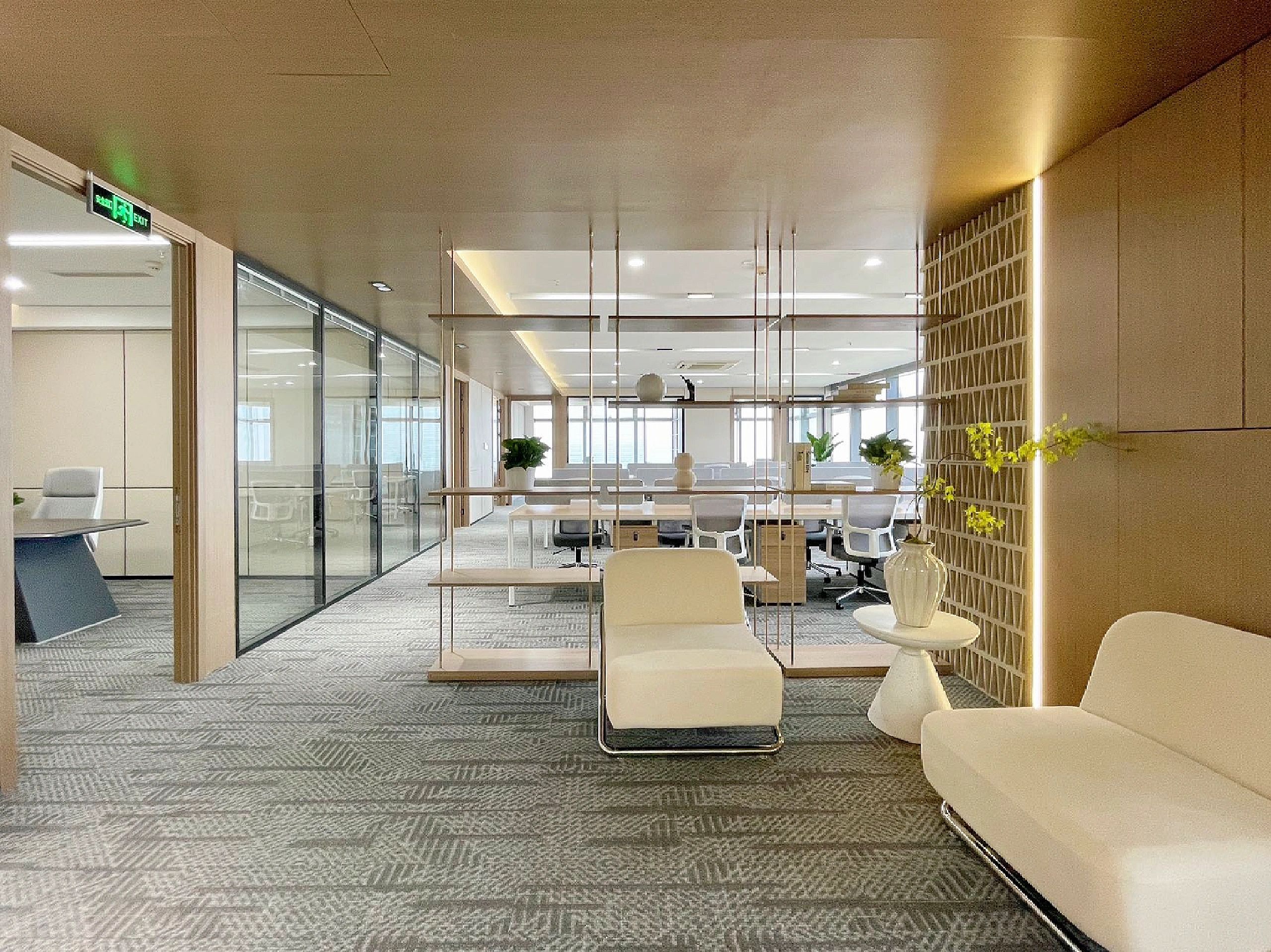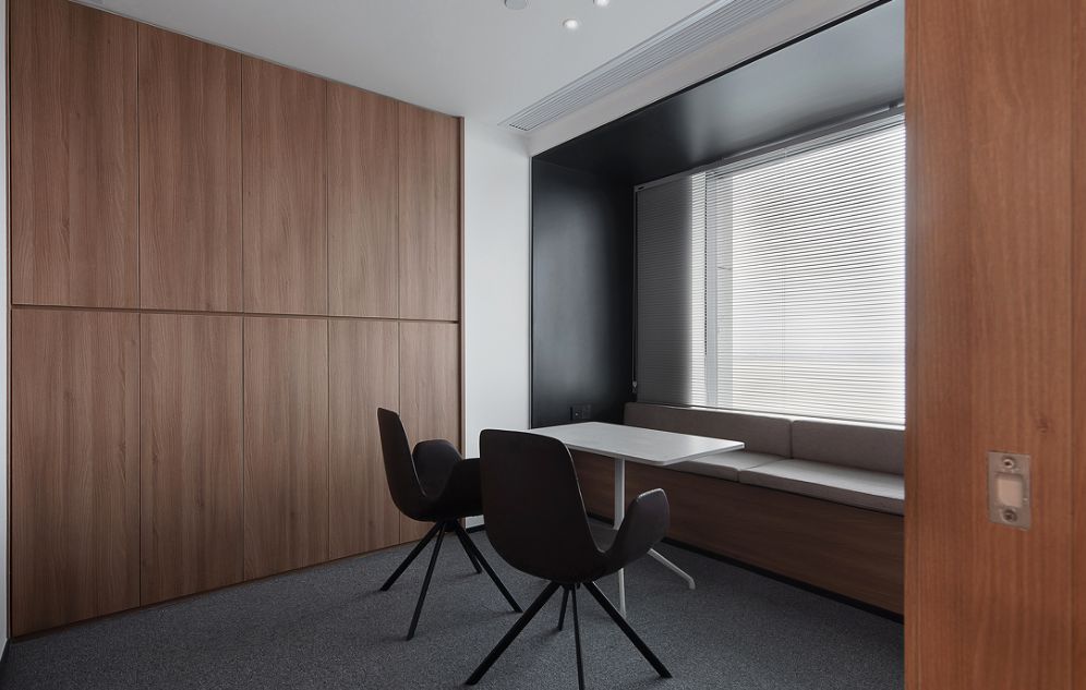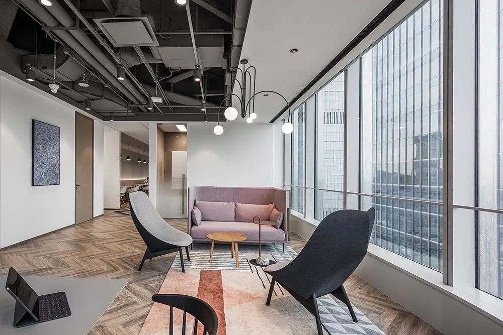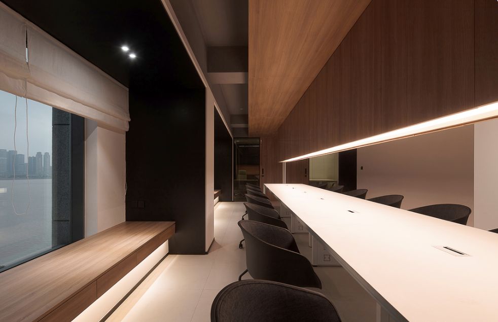 我们为了避免过多使用同一材质所带来的单调感,选择在统一的氛围下,叠加自然属性相似但视觉效果有所变化的多种肌理,用以丰富空间的细节和触感。对于照明设计,我们则根据场地条件和使用功能去规划适配的照明方式,比如在自然采光优越的独立办公空间里,人工照明就会尽量弱化,只做辅助型柔和照明,让自然光线成为主角;在相对幽暗的人工光占主导作用的场景里,照明设计则会考虑多重层次,烘托出丰富的场景构建。