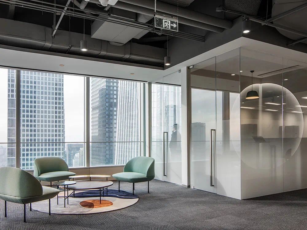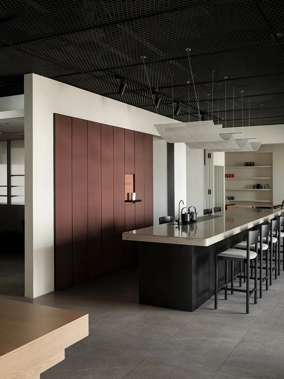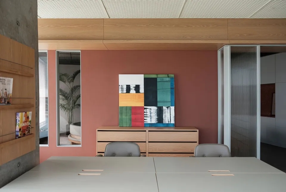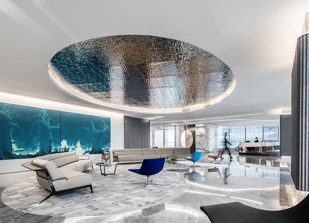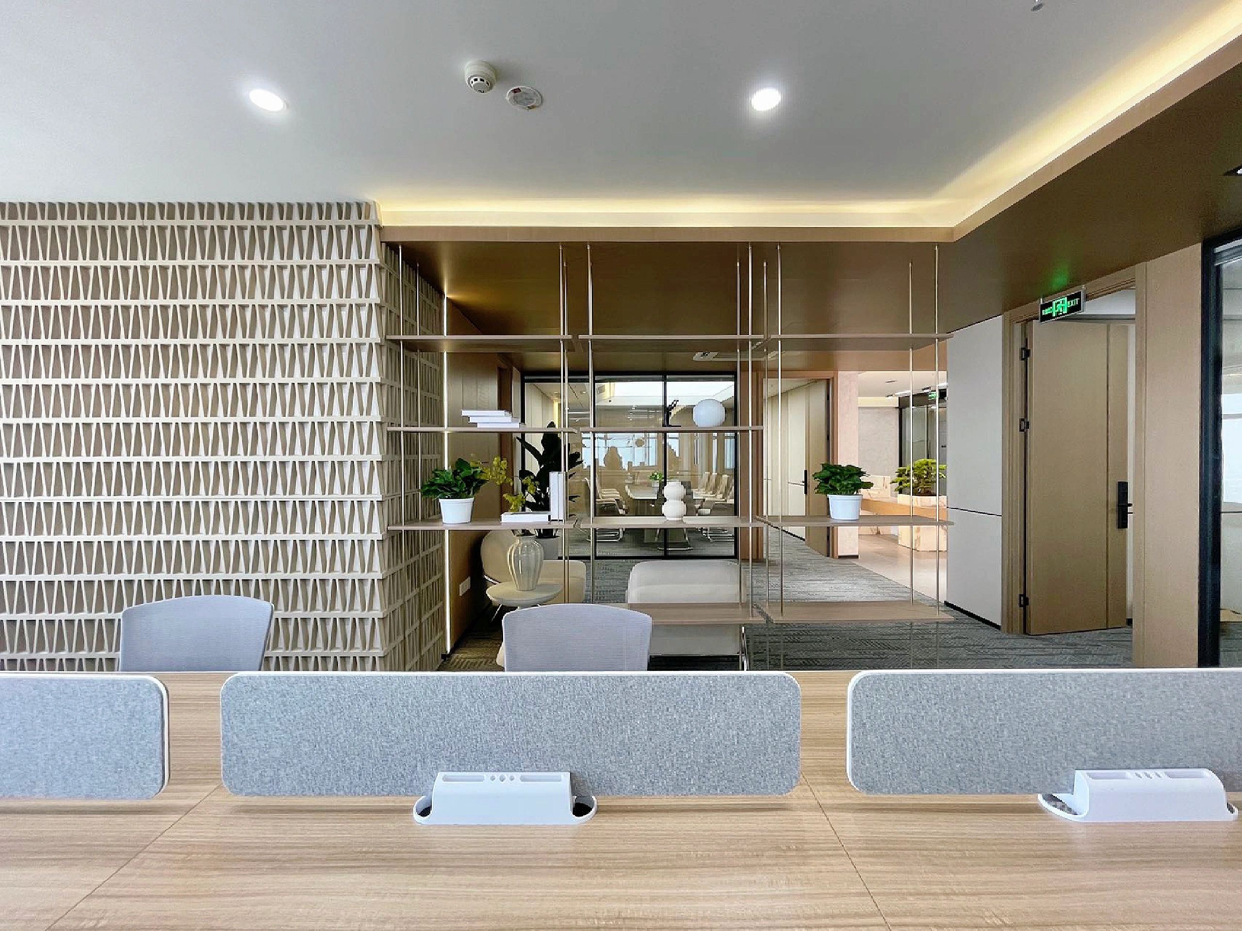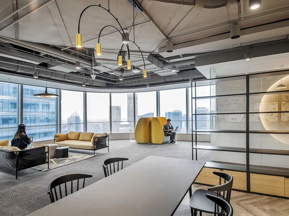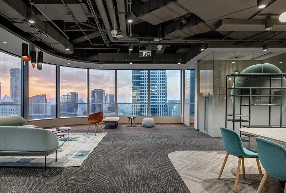我们为了避免过多使用同一材质所带来的单调感,选择在统一的氛围下,叠加自然属性相似但视觉效果有所变化的多种肌理,用以丰富空间的细节和触感。对于照明设计,我们则根据场地条件和使用功能去规划适配的照明方式,比如在自然采光优越的独立办公空间里,人工照明就会尽量弱化,只做辅助型柔和照明,让自然光线成为主角;在相对幽暗的人工光占主导作用的场景里,照明设计则会考虑多重层次,烘托出丰富的场景构建。