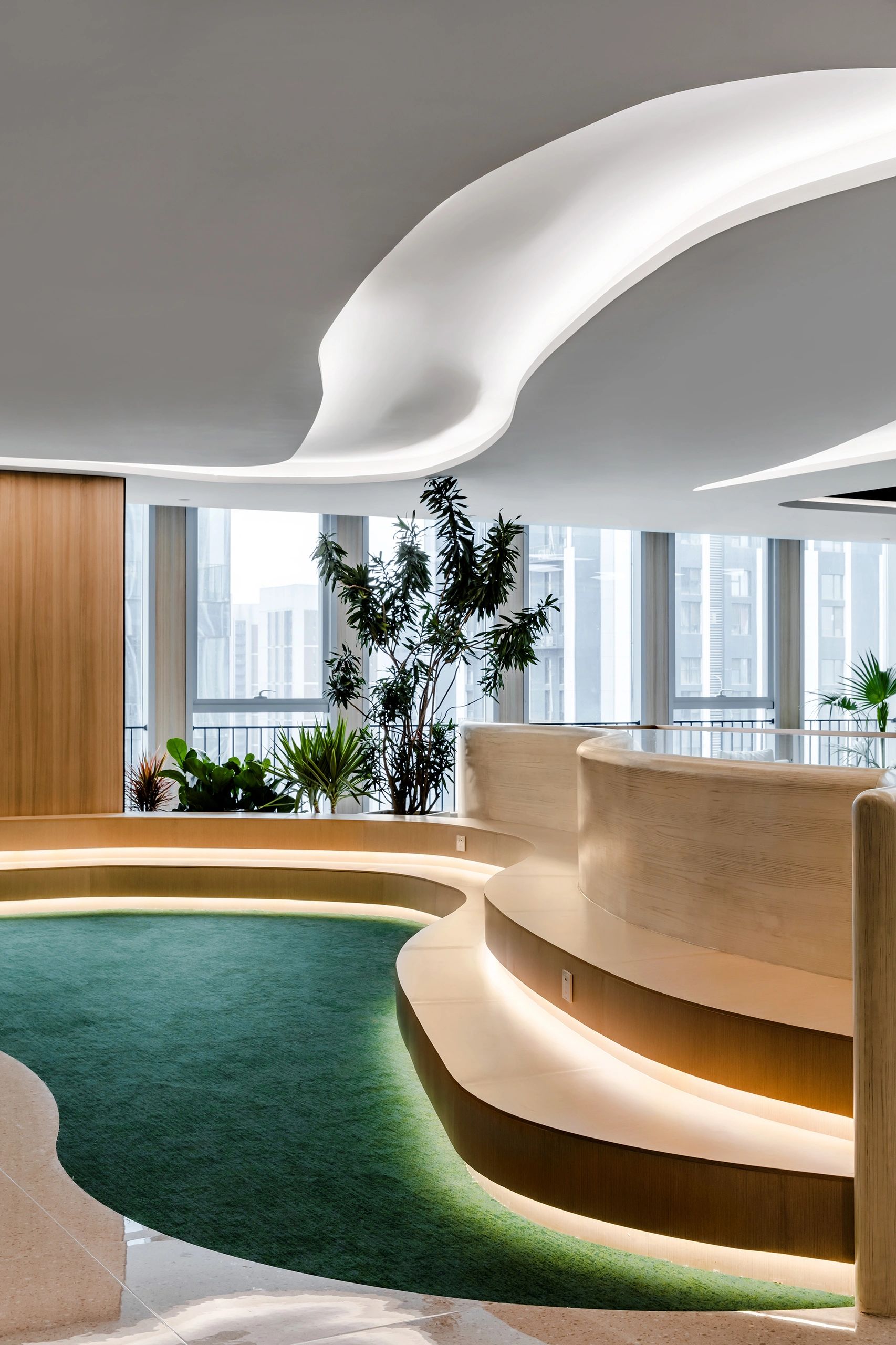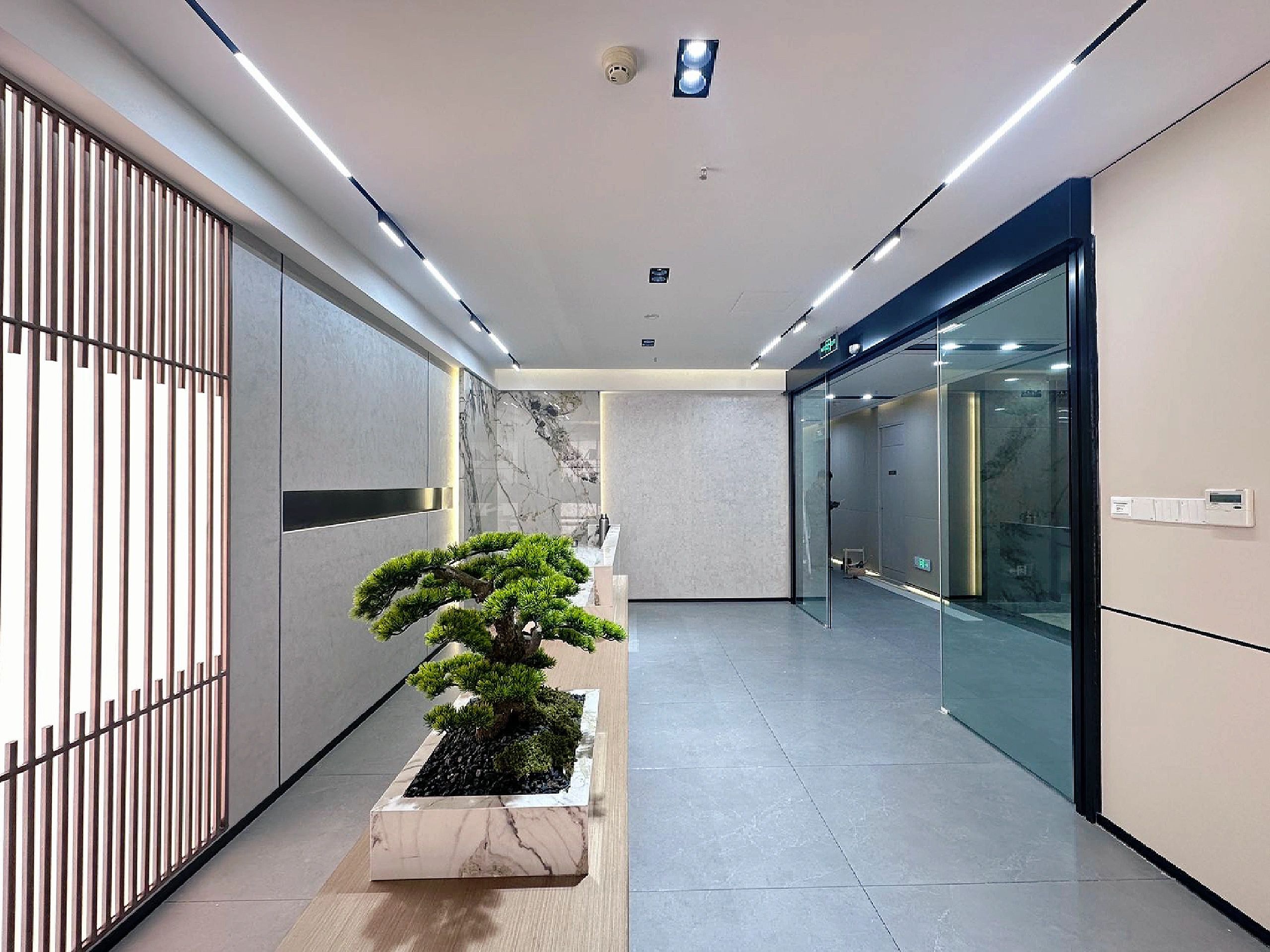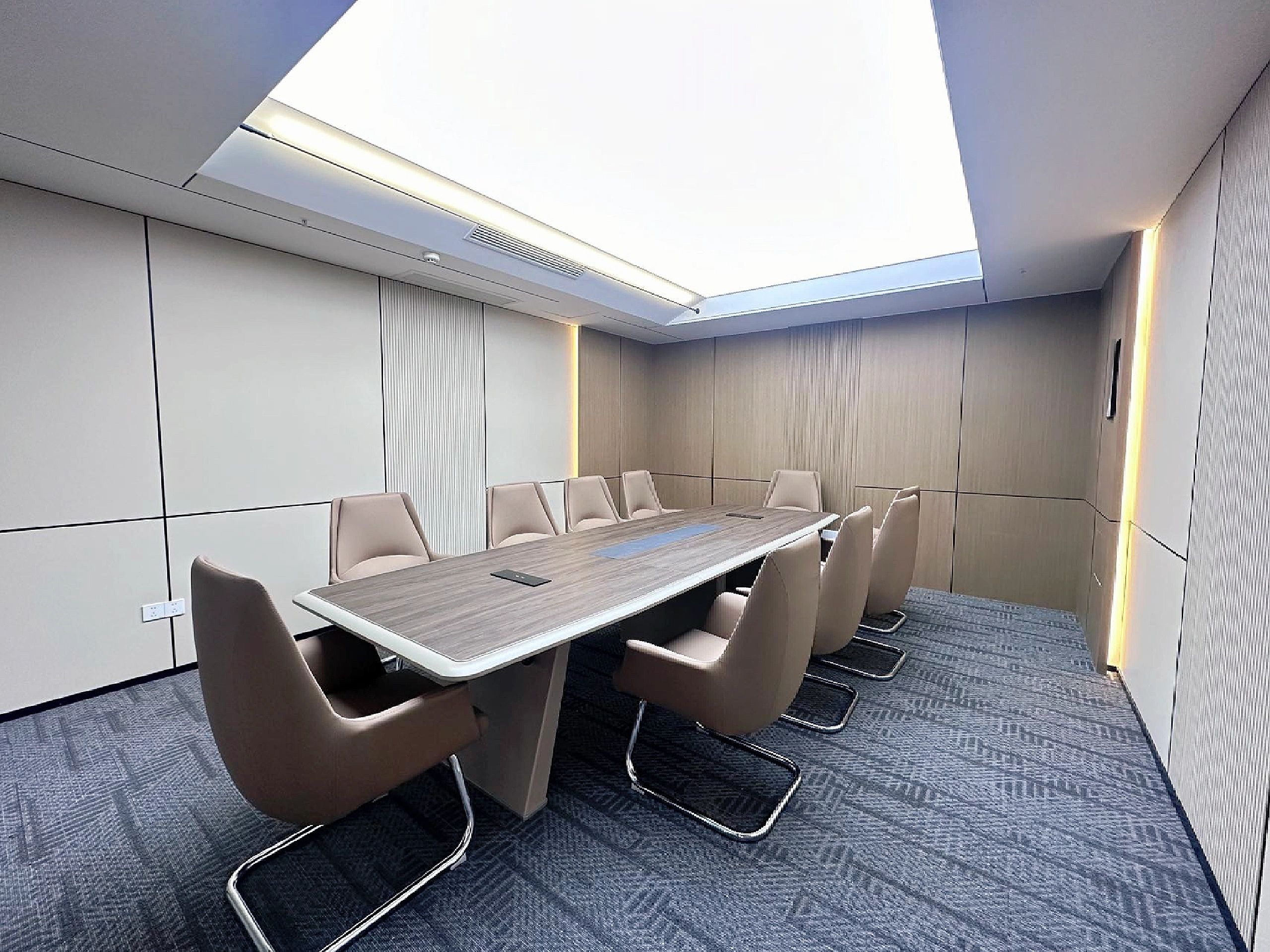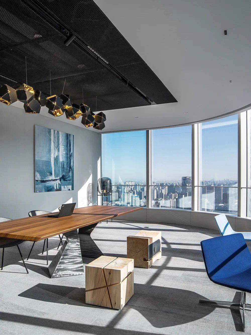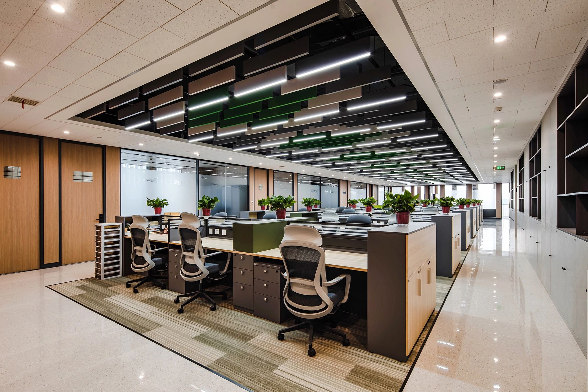 我们为了避免过多使用同一材质所带来的单调感,选择在统一的氛围下,叠加自然属性相似但视觉效果有所变化的多种肌理,用以丰富空间的细节和触感。对于照明设计,我们则根据场地条件和使用功能去规划适配的照明方式,比如在自然采光优越的独立办公空间里,人工照明就会尽量弱化,只做辅助型柔和照明,让自然光线成为主角;在相对幽暗的人工光占主导作用的场景里,照明设计则会考虑多重层次,烘托出丰富的场景构建。