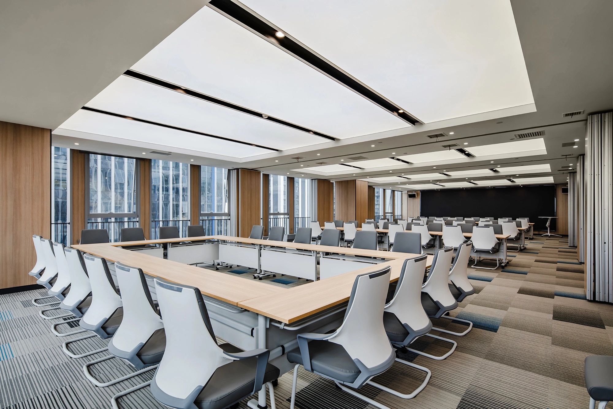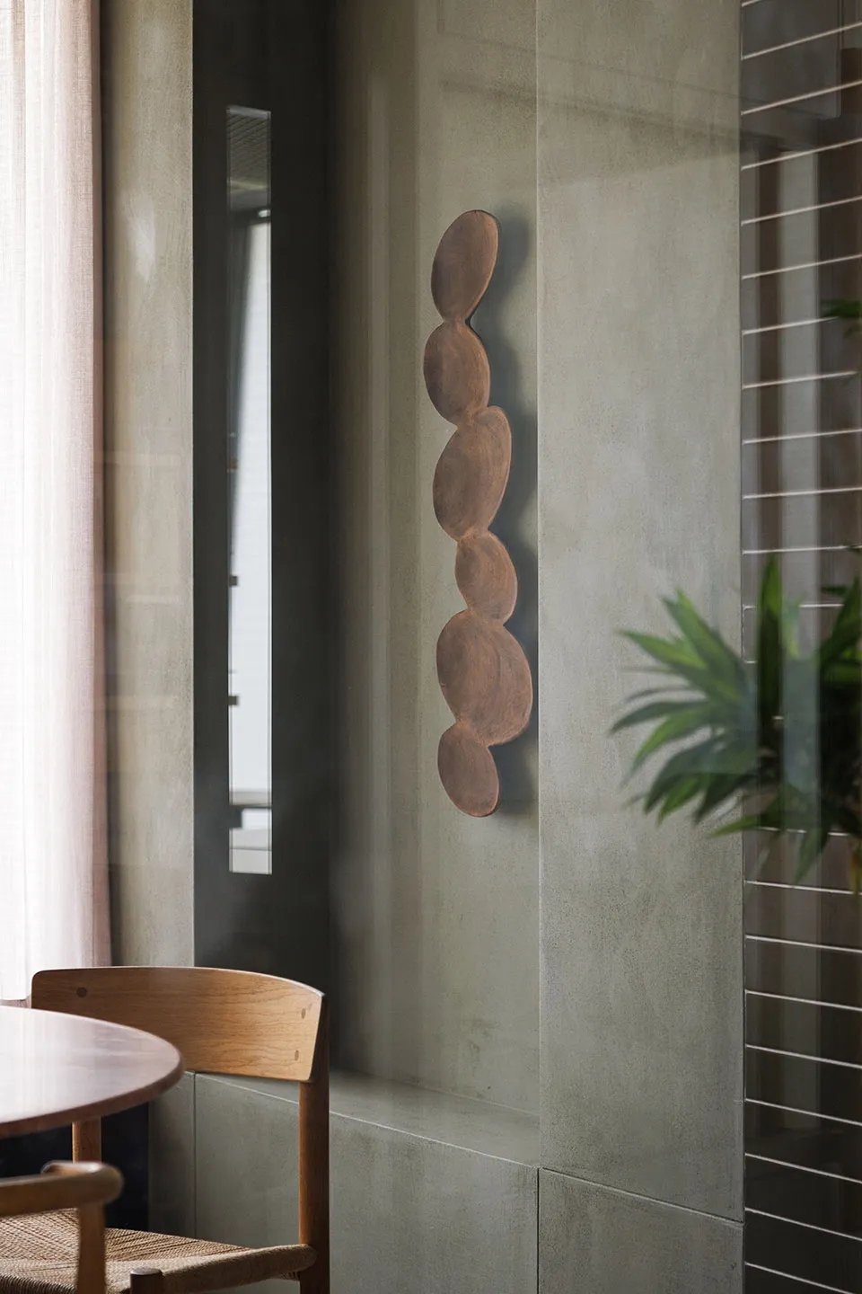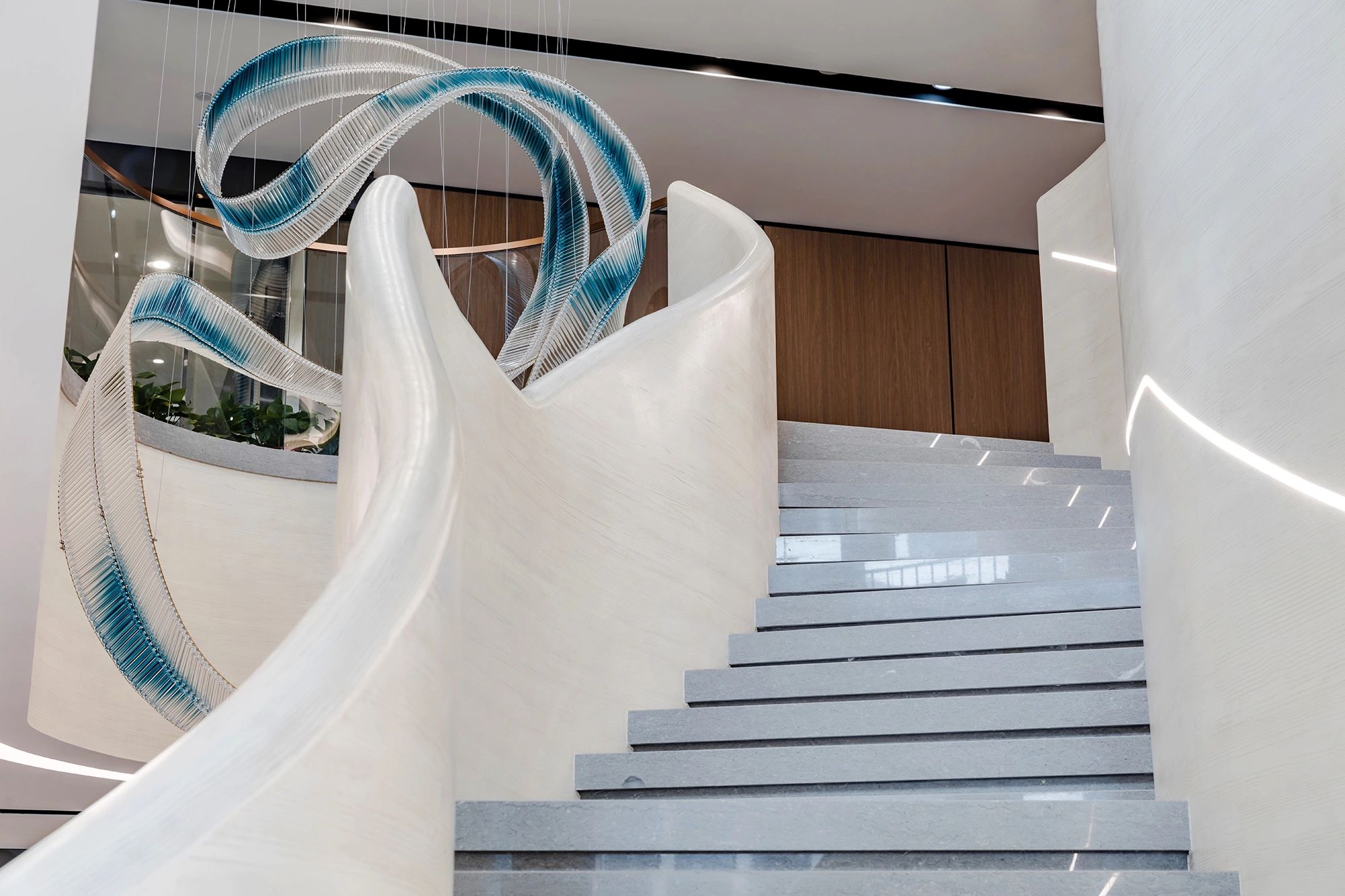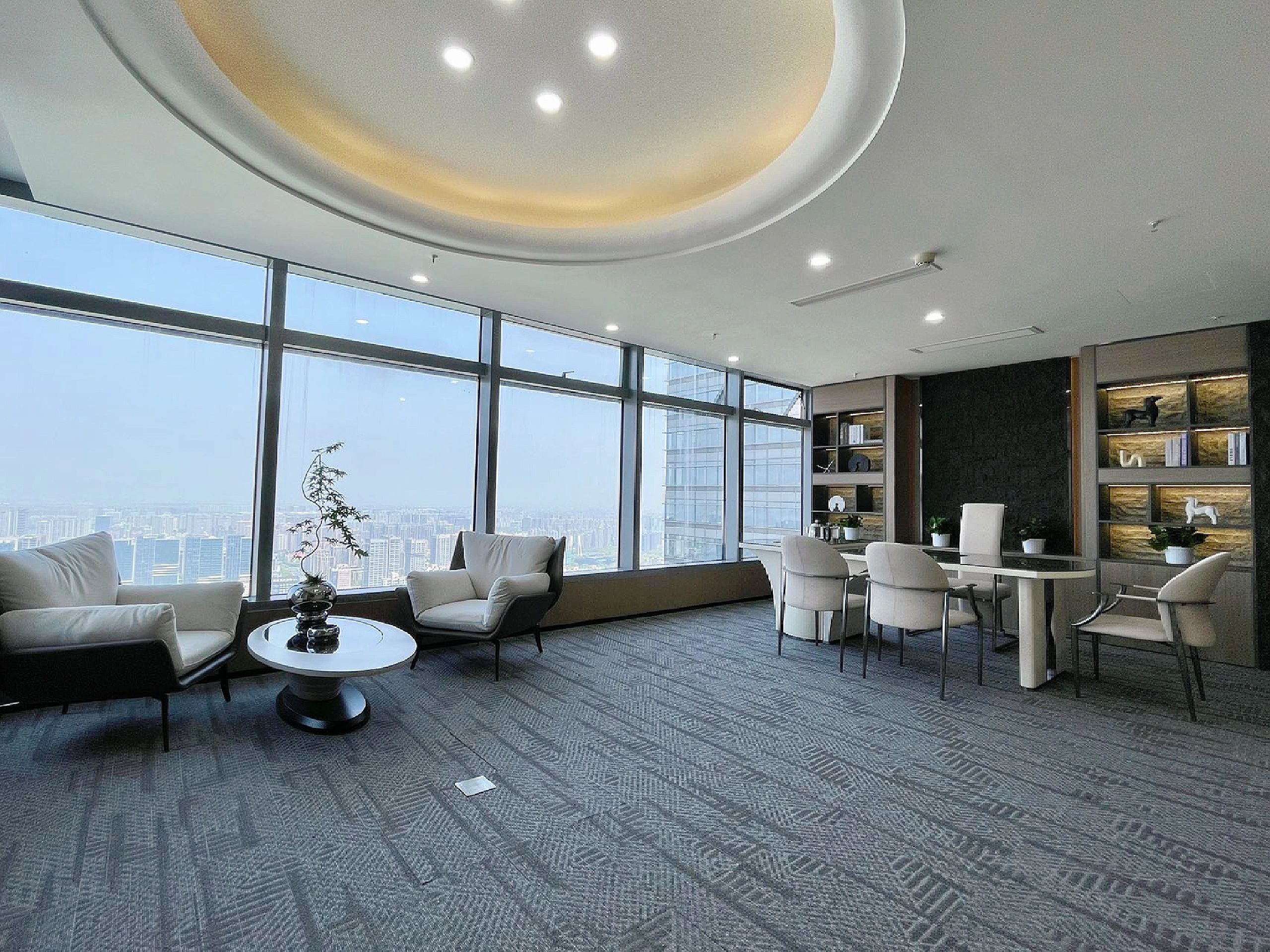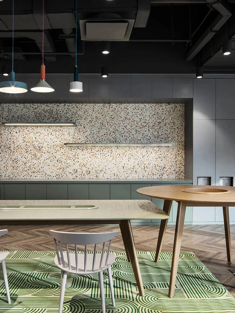 我们为了避免过多使用同一材质所带来的单调感,选择在统一的氛围下,叠加自然属性相似但视觉效果有所变化的多种肌理,用以丰富空间的细节和触感。对于照明设计,我们则根据场地条件和使用功能去规划适配的照明方式,比如在自然采光优越的独立办公空间里,人工照明就会尽量弱化,只做辅助型柔和照明,让自然光线成为主角;在相对幽暗的人工光占主导作用的场景里,照明设计则会考虑多重层次,烘托出丰富的场景构建。