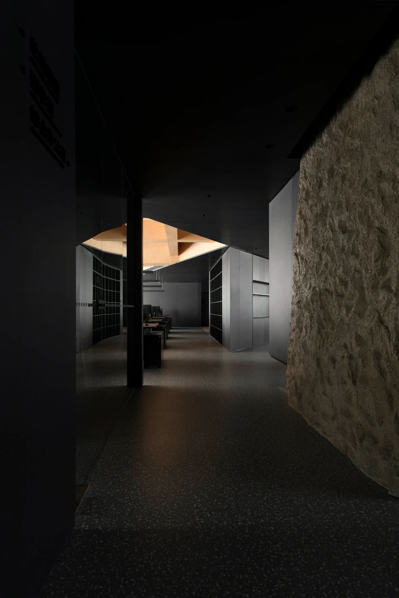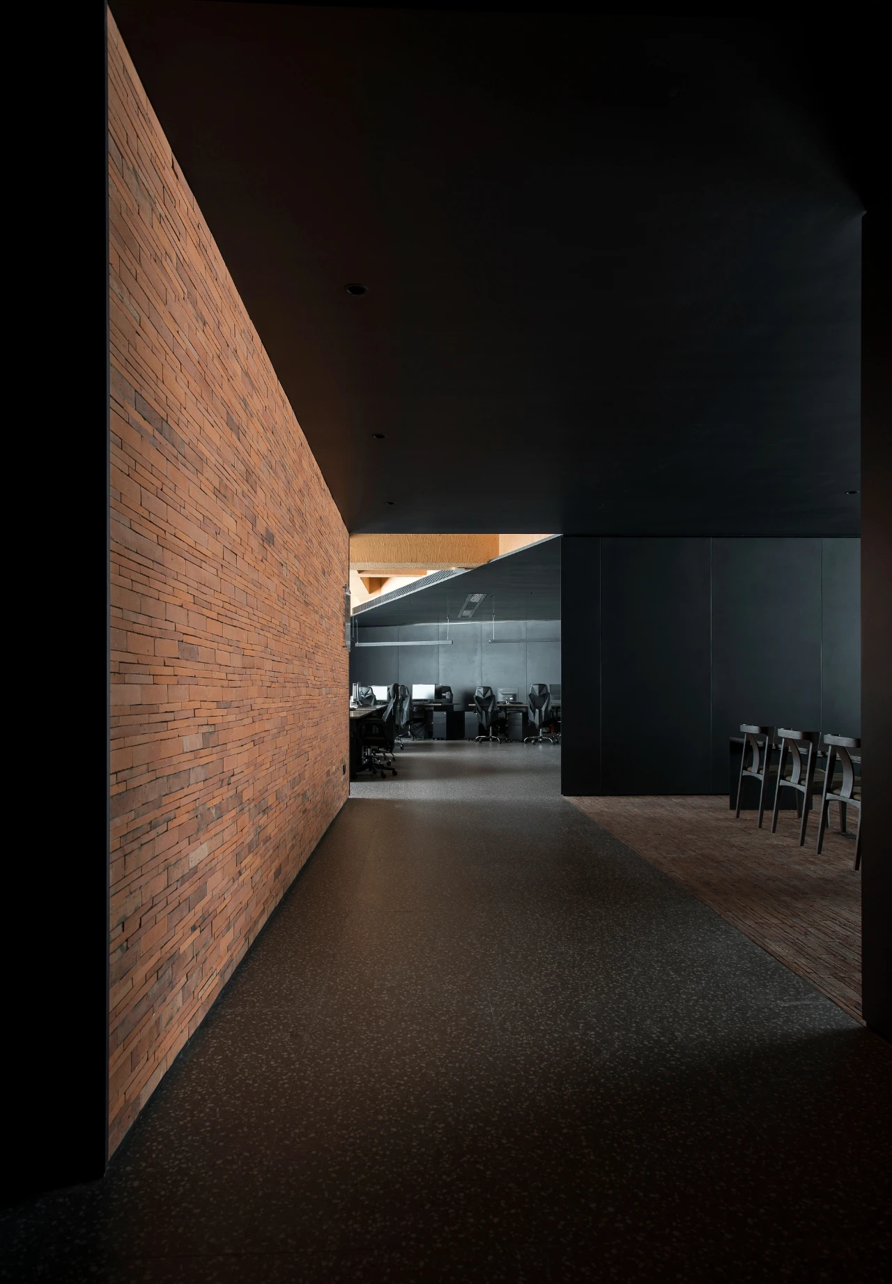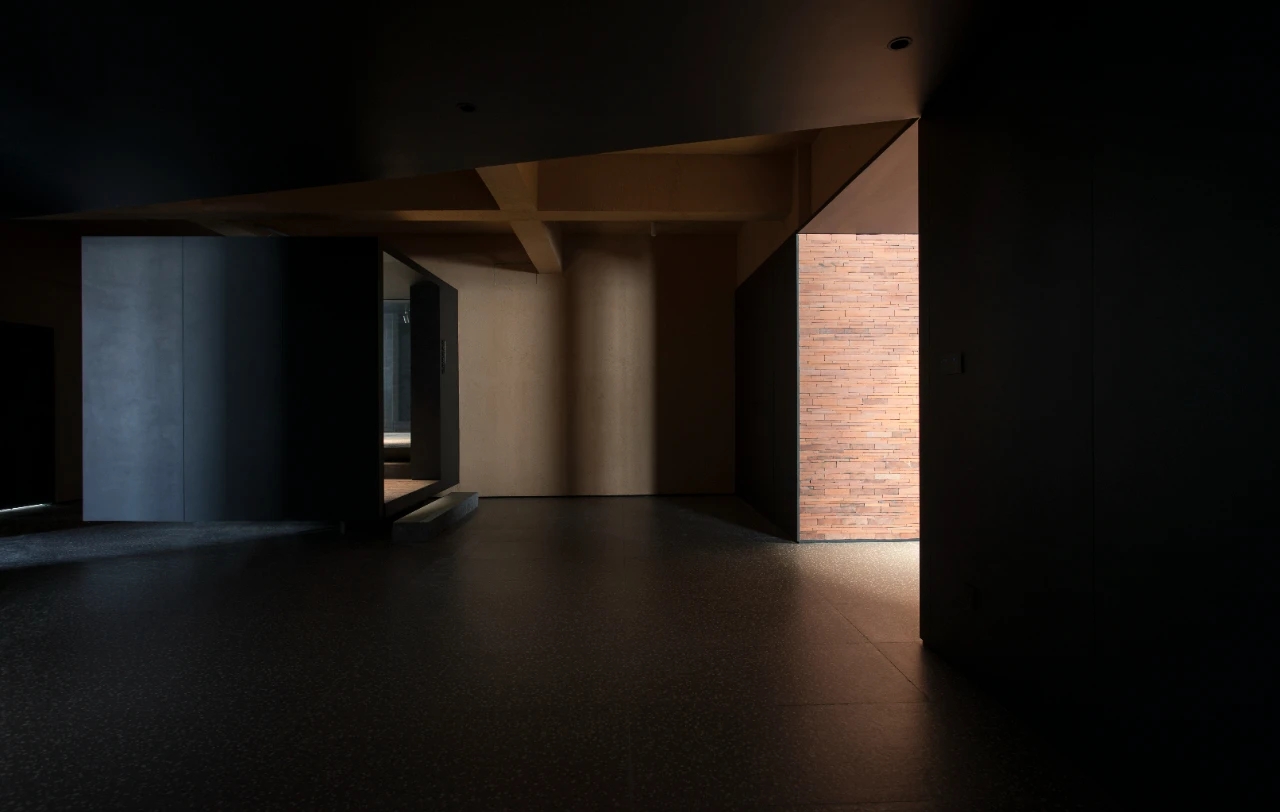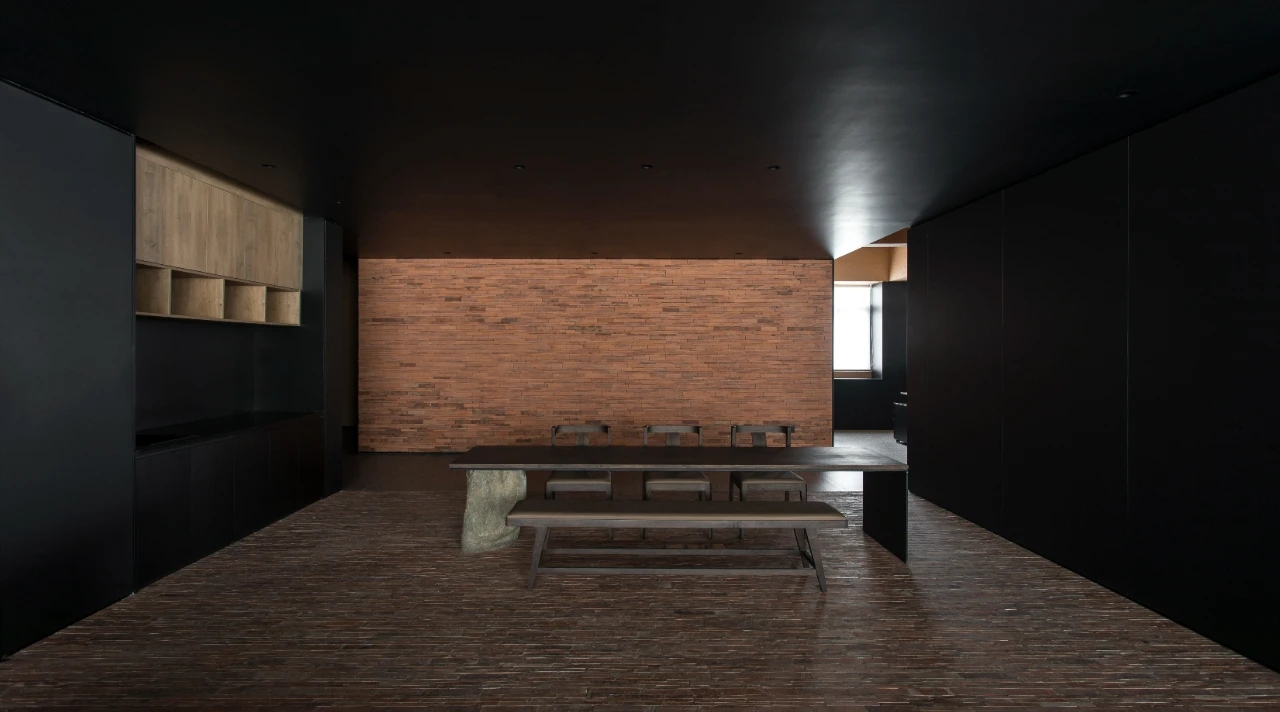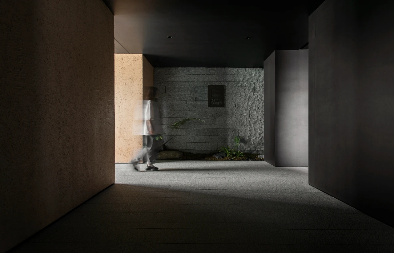 主体黑色调的表达更好地将视觉引到室外的美景,更好的与自然进行互动。钢板的硬朗包裹着泥土的松润,体块的互动关系中以材质作为媒介,材质之间的对话让空间的质感显得更加饱满,三角形交叠的天花和地板三角的分割线,是空间的延展,更似品牌的延展。