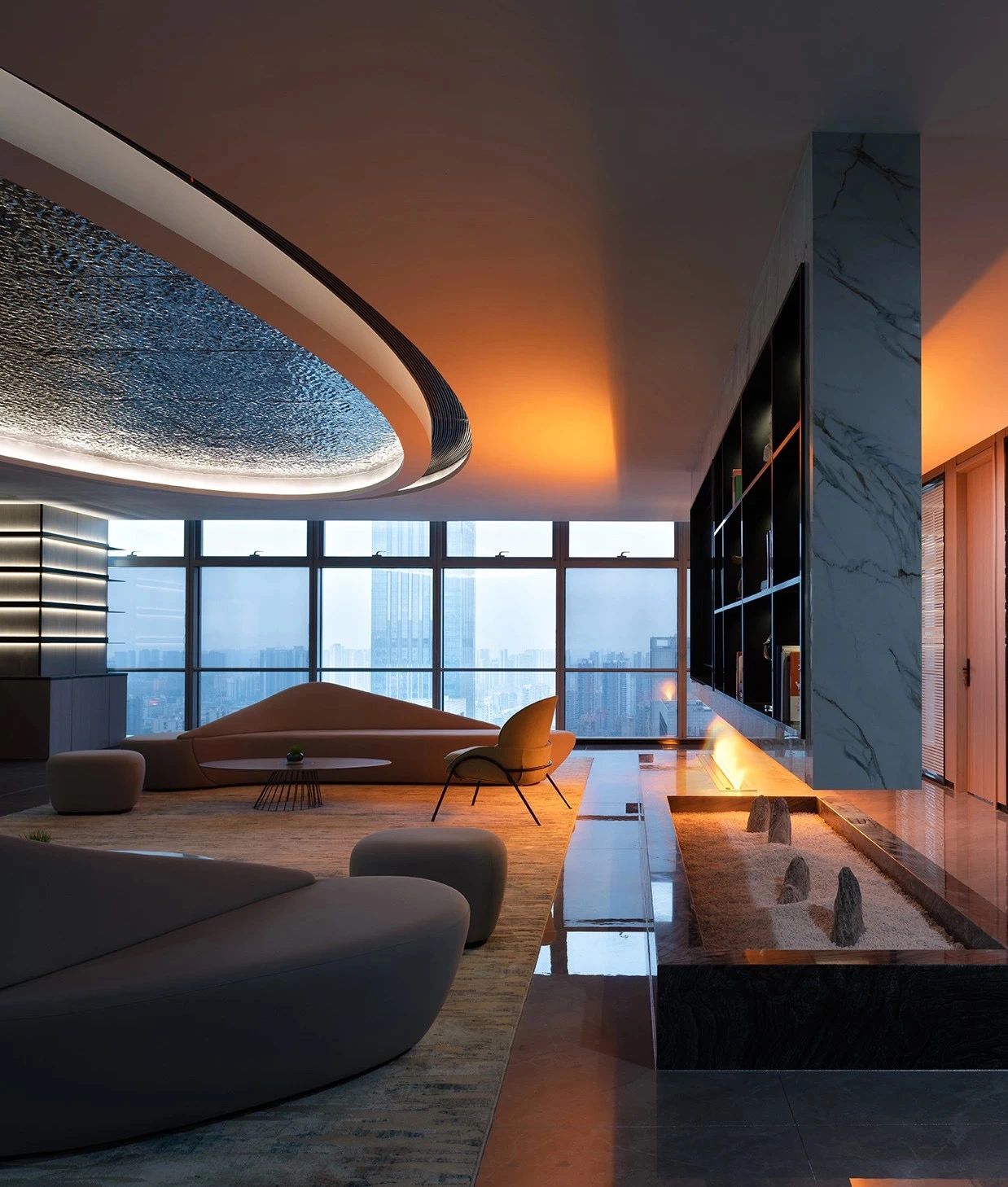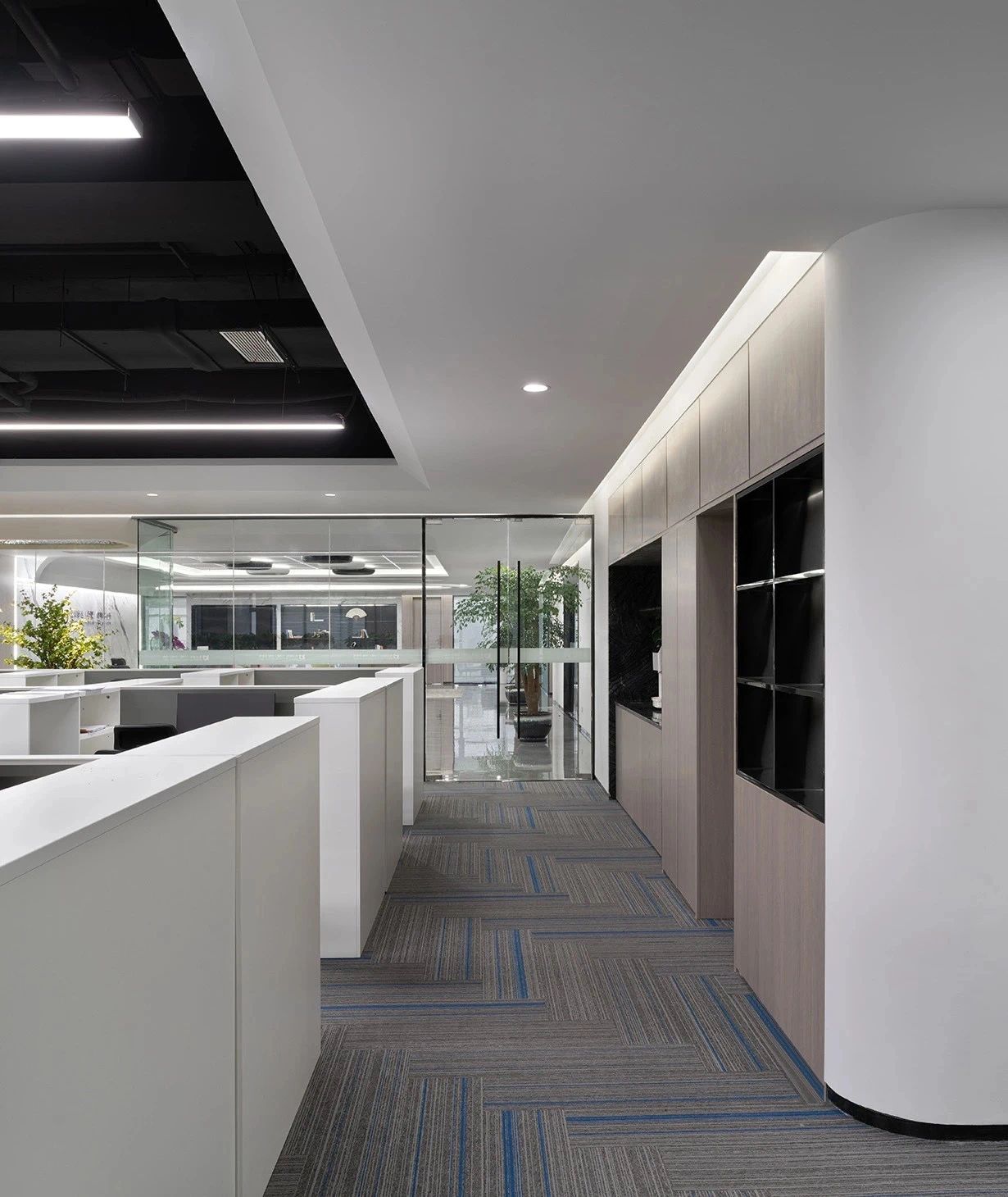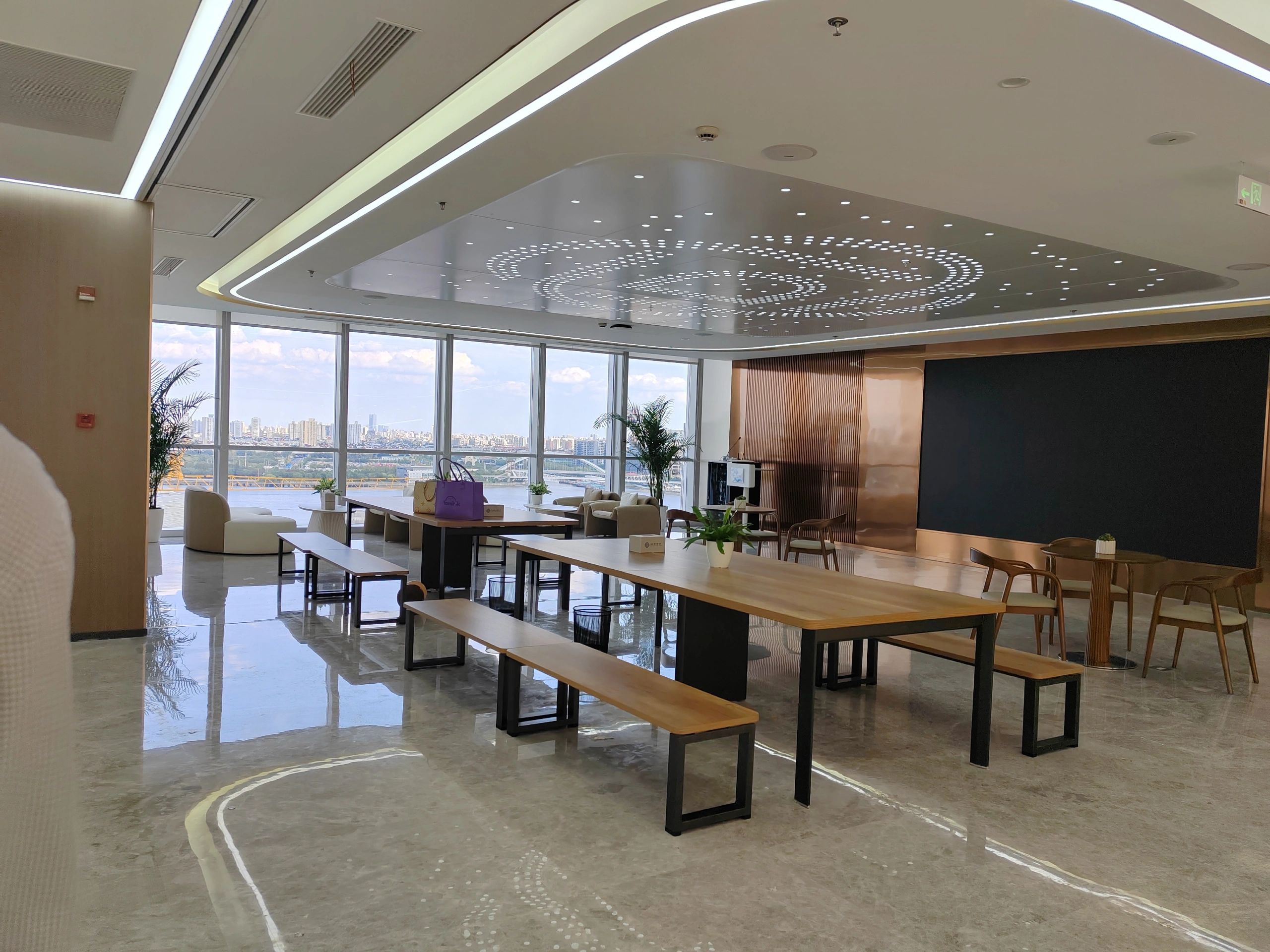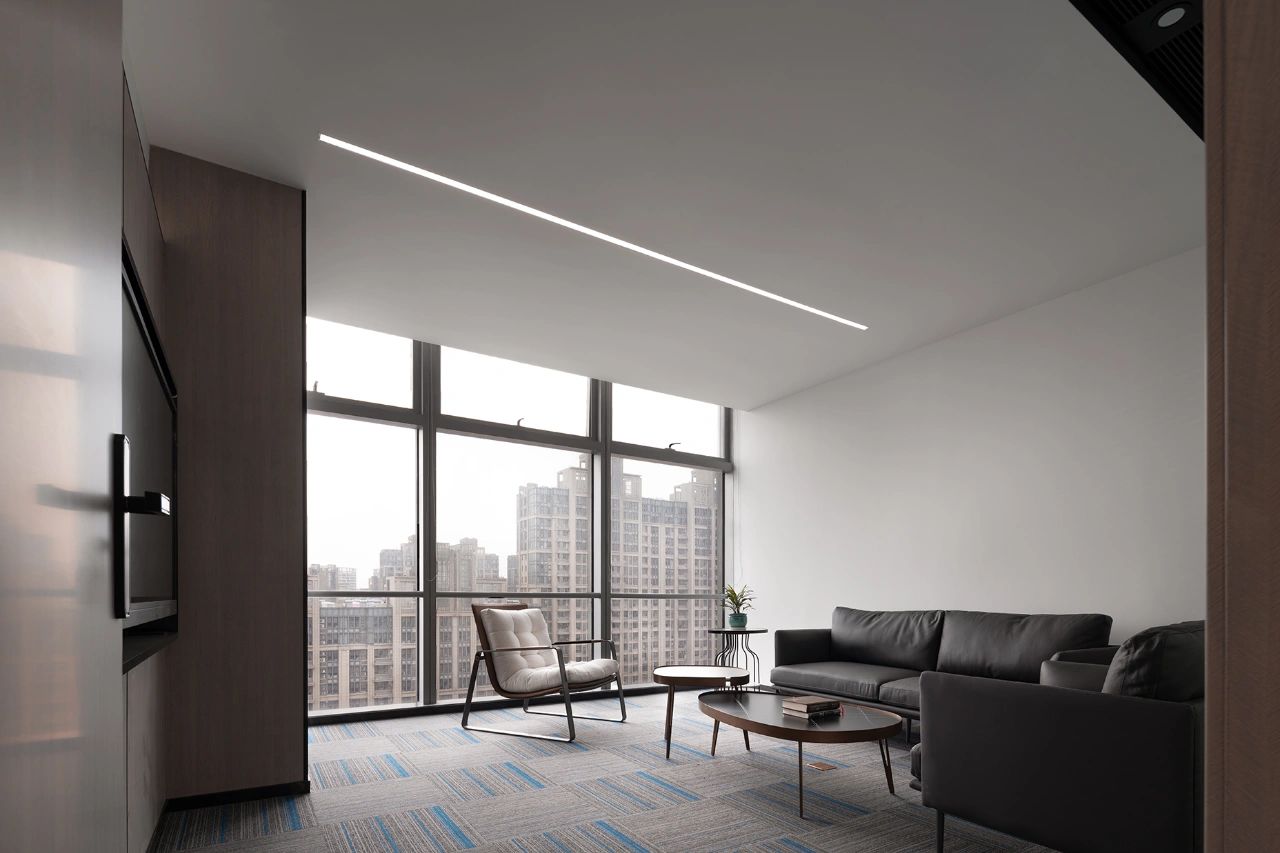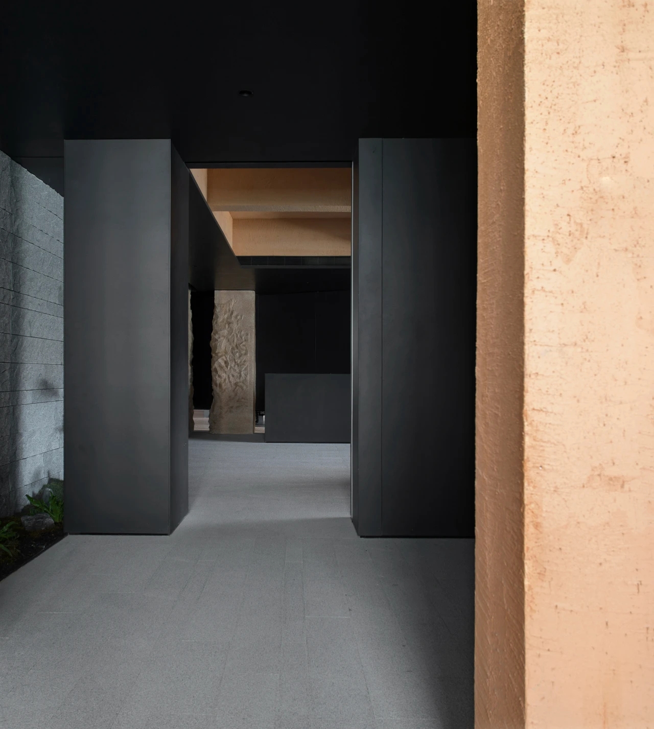 主体黑色调的表达更好地将视觉引到室外的美景,更好的与自然进行互动。钢板的硬朗包裹着泥土的松润,体块的互动关系中以材质作为媒介,材质之间的对话让空间的质感显得更加饱满,三角形交叠的天花和地板三角的分割线,是空间的延展,更似品牌的延展。