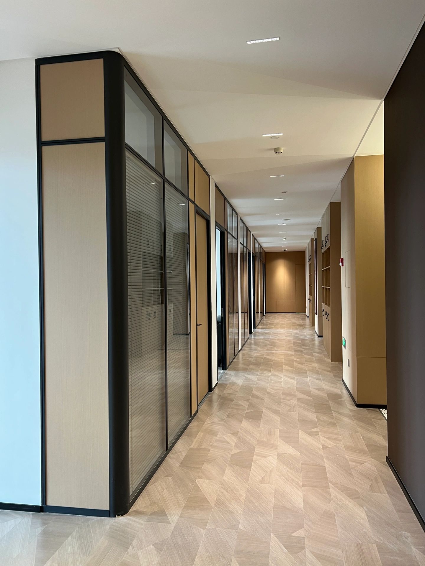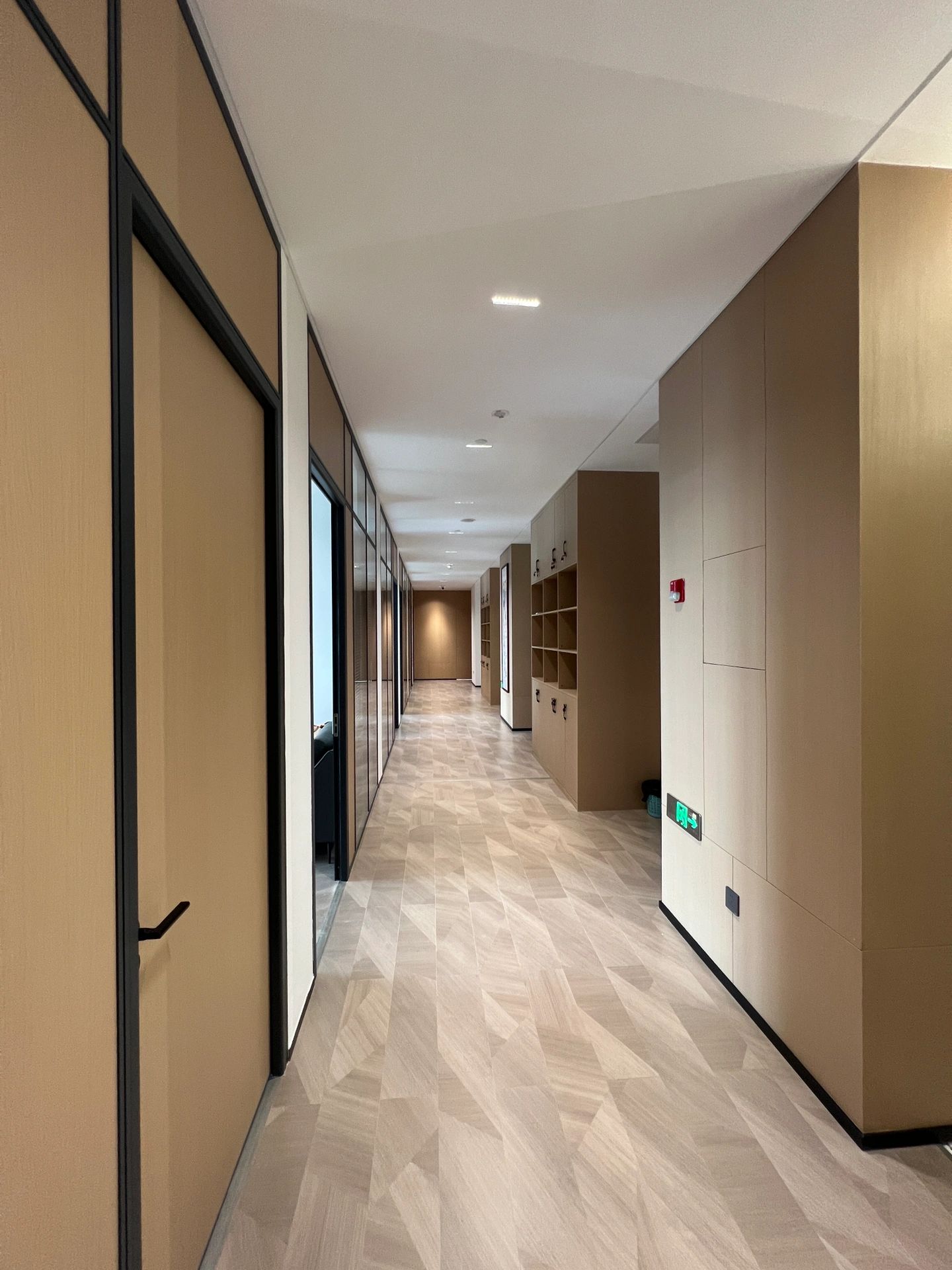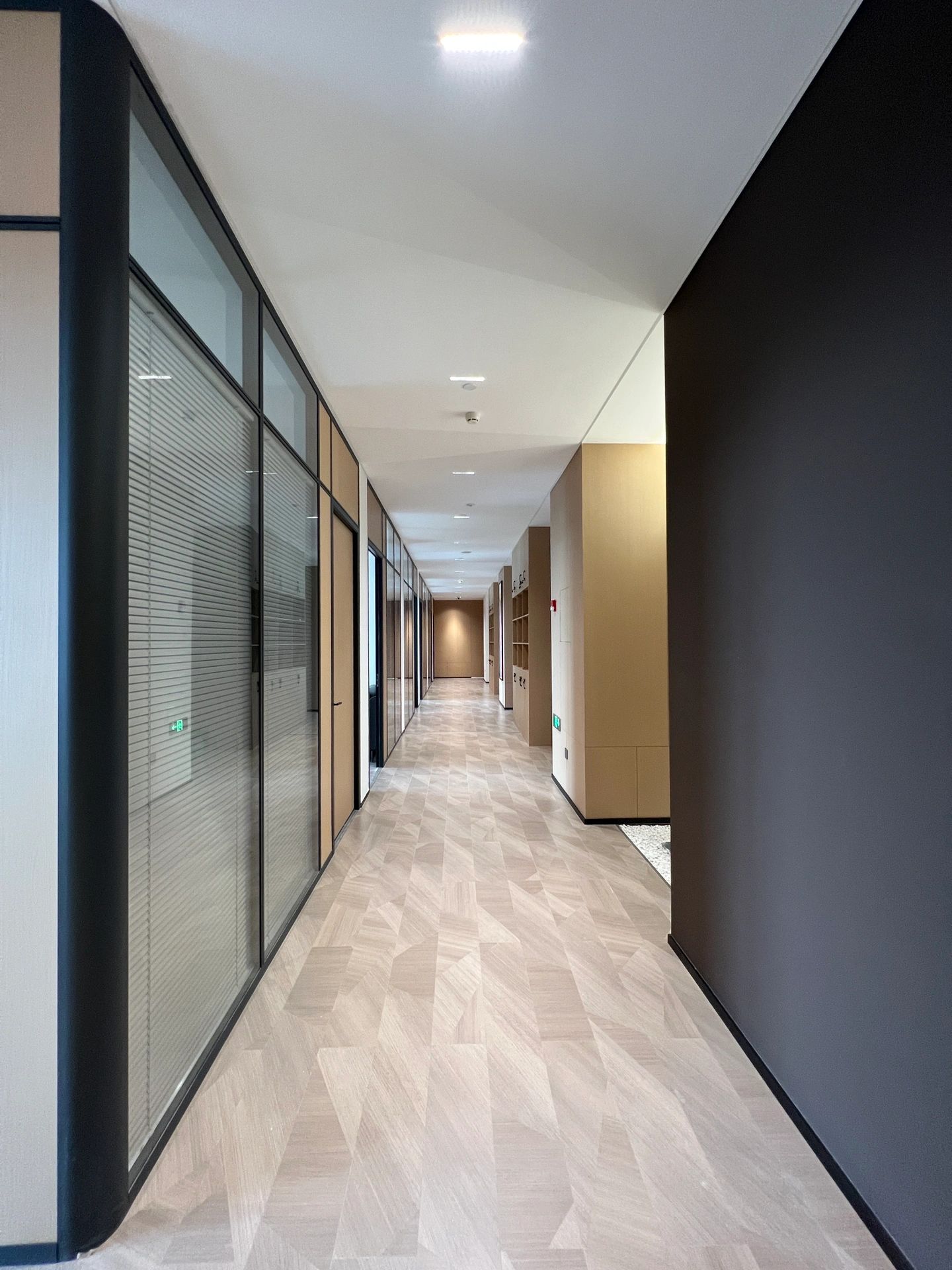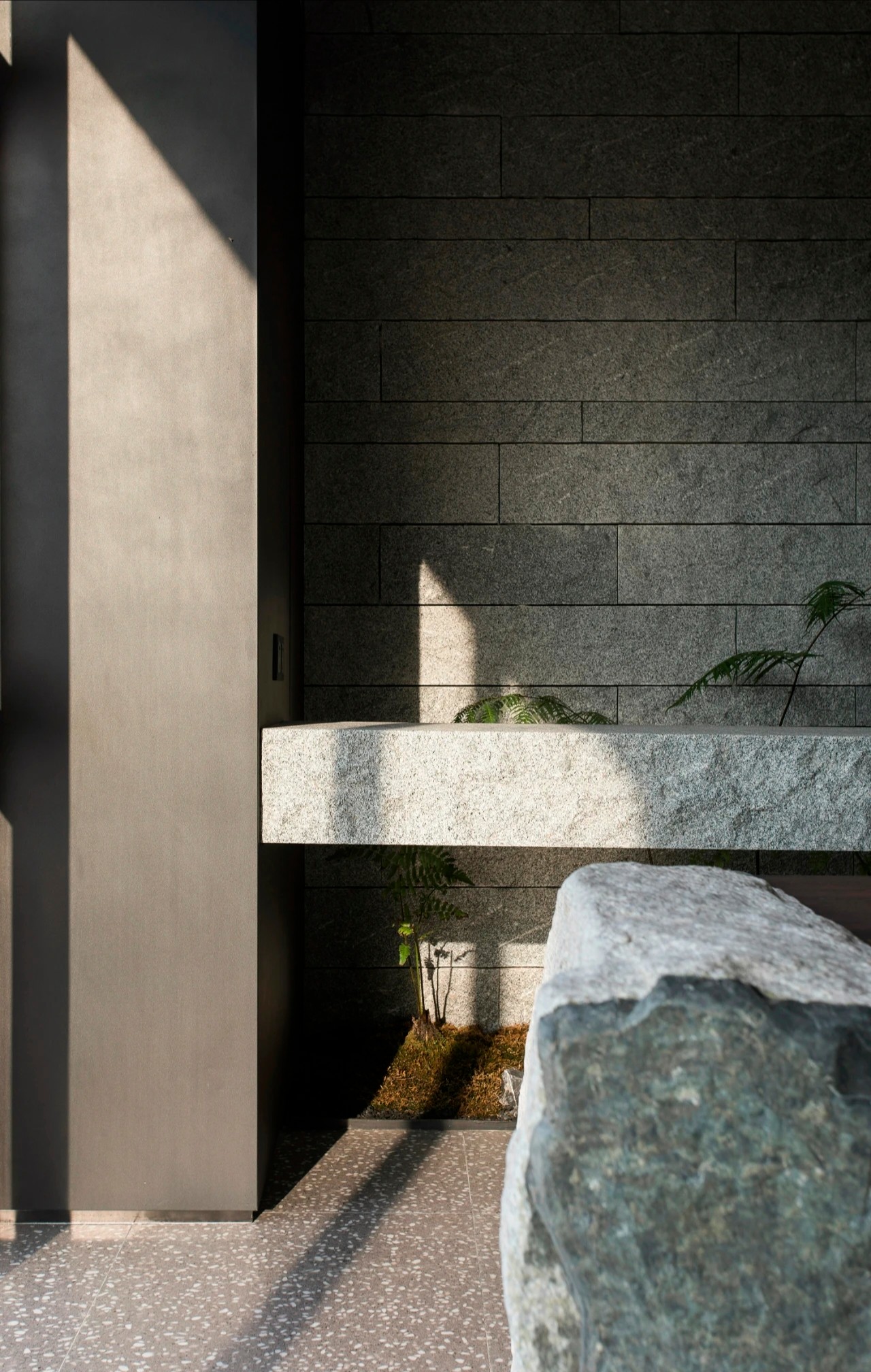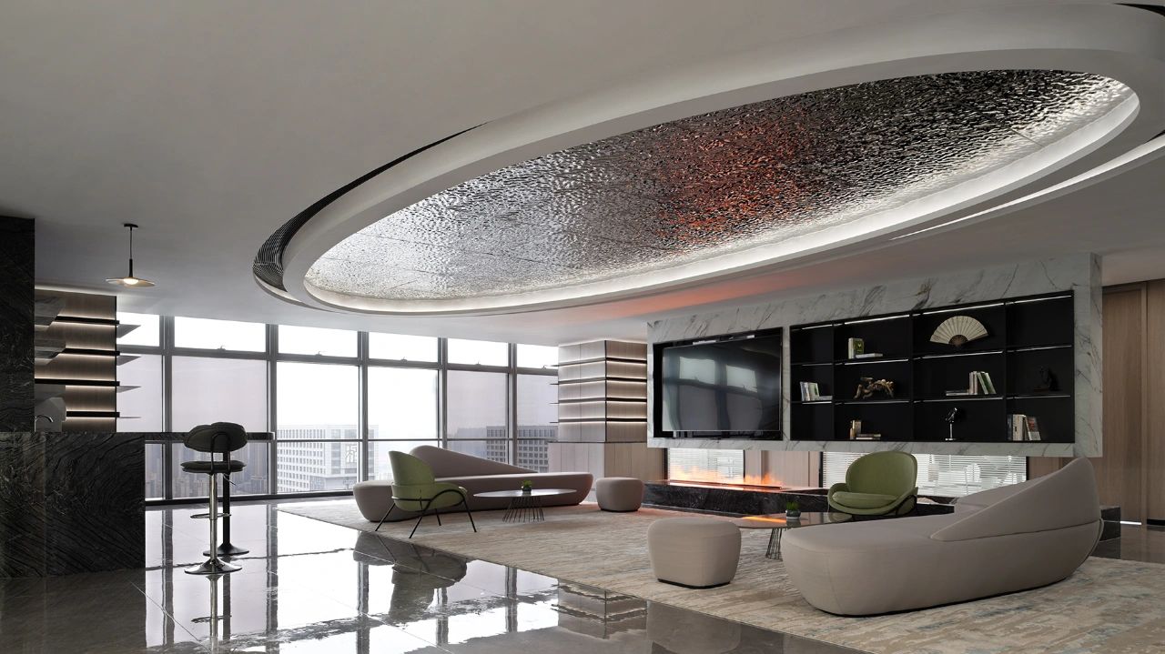 主体黑色调的表达更好地将视觉引到室外的美景,更好的与自然进行互动。钢板的硬朗包裹着泥土的松润,体块的互动关系中以材质作为媒介,材质之间的对话让空间的质感显得更加饱满,三角形交叠的天花和地板三角的分割线,是空间的延展,更似品牌的延展。