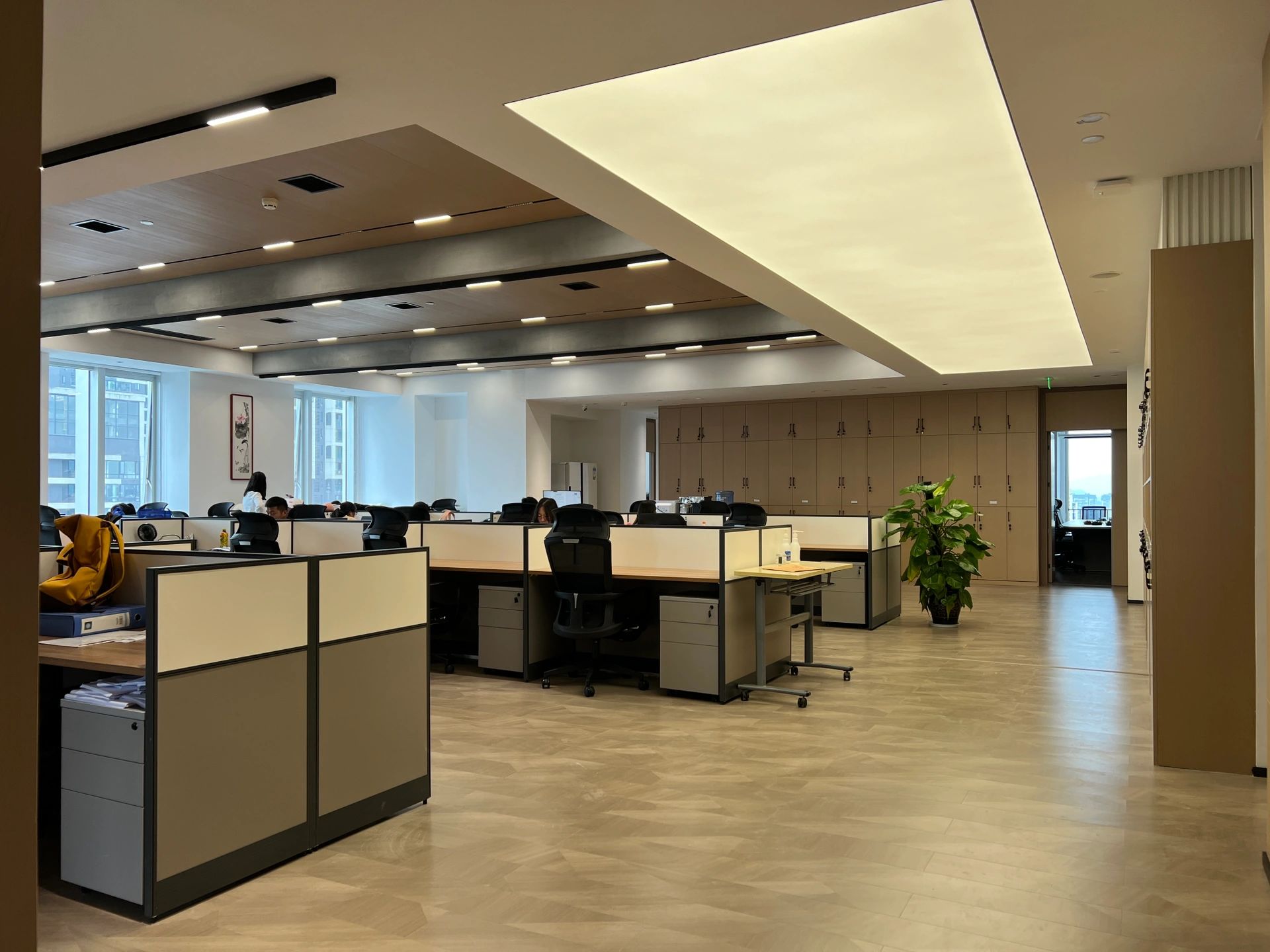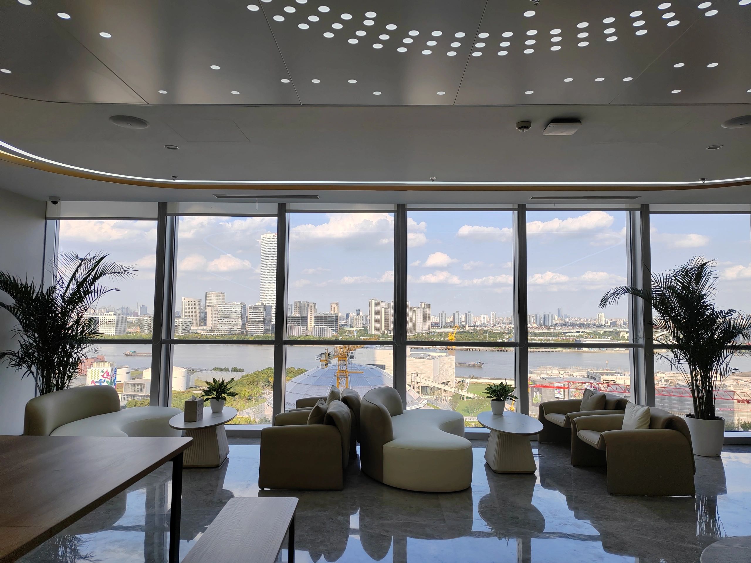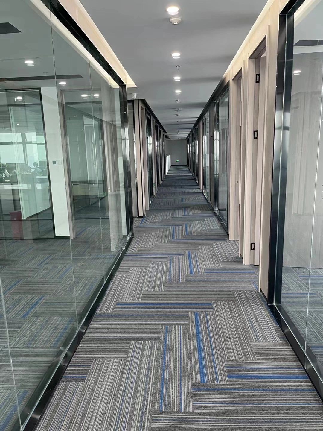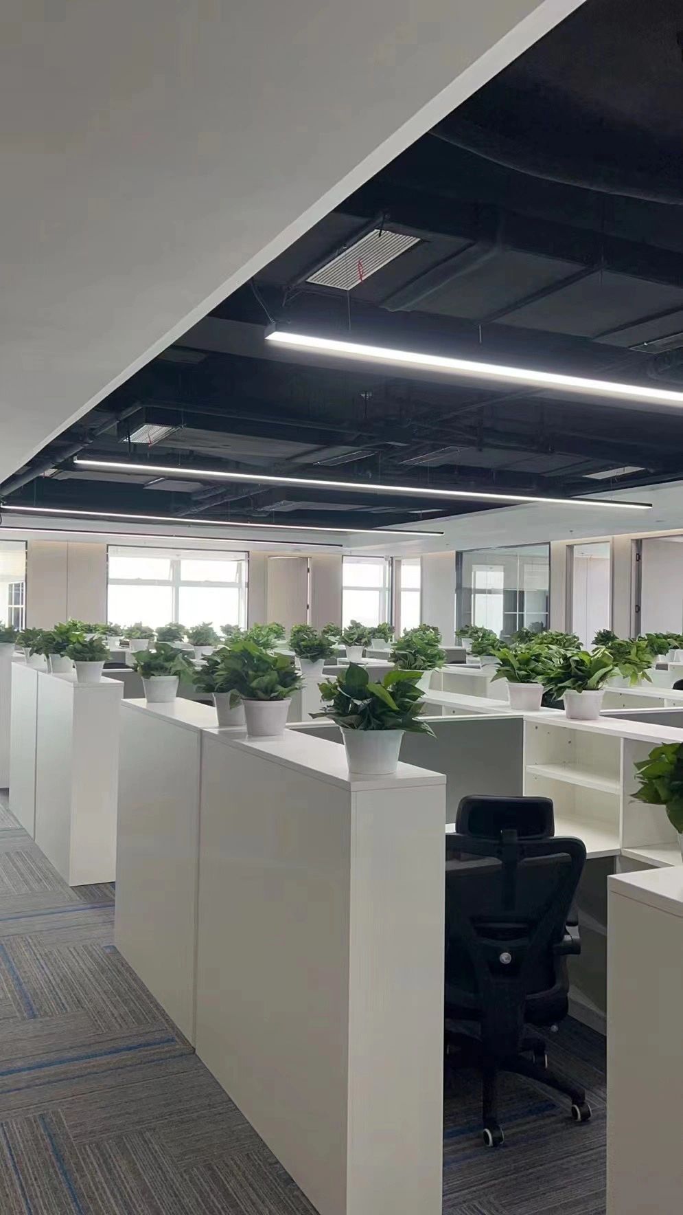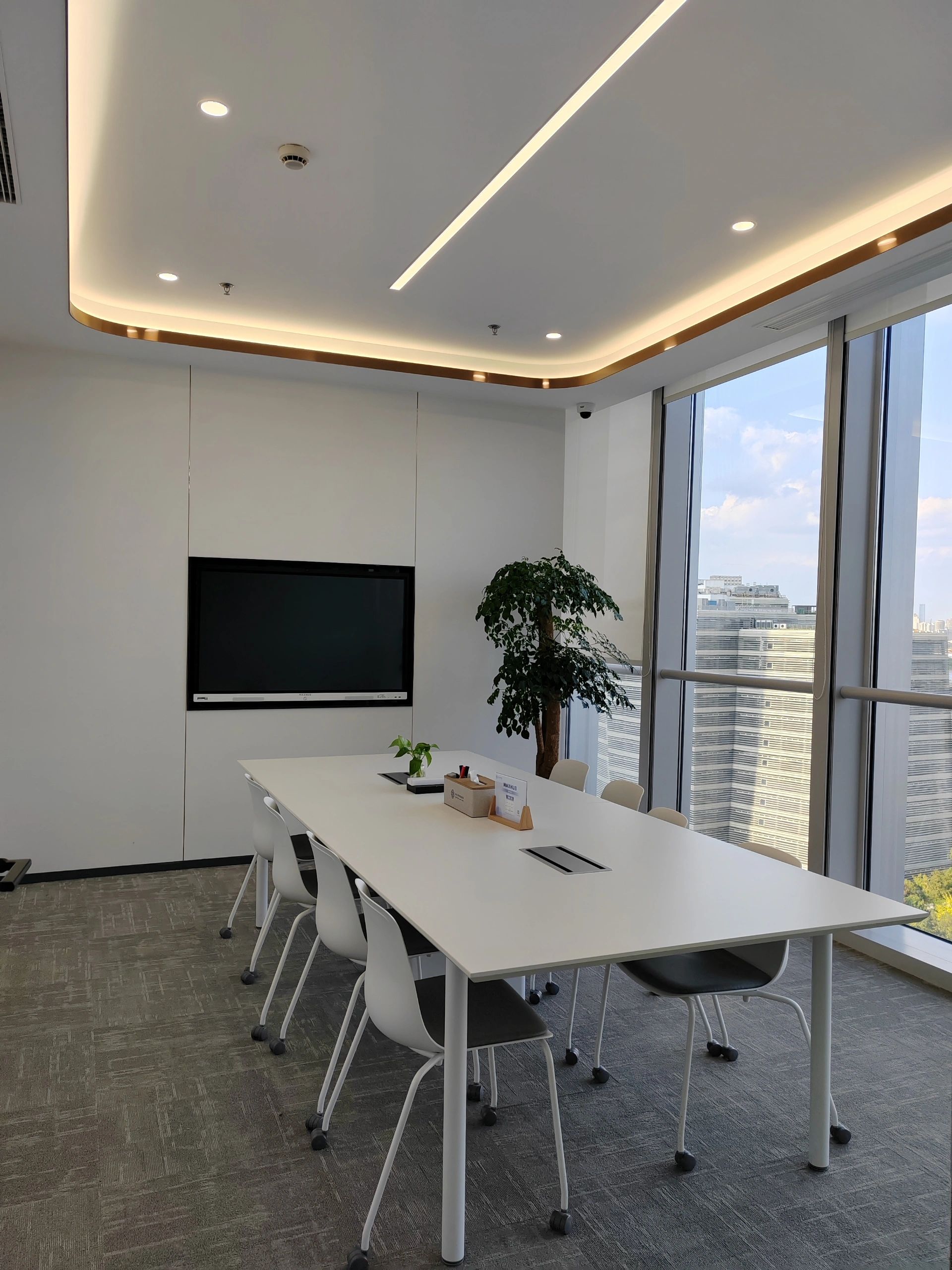 主体黑色调的表达更好地将视觉引到室外的美景,更好的与自然进行互动。钢板的硬朗包裹着泥土的松润,体块的互动关系中以材质作为媒介,材质之间的对话让空间的质感显得更加饱满,三角形交叠的天花和地板三角的分割线,是空间的延展,更似品牌的延展。