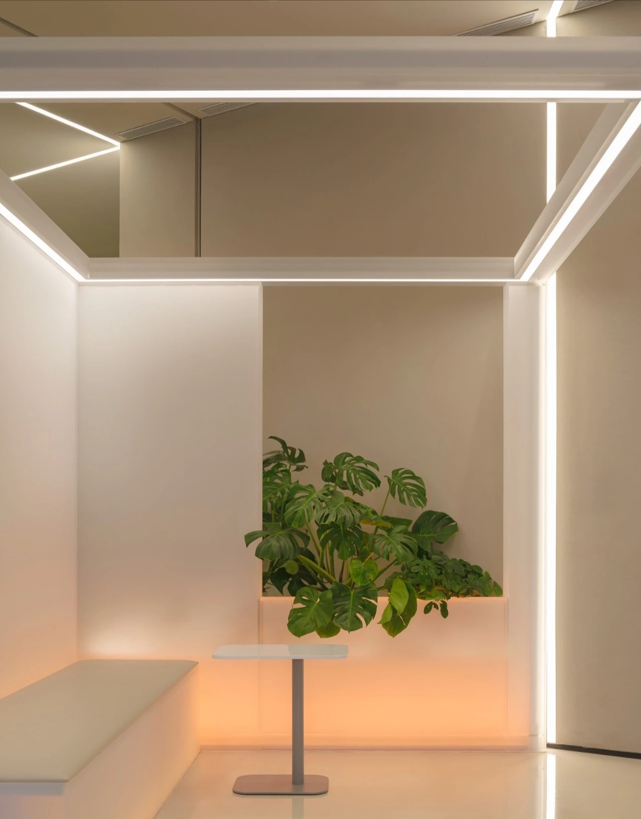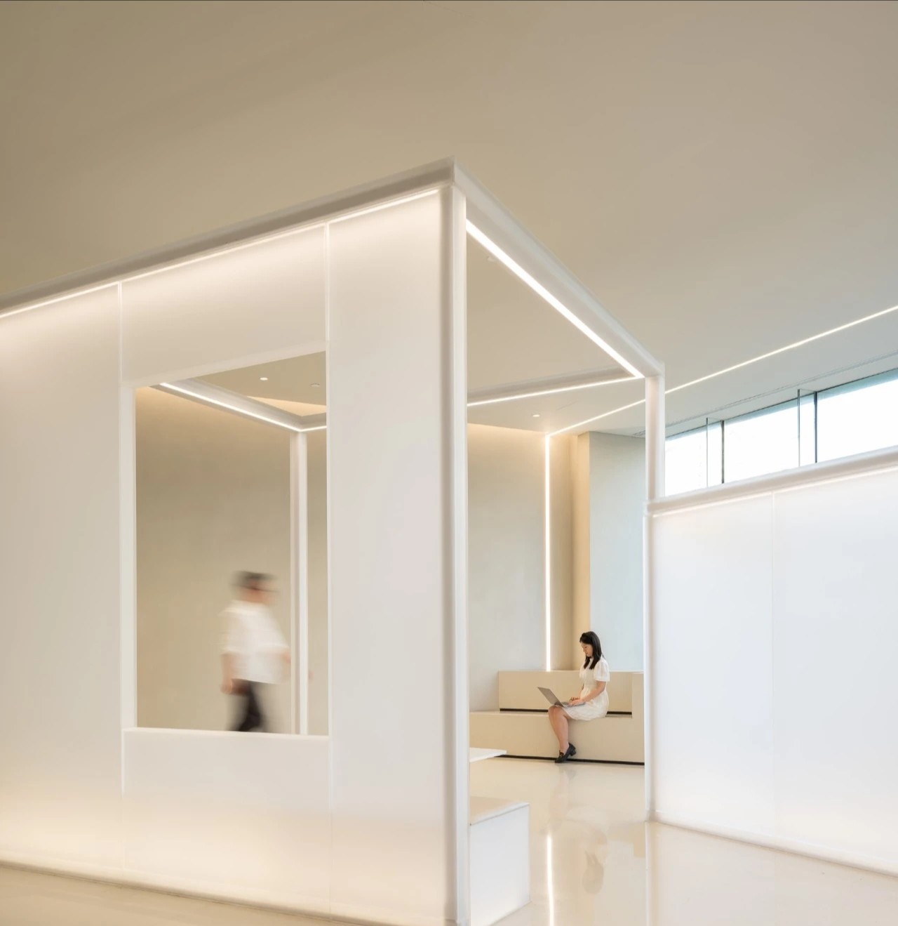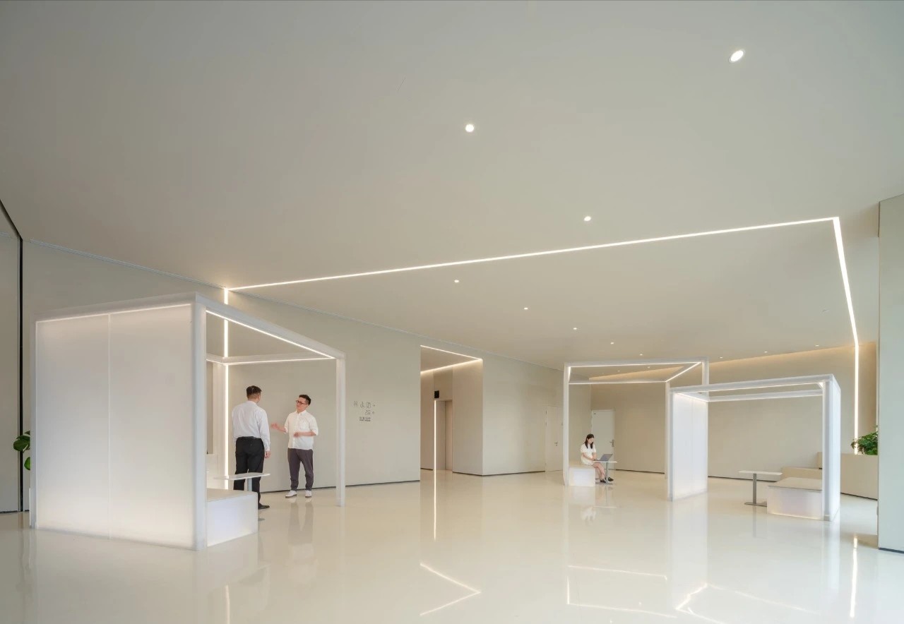 空间塑造从大堂一维的简洁线条灯开始,如同最初的探索轨迹,逐渐拓展至二维的规整平面,再到三维的立体方盒子造型,层层递进,最终迈向多维空间的无限可能,呈现出多维空间般的奇幻体验,人们仿佛置身于不断变化和拓展的神秘维度之中。