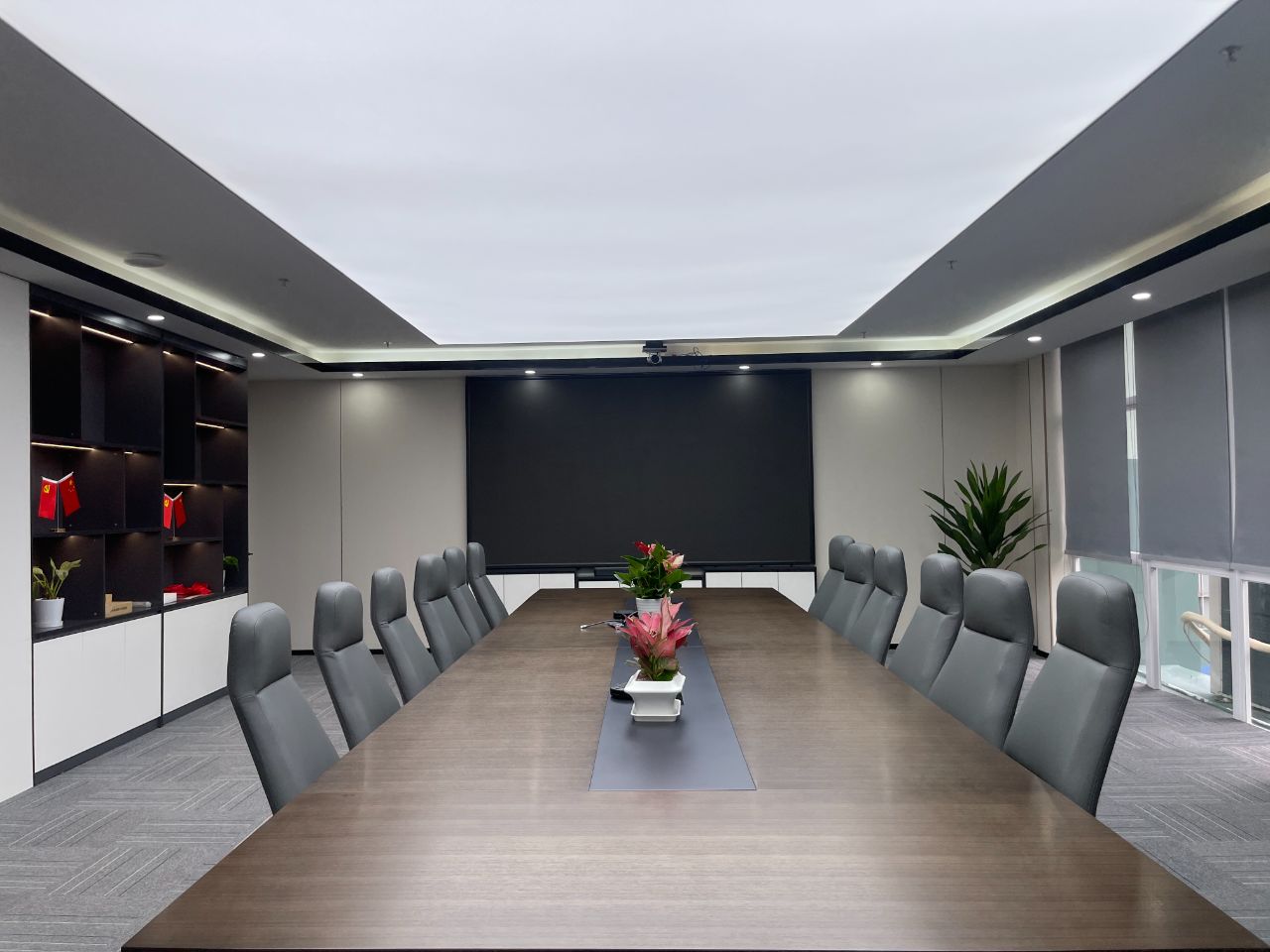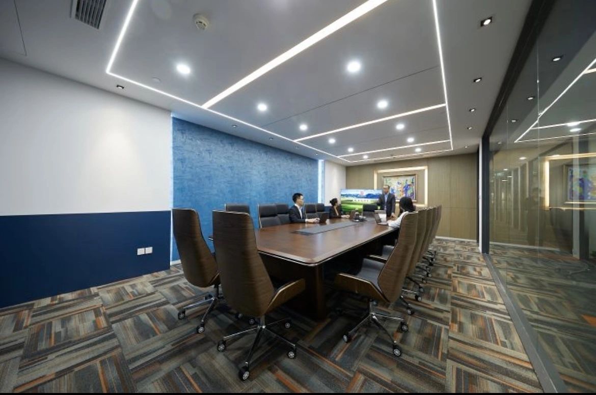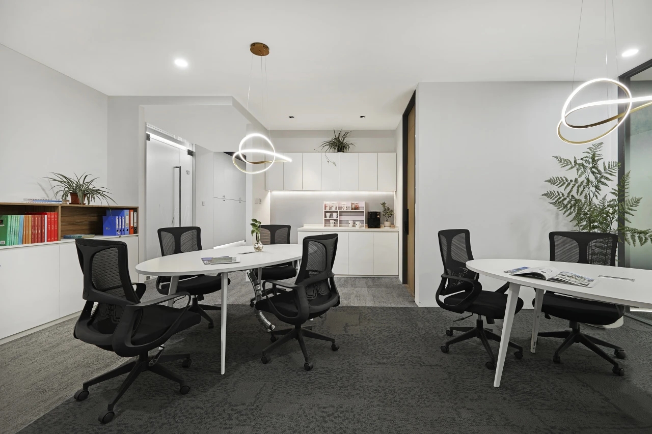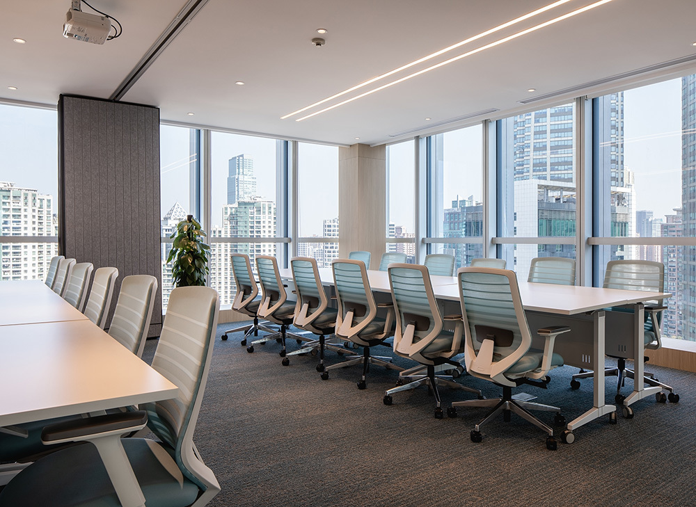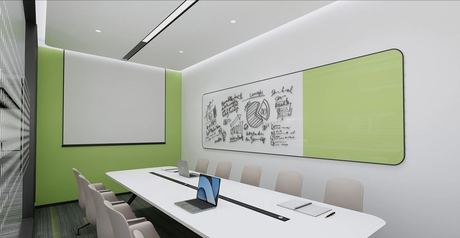 洽谈室大量使用了苹果绿与白色穿插,营造一种小清新的风格;除了背景投影,侧墙设计了一个半绿半白的背漆玻璃,可作为书写墙;照明上选用了条形灯,相比筒灯,光线更加均匀,提升空间舒适度。