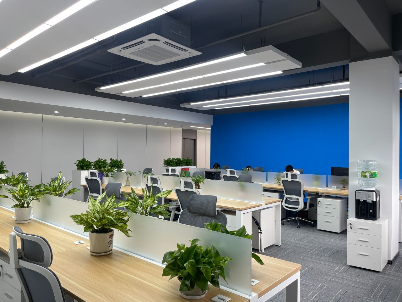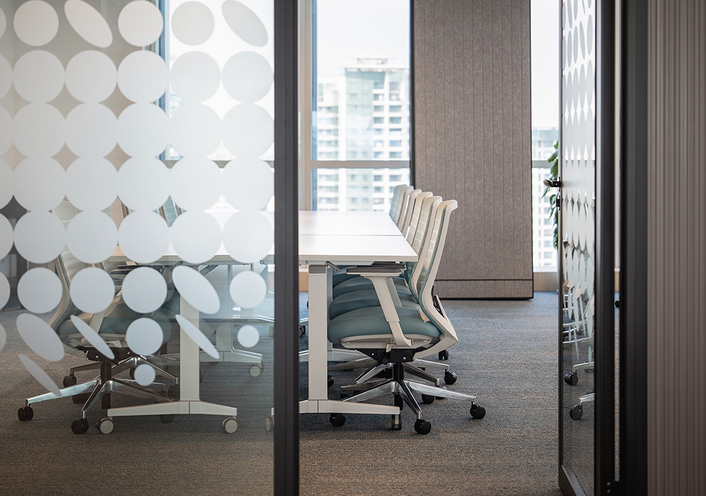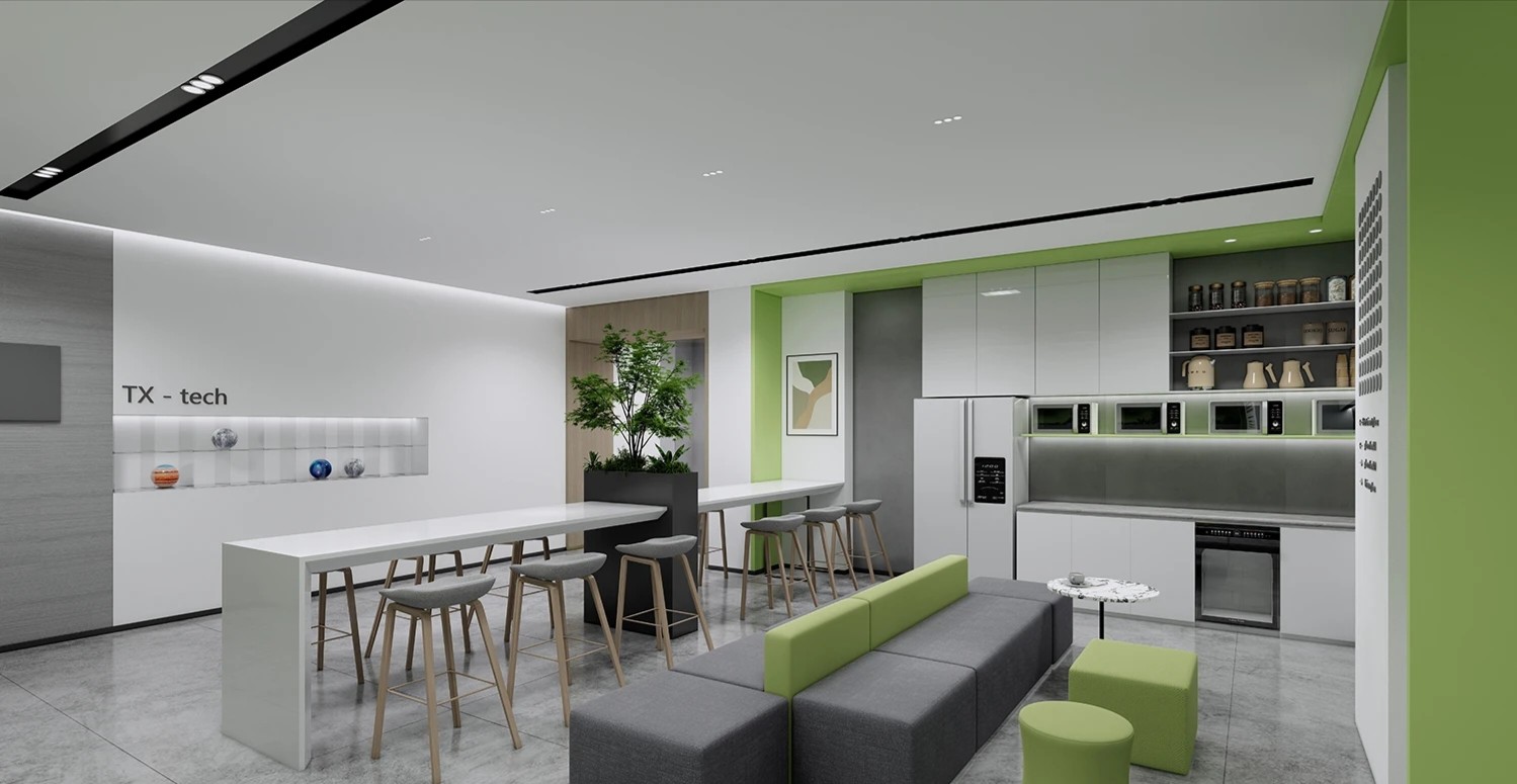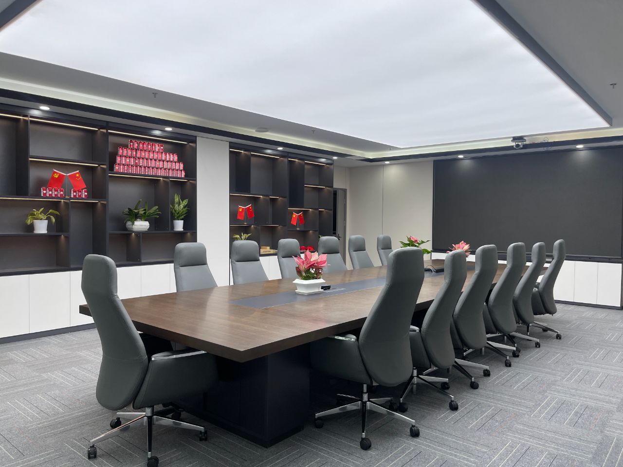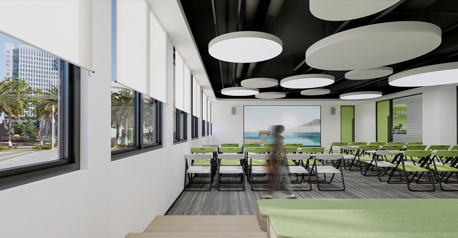 洽谈室大量使用了苹果绿与白色穿插,营造一种小清新的风格;除了背景投影,侧墙设计了一个半绿半白的背漆玻璃,可作为书写墙;照明上选用了条形灯,相比筒灯,光线更加均匀,提升空间舒适度。