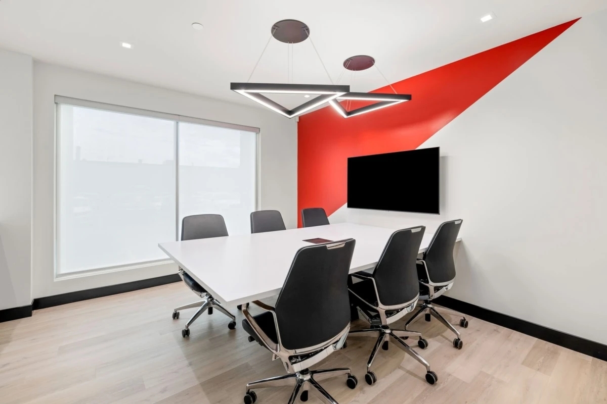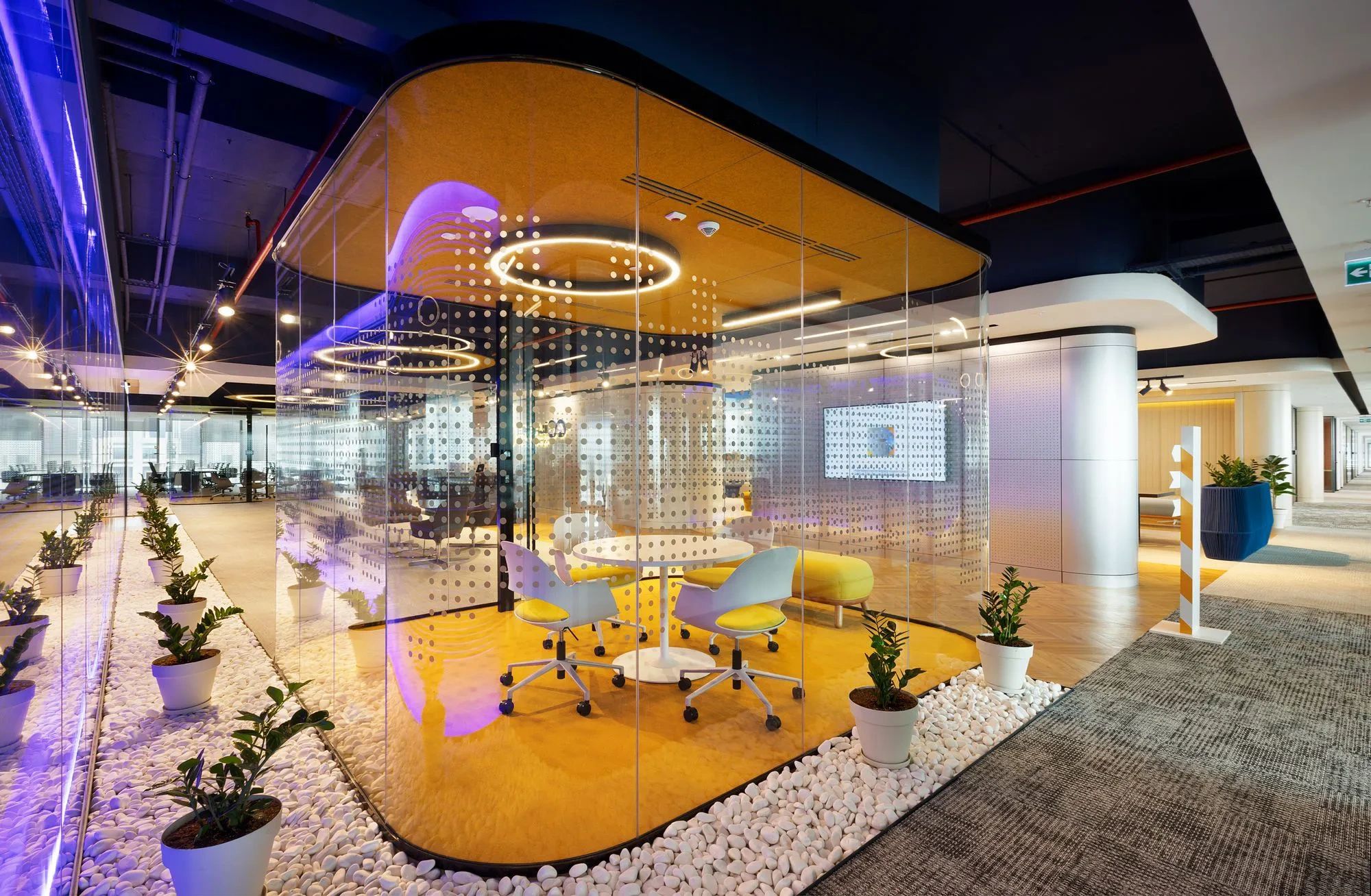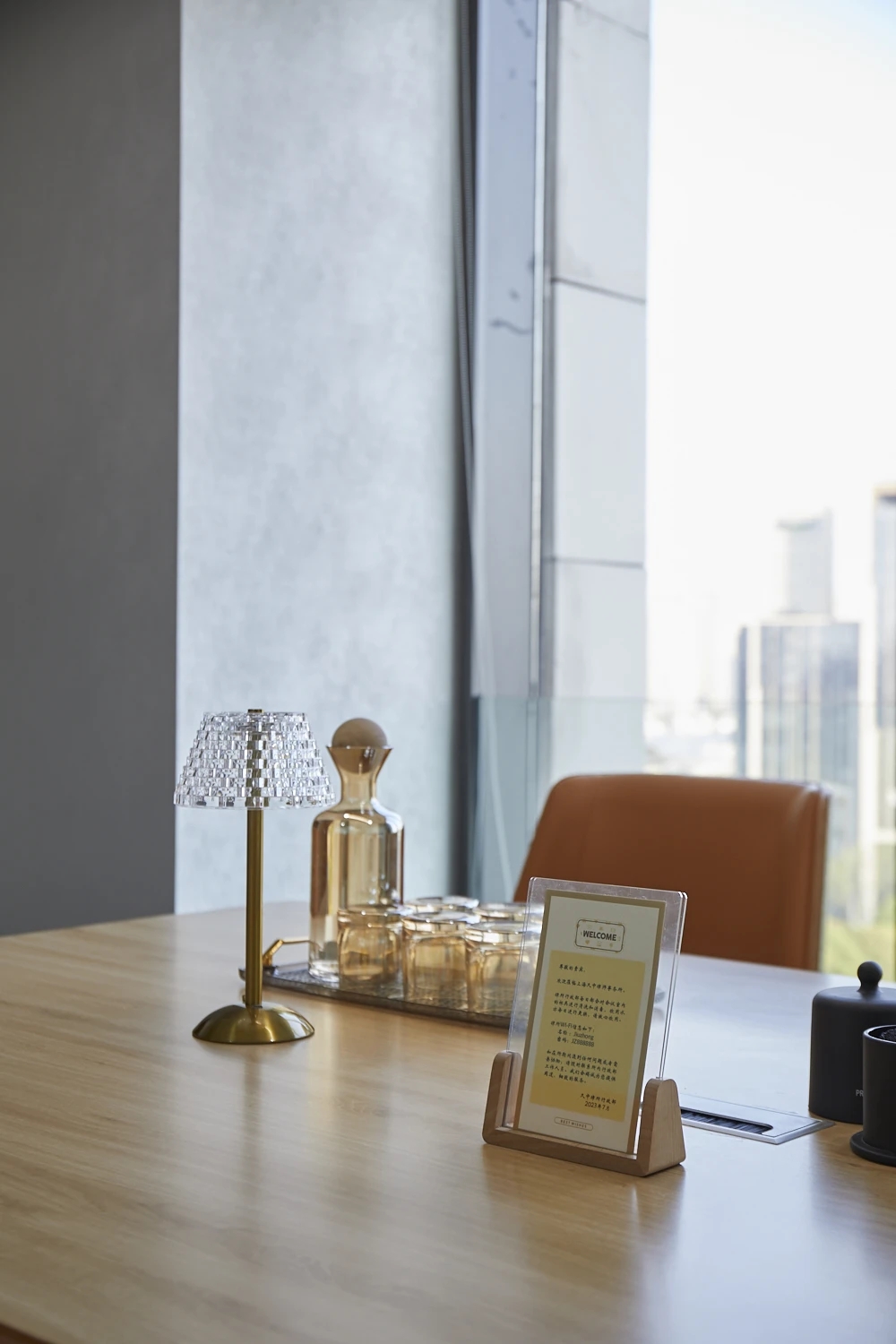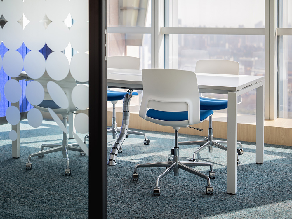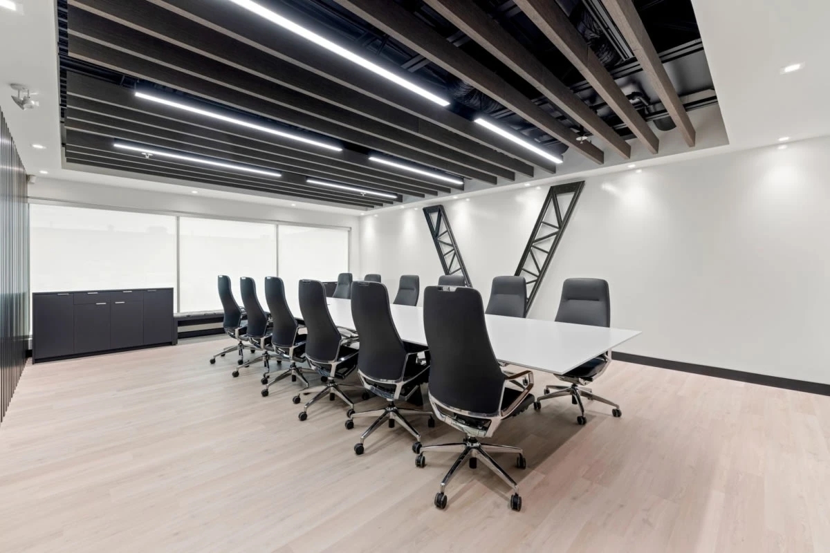 洽谈室大量使用了苹果绿与白色穿插,营造一种小清新的风格;除了背景投影,侧墙设计了一个半绿半白的背漆玻璃,可作为书写墙;照明上选用了条形灯,相比筒灯,光线更加均匀,提升空间舒适度。