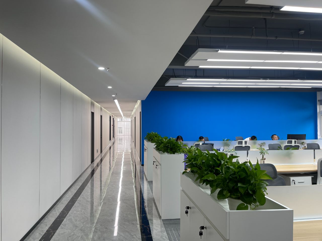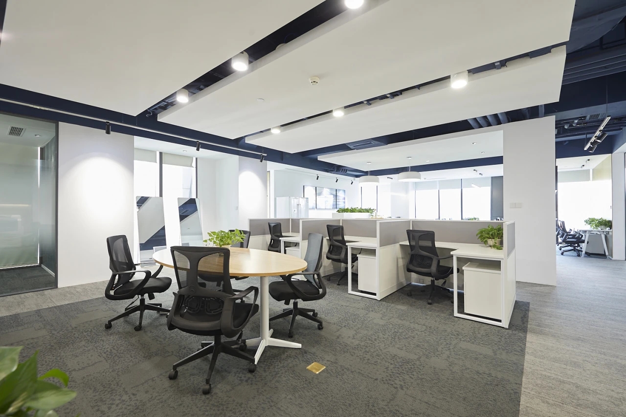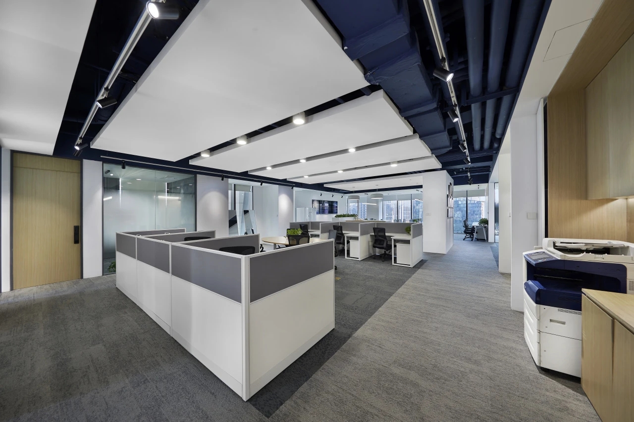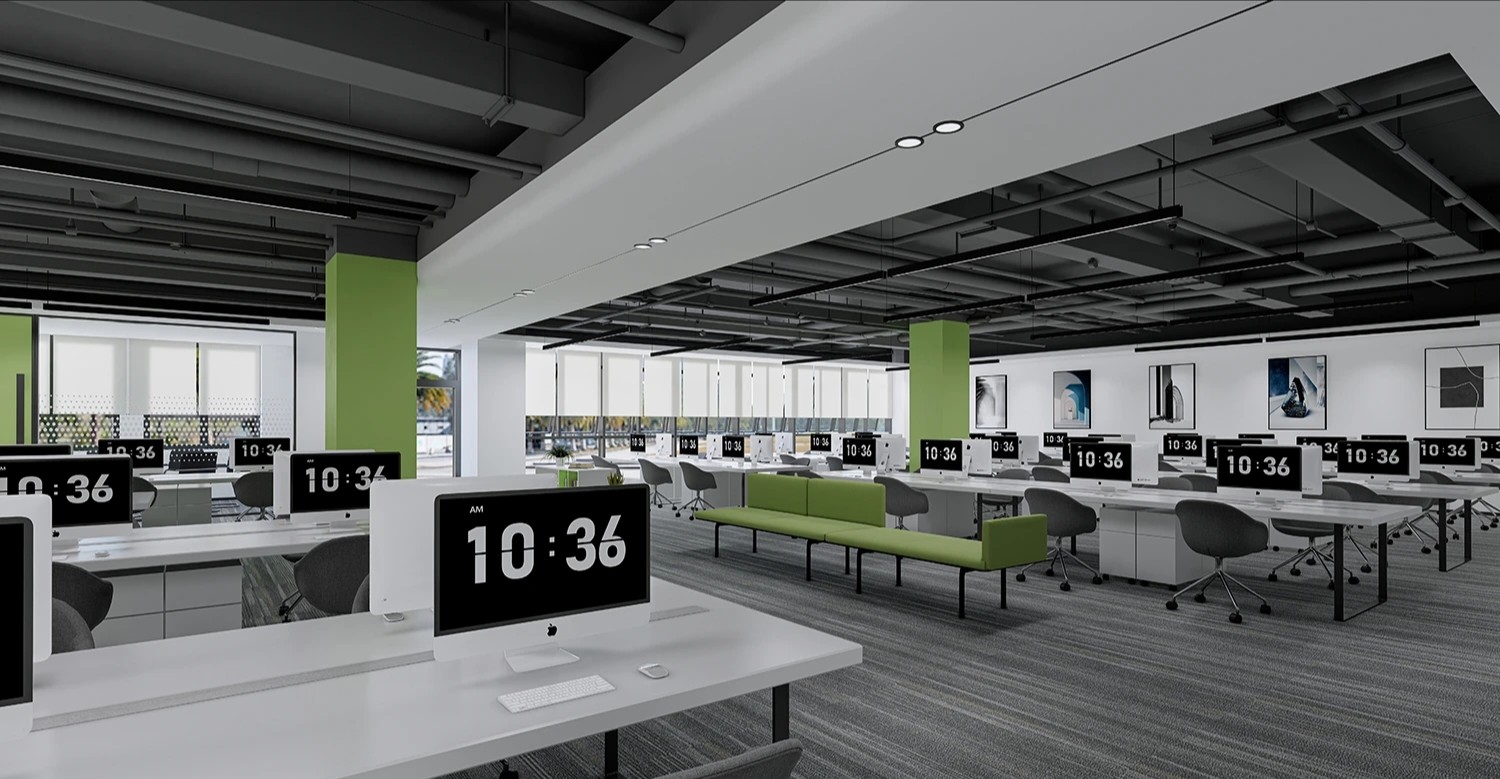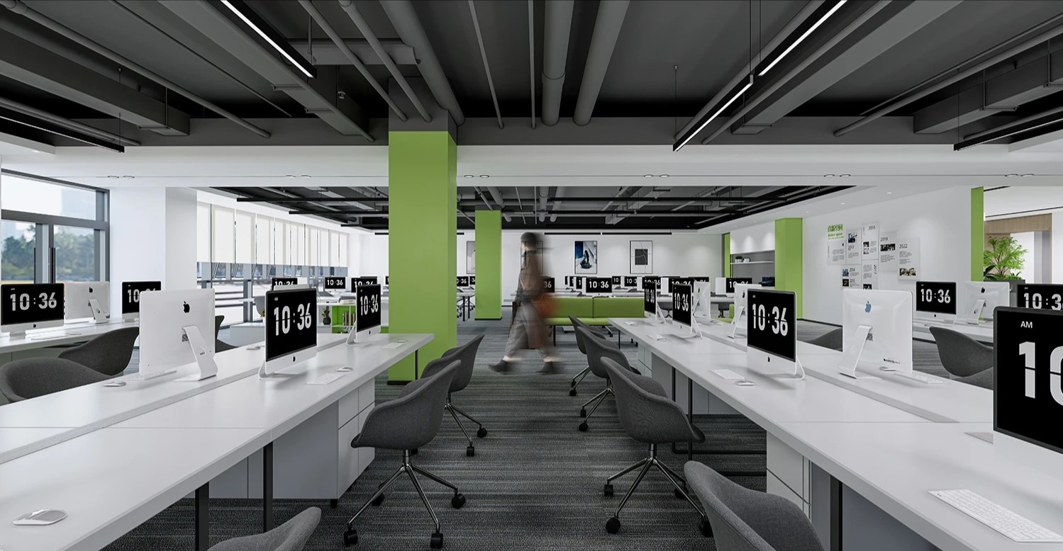 设计上,秉承简约的设计手法,顶面采用裸顶喷灰的处理方式,但在过道上做了白色的吊顶,提升空间的纵深感的同时对空间进行分割,增加层次感;地面统一采用灰色条纹地毯,耐脏舒适,减少噪音;立柱、公共座椅等局部区域采用苹果绿装饰,在黑白灰的简约冷静中,增加几分灵动跳跃之感。