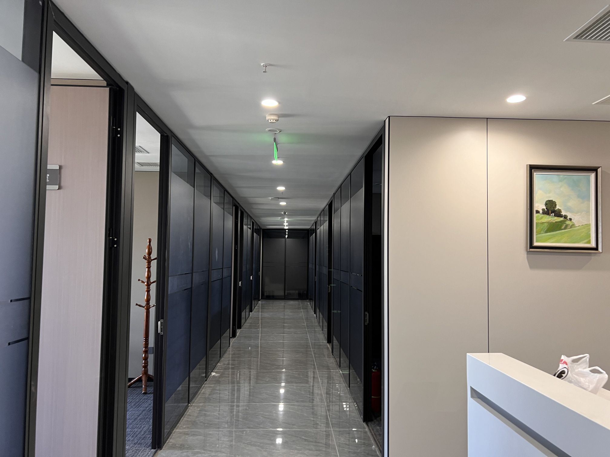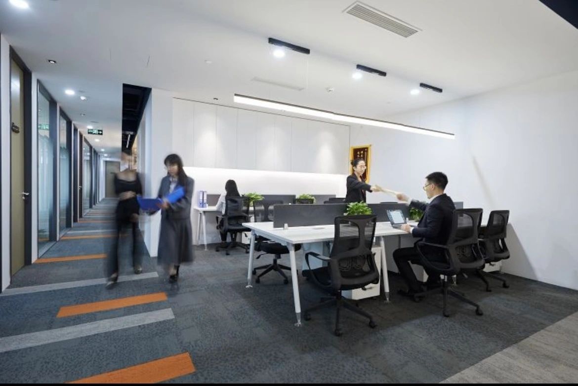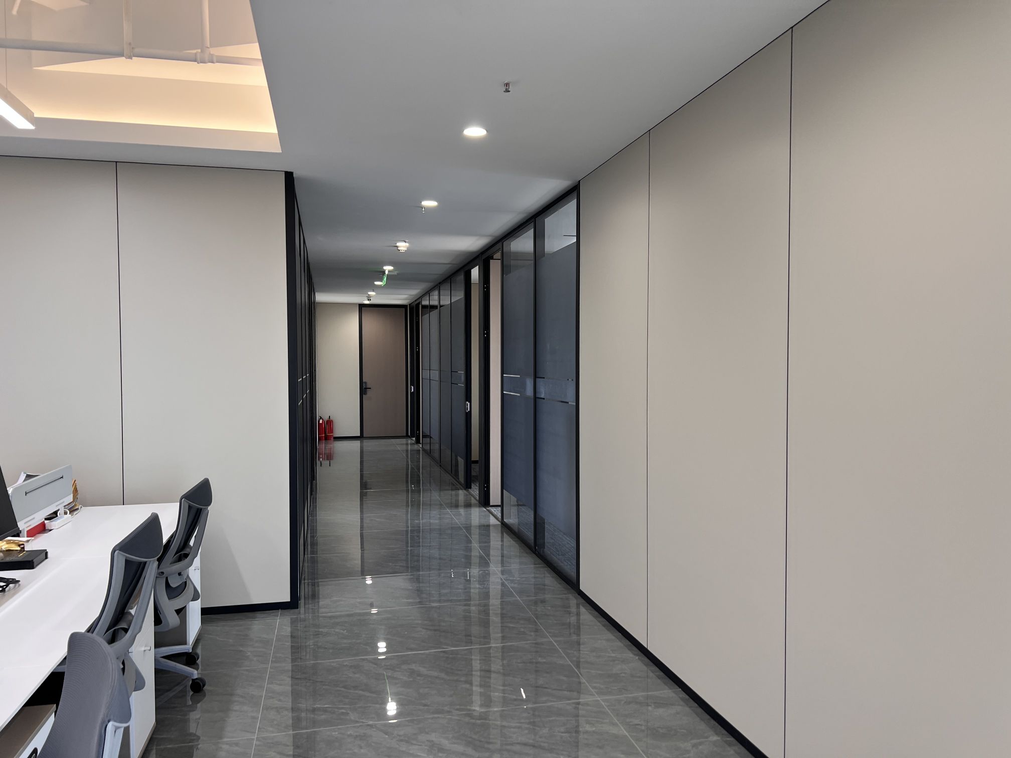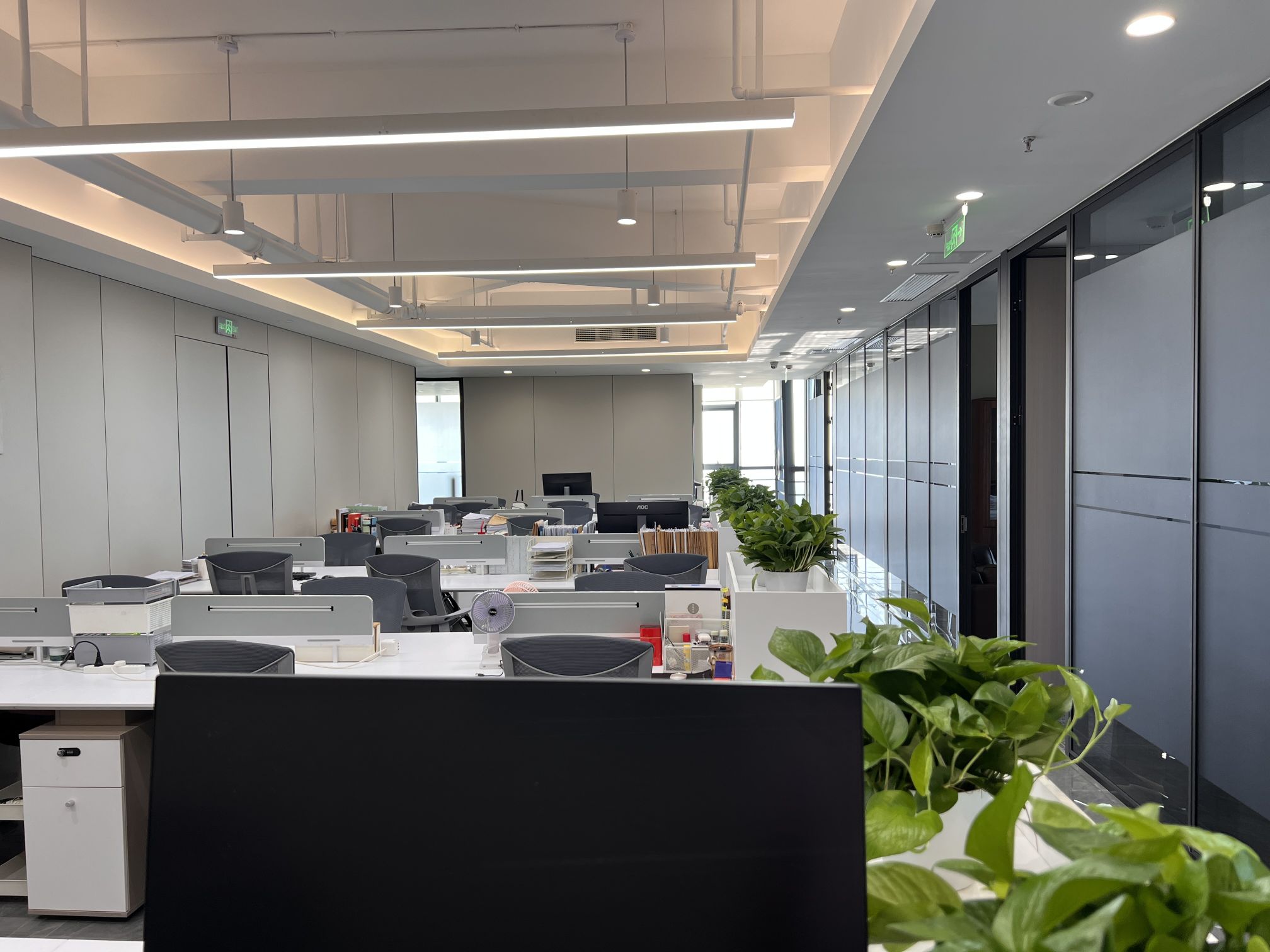 设计上,秉承简约的设计手法,顶面采用裸顶喷灰的处理方式,但在过道上做了白色的吊顶,提升空间的纵深感的同时对空间进行分割,增加层次感;地面统一采用灰色条纹地毯,耐脏舒适,减少噪音;立柱、公共座椅等局部区域采用苹果绿装饰,在黑白灰的简约冷静中,增加几分灵动跳跃之感。