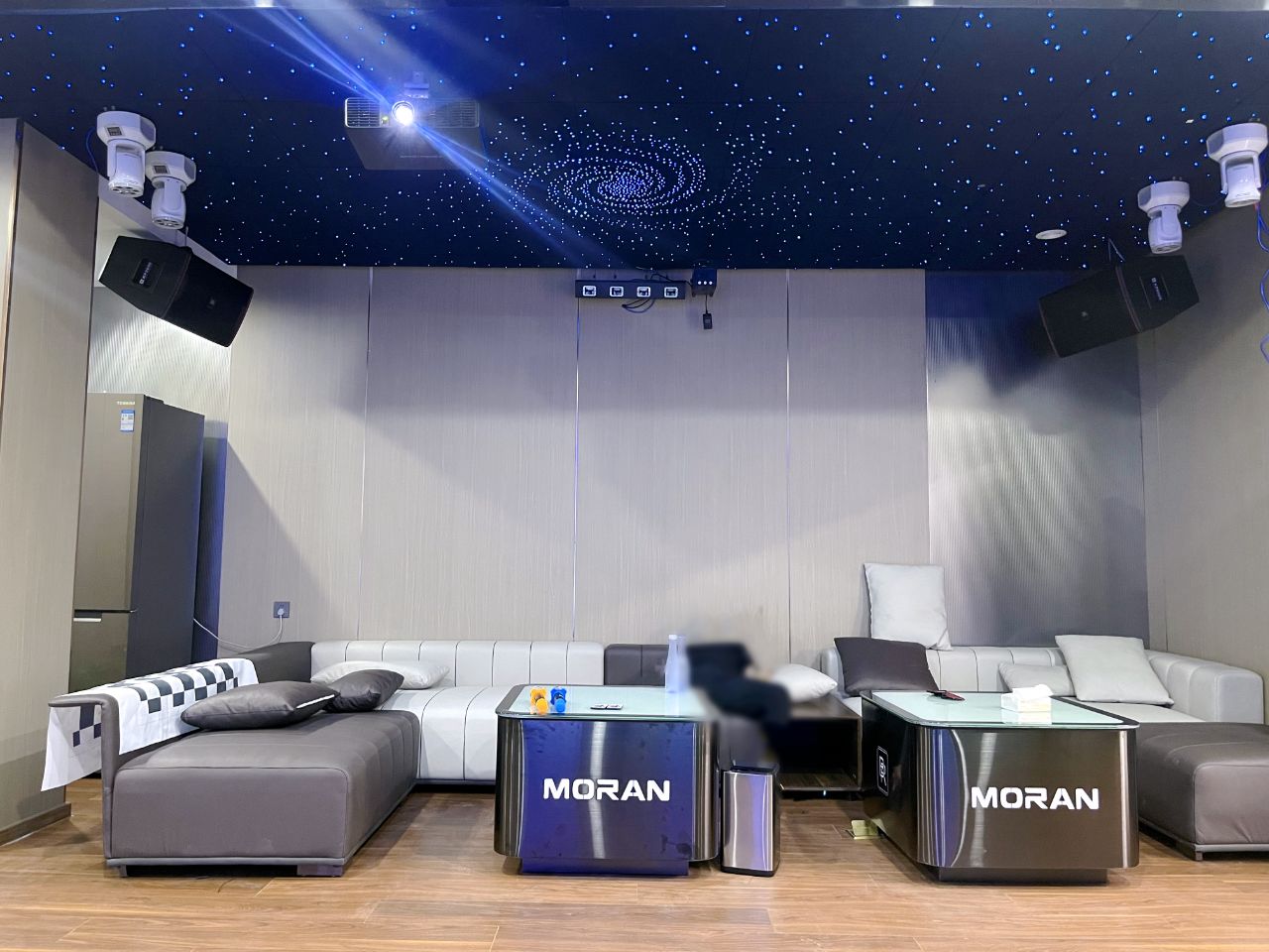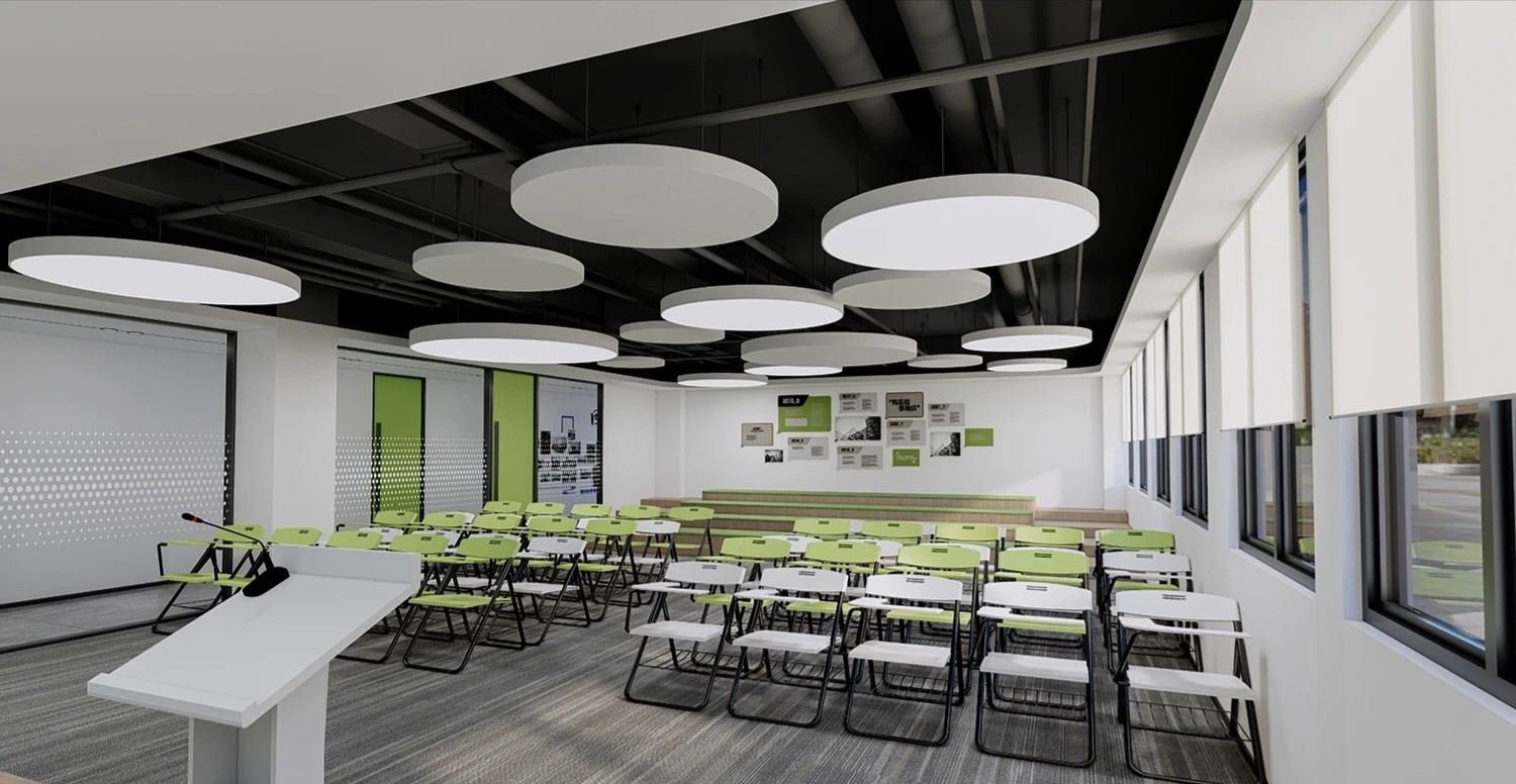 路演室60平左右,主要作为网络直播带货以及客户、商家集会宣讲使用。后排设计了一个阶梯式的看台,提升空间的实用性;照明上,采取了圆形灯膜的布局处理,大小排布,让空间更生动。